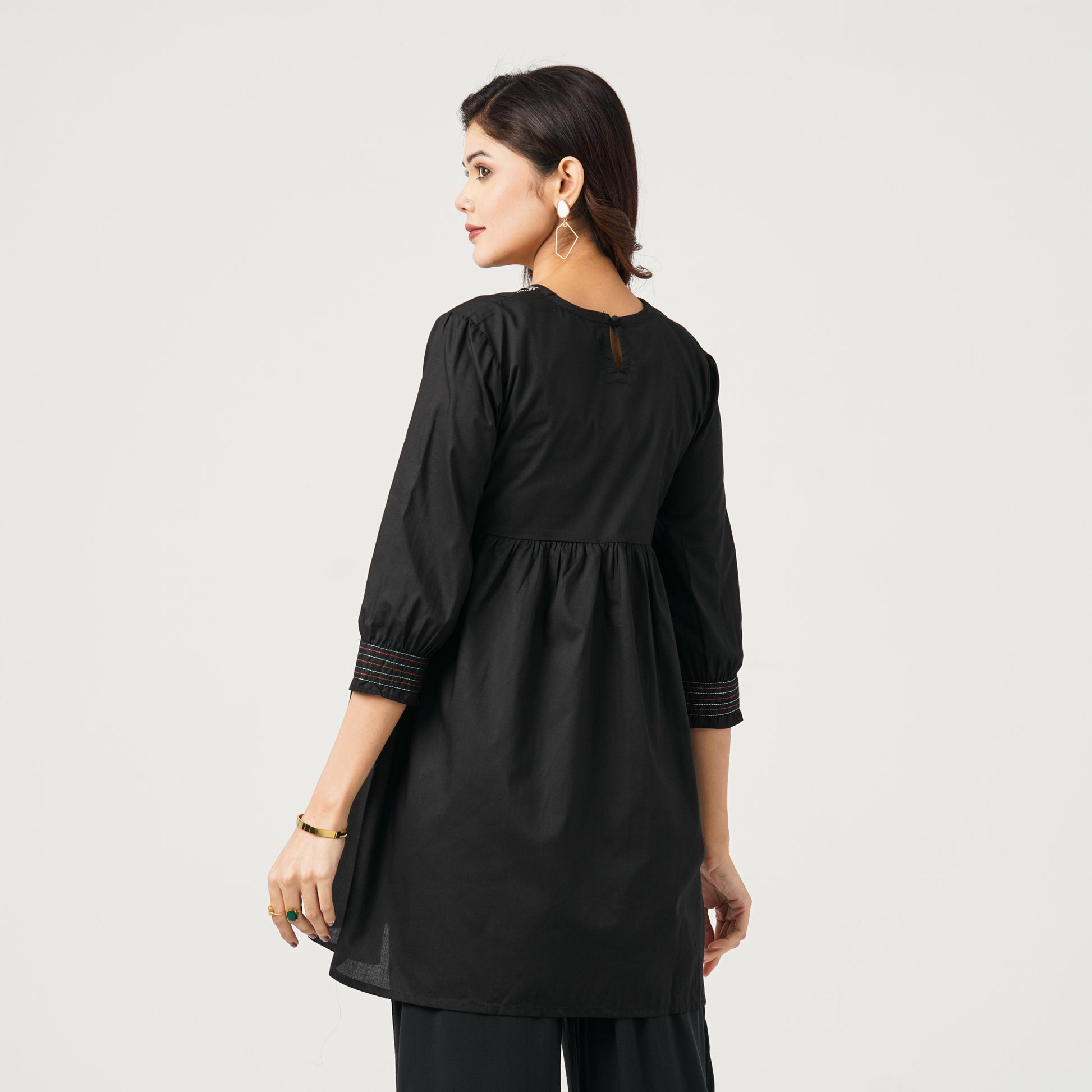 This women’s black tunic is crafted from soft cotton with a half-waistline gather for a flattering fit. It features bold abstract floral embroidery and gather-run stitched cuffs on the sleeves, offering a stylish and comfortable look for casual wear.