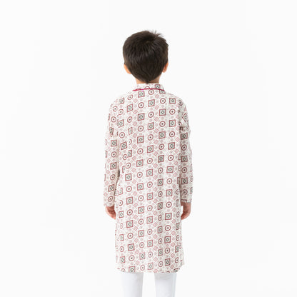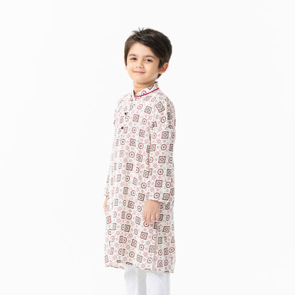 This boys’ basic Panjabi features an all-over print, giving it a fun and traditional look. The design is enhanced with metal show buttons on the placket for added style. Made from soft cotton fabric, it ensures comfort while maintaining a slim fit. Ideal for festive occasions or cultural events.