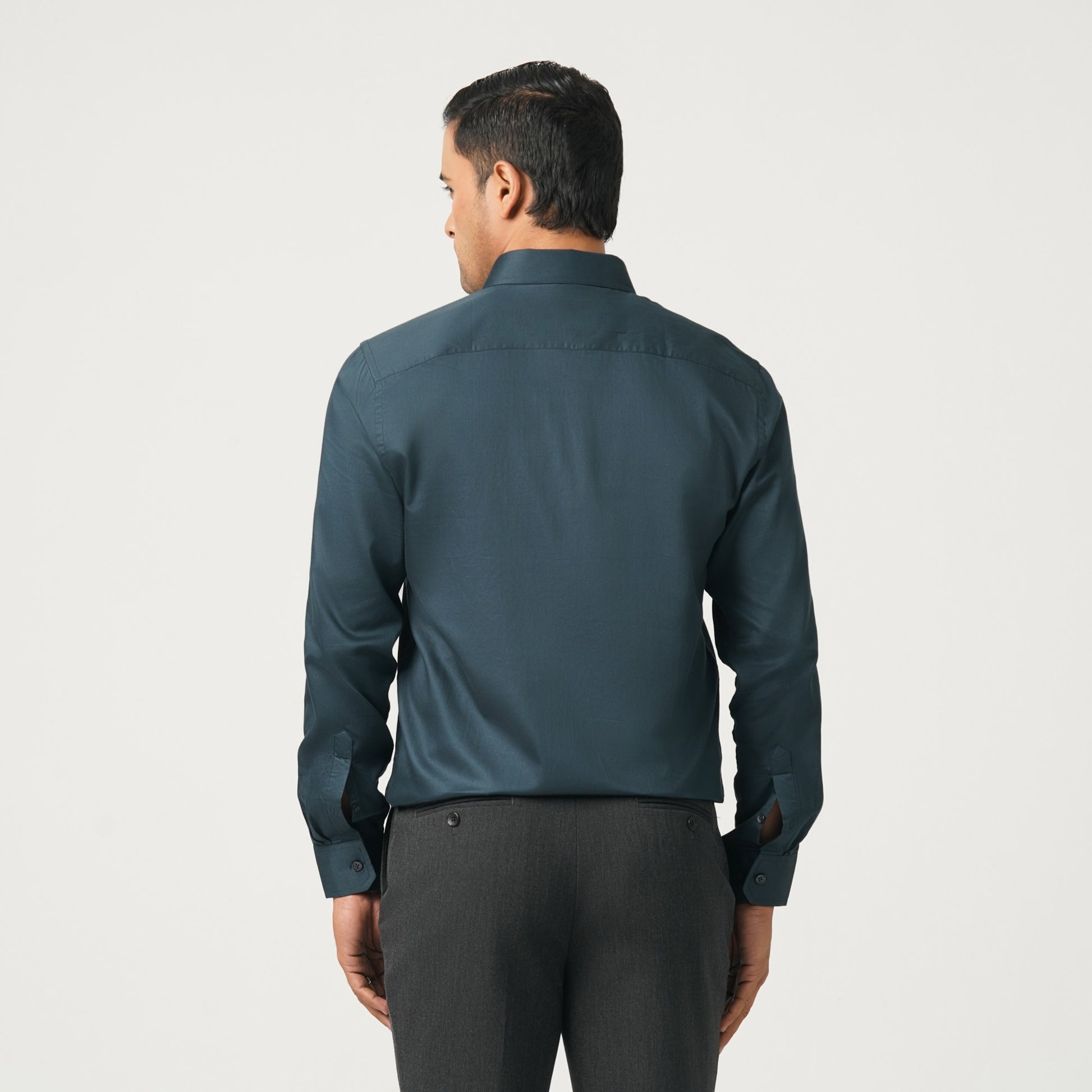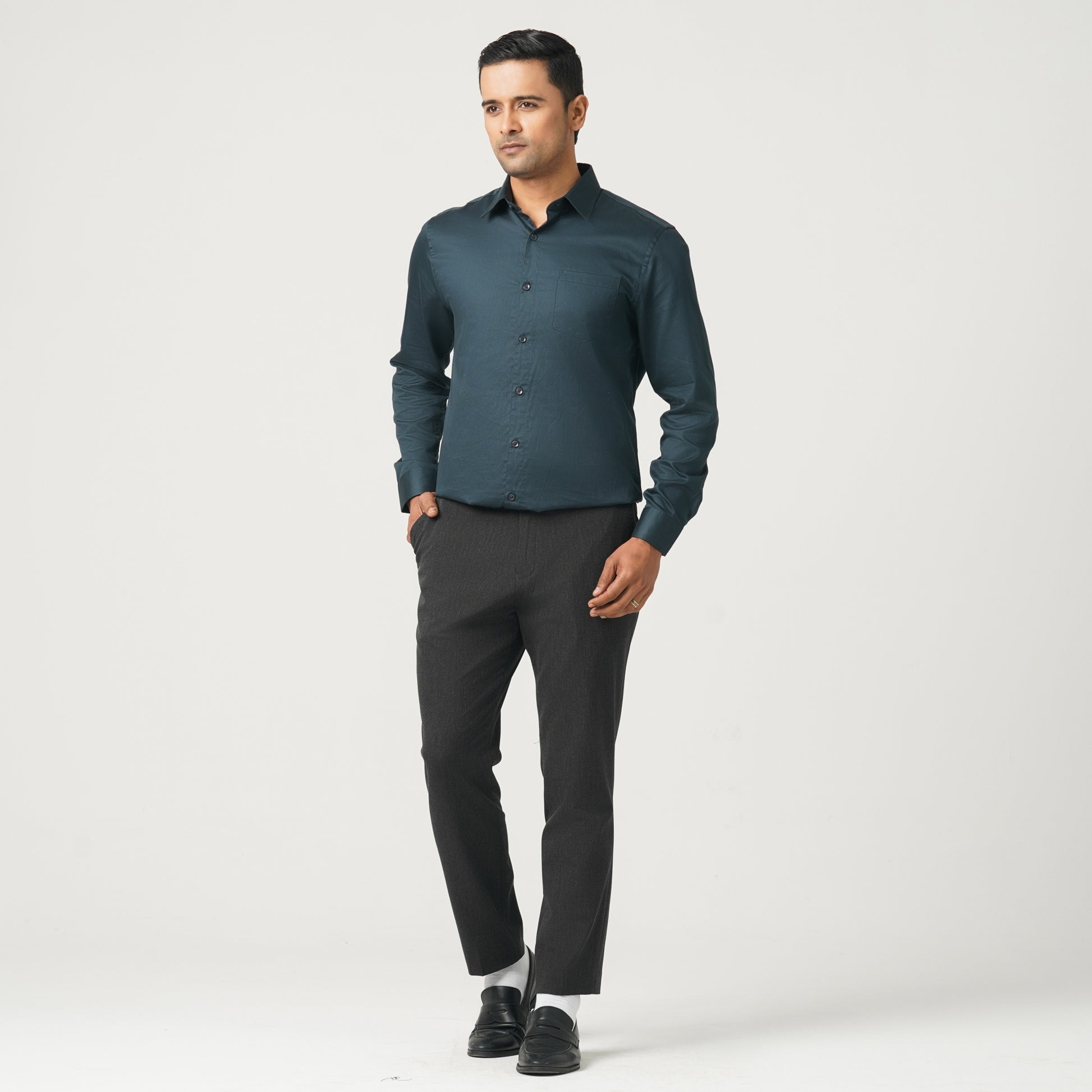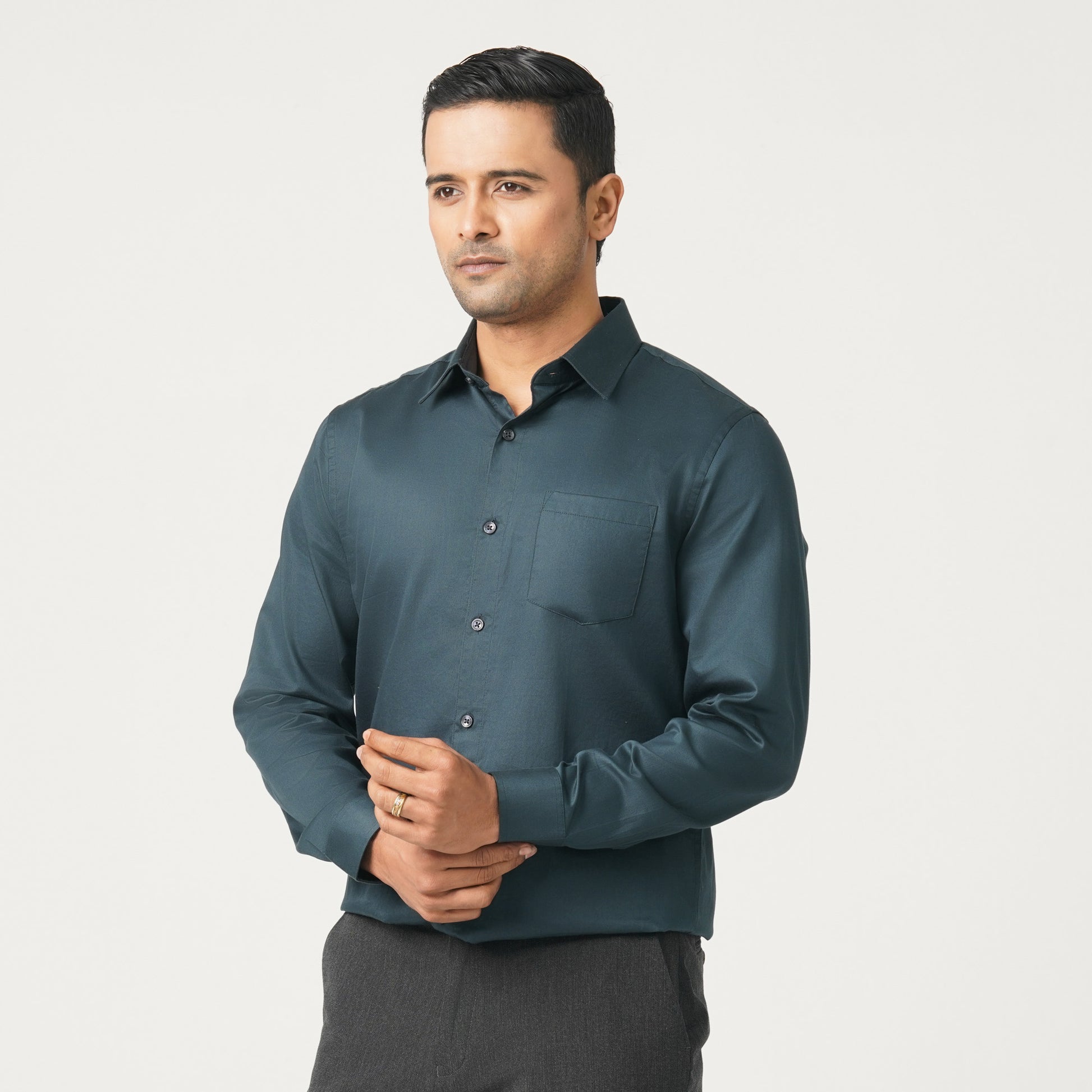 This men’s dark green formal shirt features a regular fit with full sleeves and a classic point spread collar. Designed with square pockets and crafted from imported satin lycra, it offers a unique sheen and lustre for a polished, professional look. Perfect for office, formal events, and smart occasions.