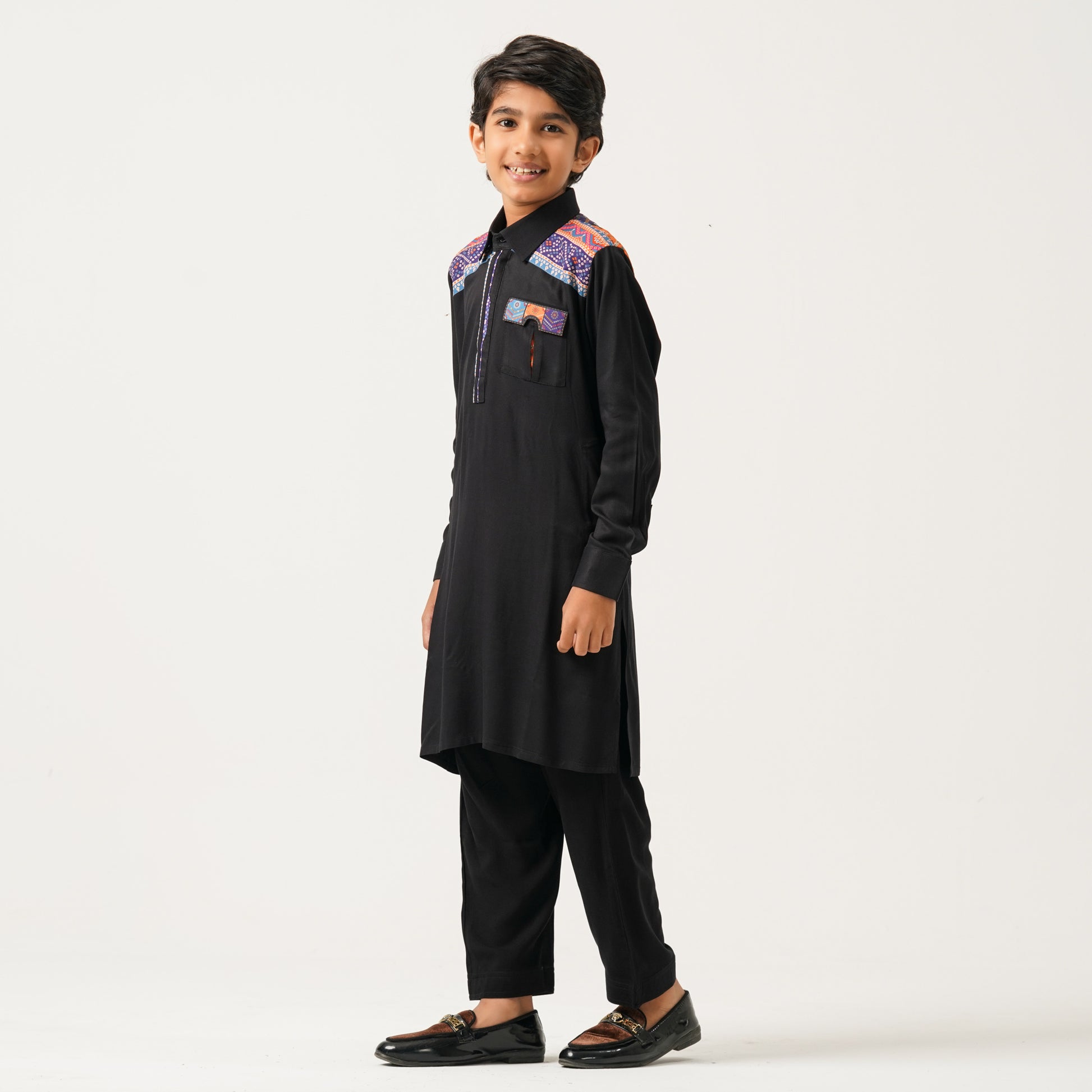 This stylish boys Kabli features a cut-and-sew design with a vibrant chunri print on the half body and pocket. Made from breathable linen fabric, it offers comfort and durability perfect for casual and festive wear.