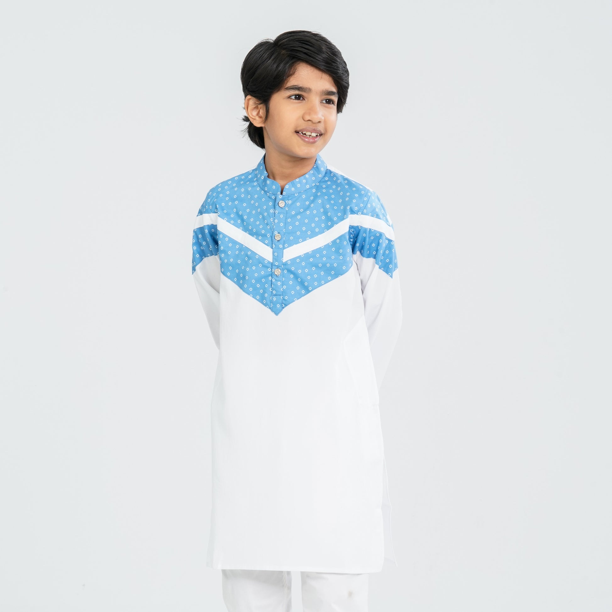 This boy's blended cotton Panjabi features batik-inspired digital print with contrast detailing for a stylish ethnic look. Designed for comfortable wear, it offers a lightweight feel and a refined appearance suitable for festive and traditional occasions.