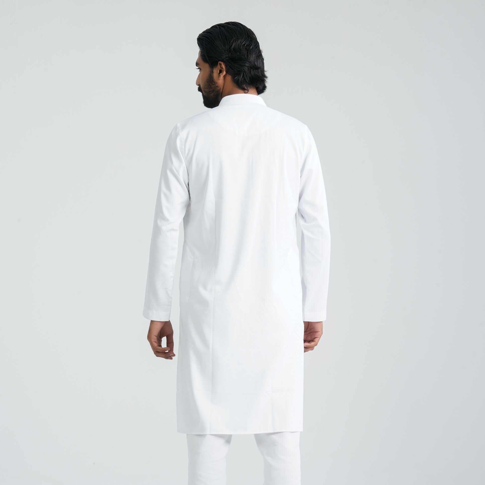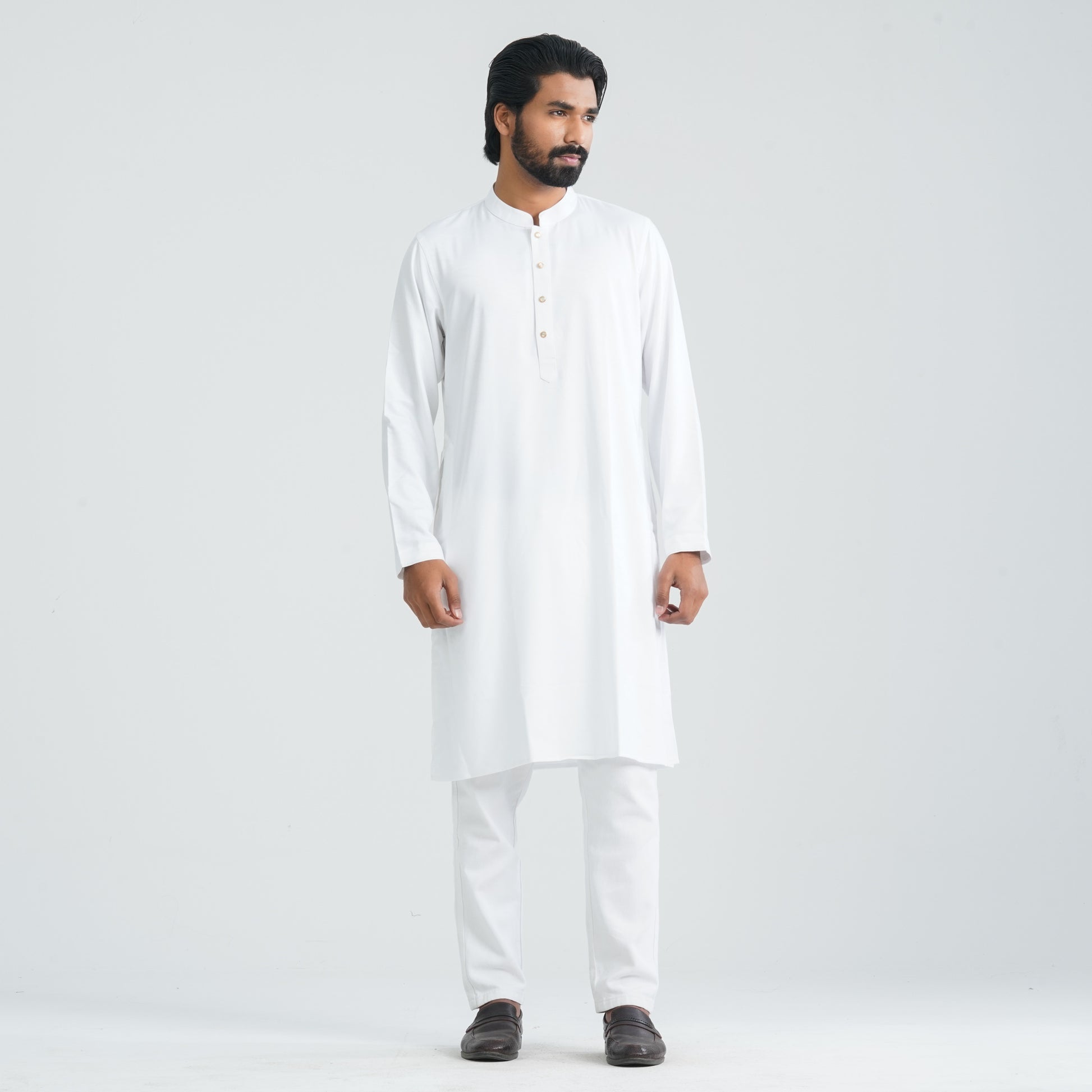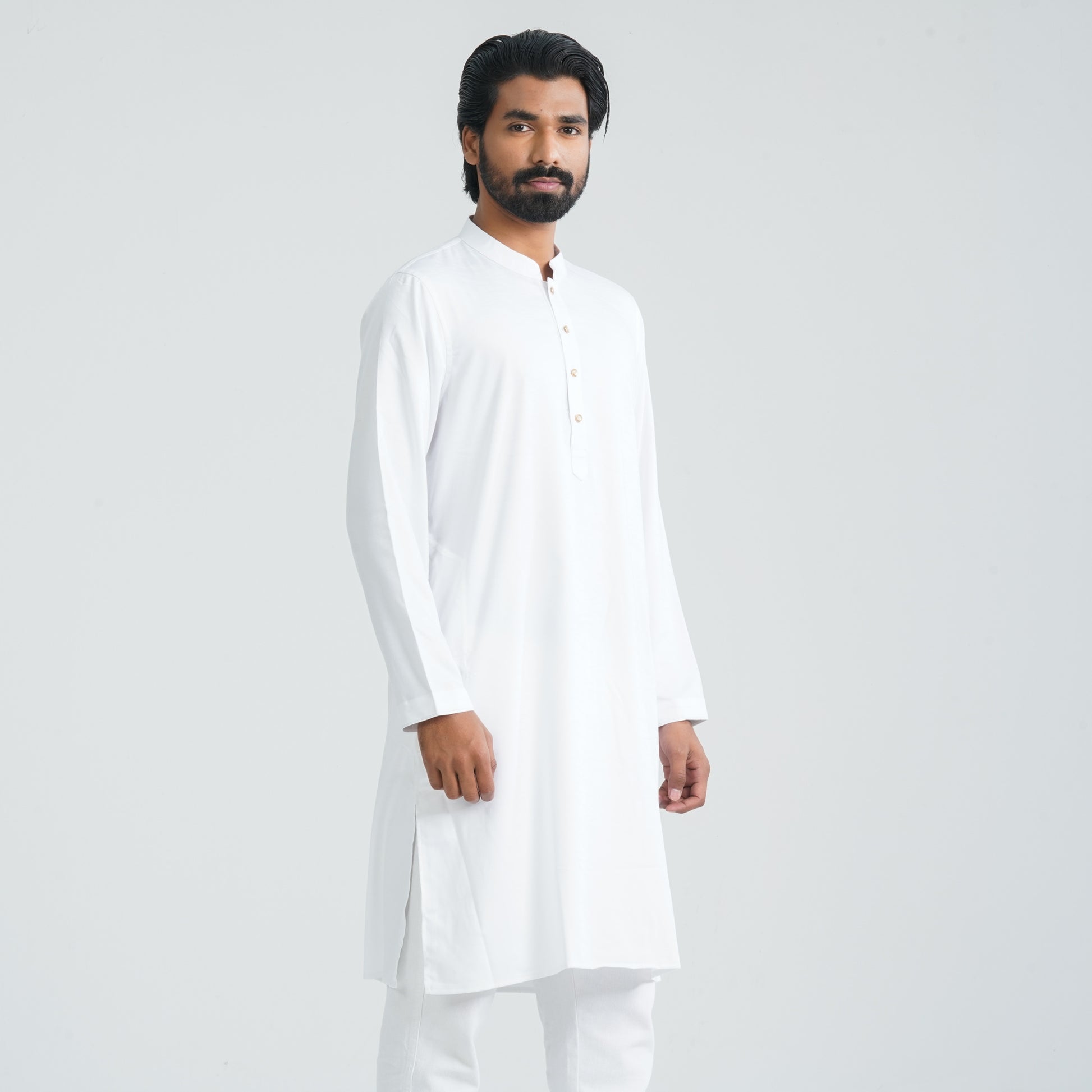 This mens white Panjabi is crafted from breathable blended cotton for all-day comfort. Designed in a regular fit, it offers a modern yet traditional look, perfect for festive and formal occasions.