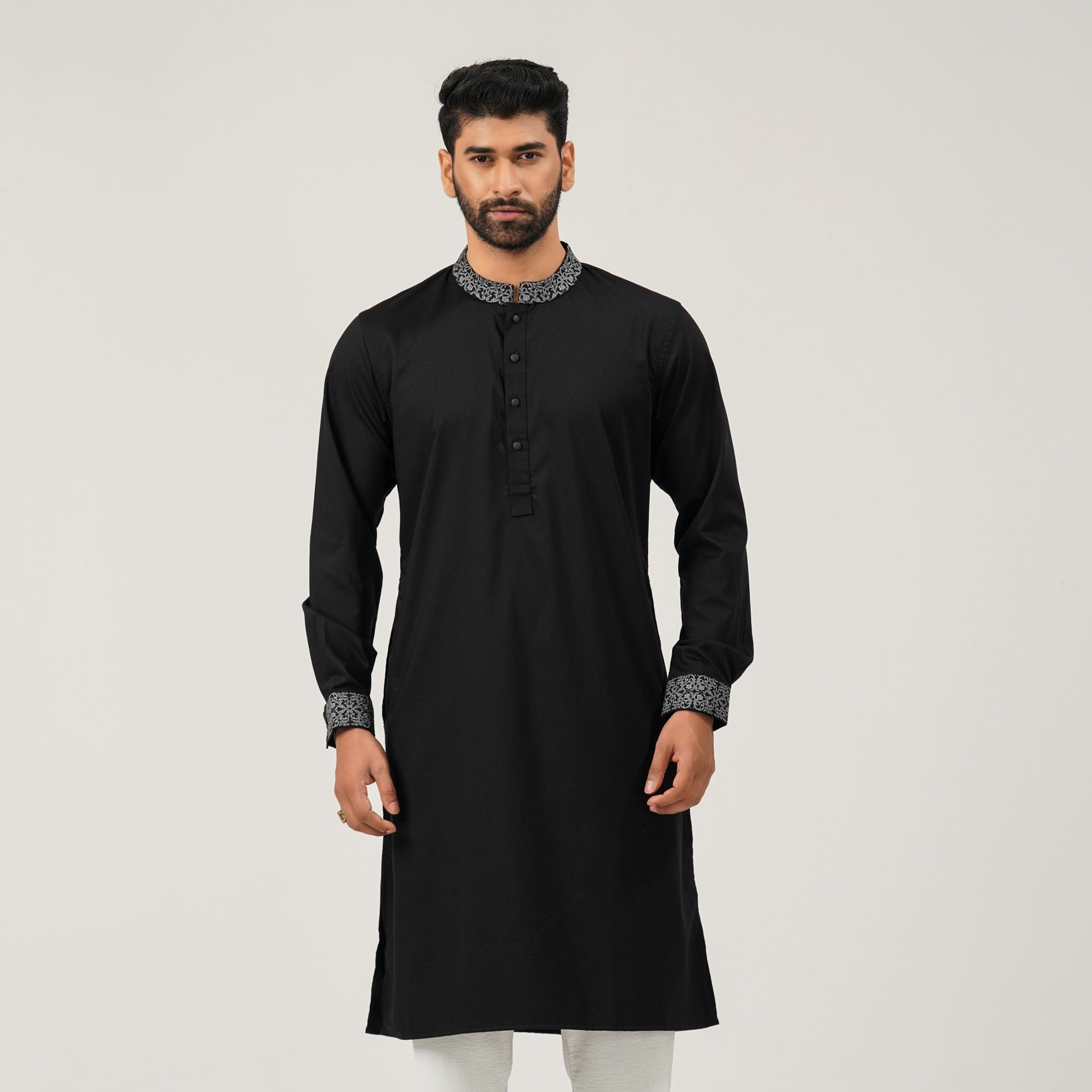 This premium mens Panjabi is crafted from high-quality bamboo silk, featuring elegant embroidery work. It offers a luxurious feel with a smooth texture, making it ideal for festive and formal occasions.
