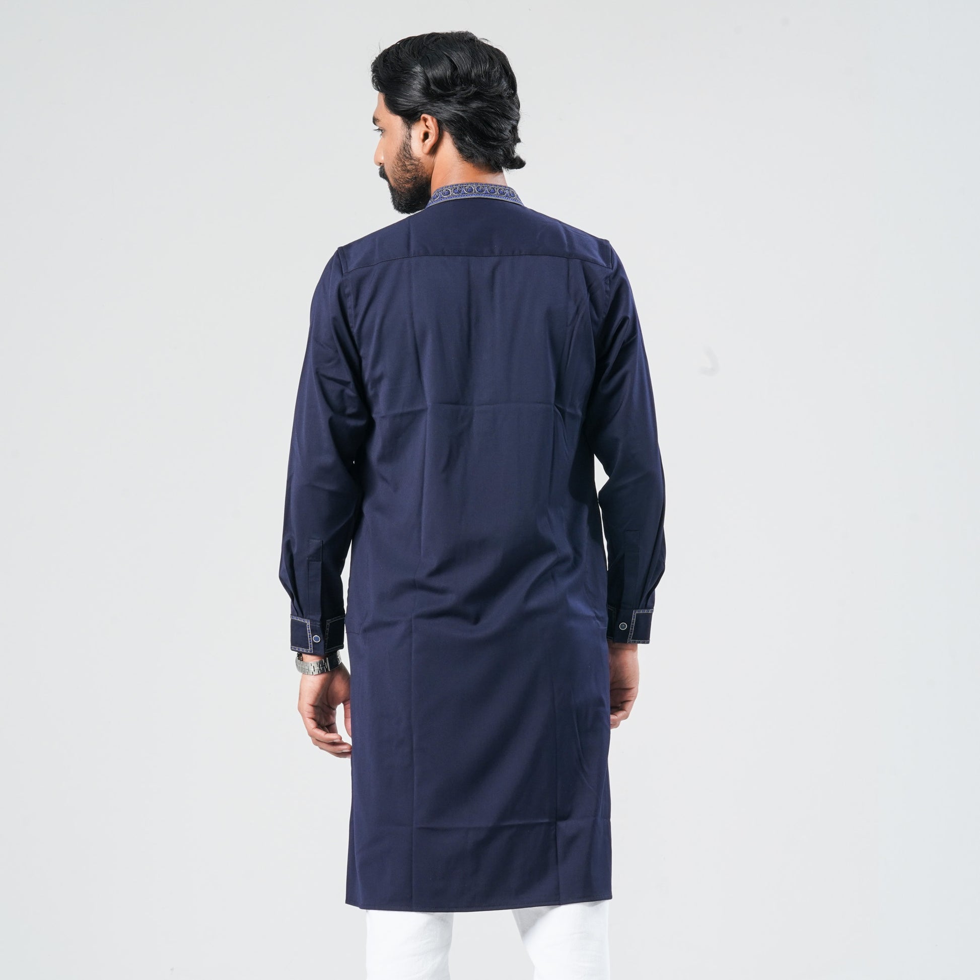 This men’s blended Panjabi features Timurid-inspired embroidery on the collar and cuffs, adding a touch of refined elegance. Made from premium blended suiting fabric, it provides a soft and comfortable feel throughout the day. Its tailored regular fit ensures a polished and sophisticated look, perfect for festive occasions or traditional gatherings. Pair it with churidar or trousers for a complete ethnic ensemble.
