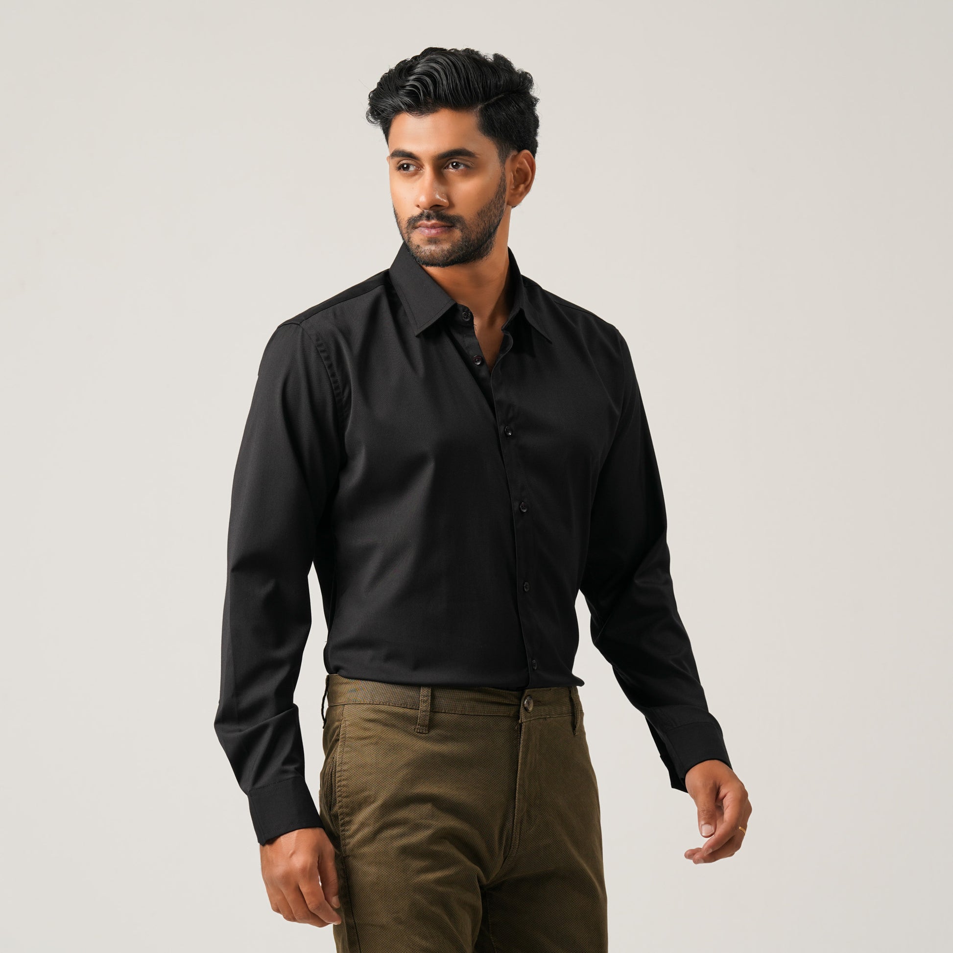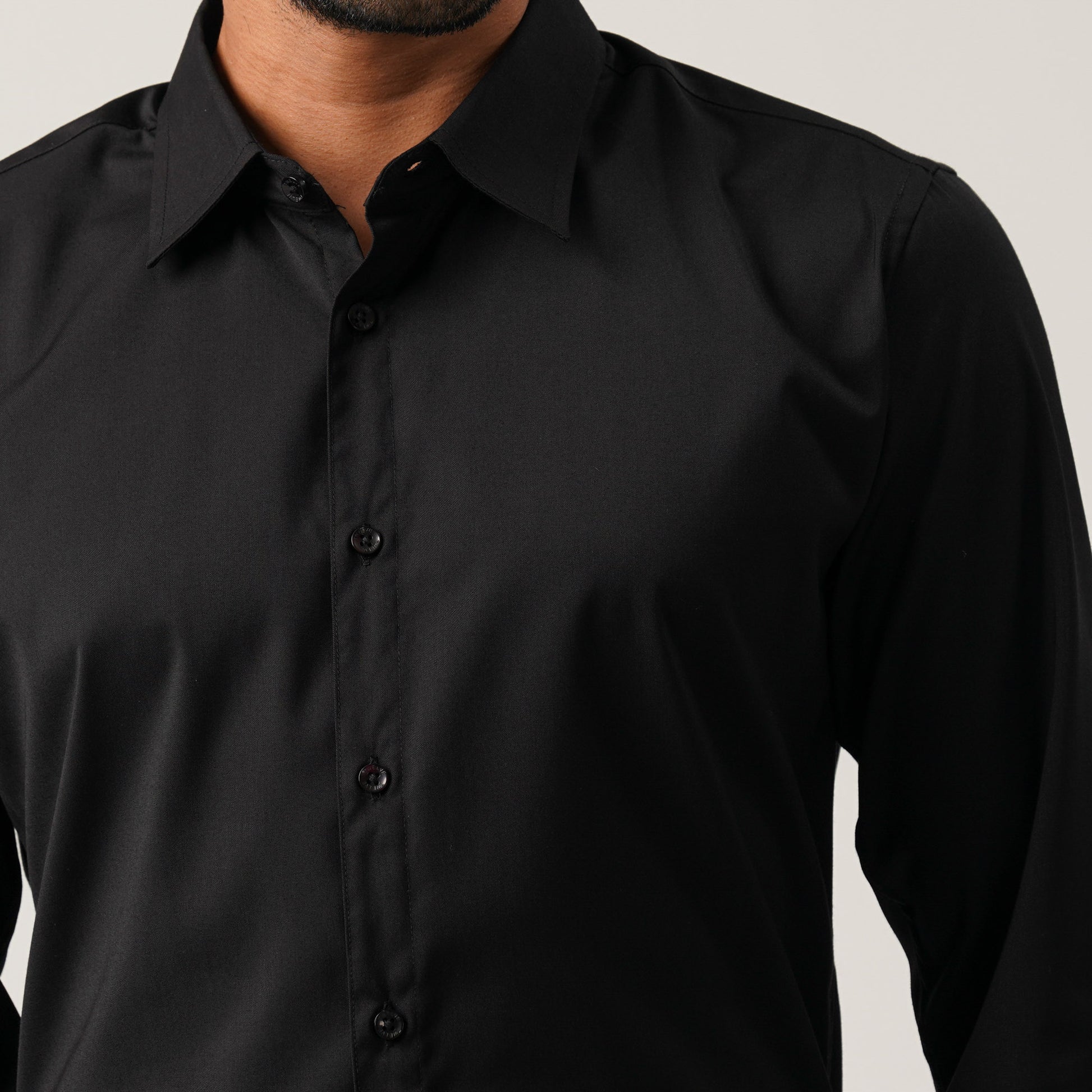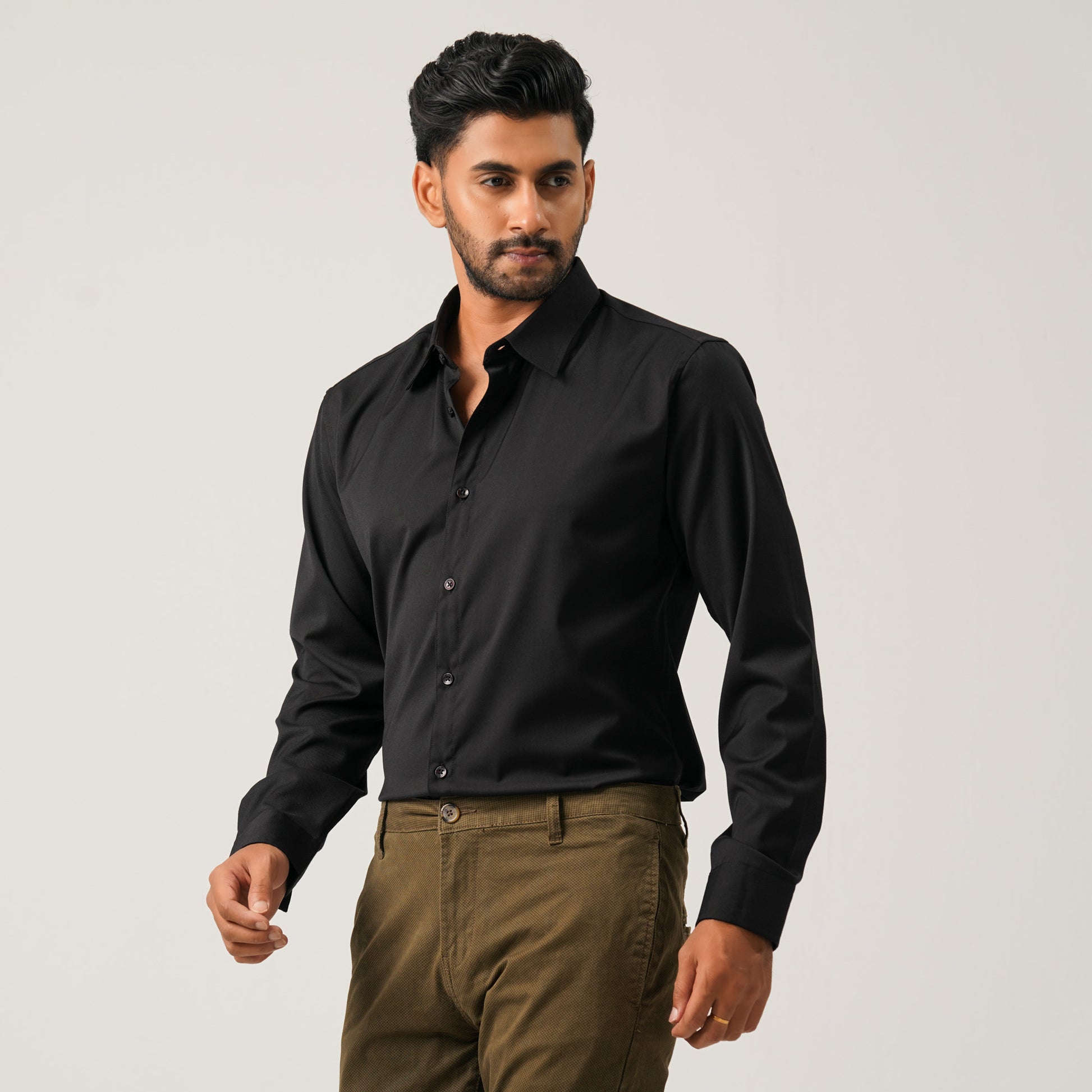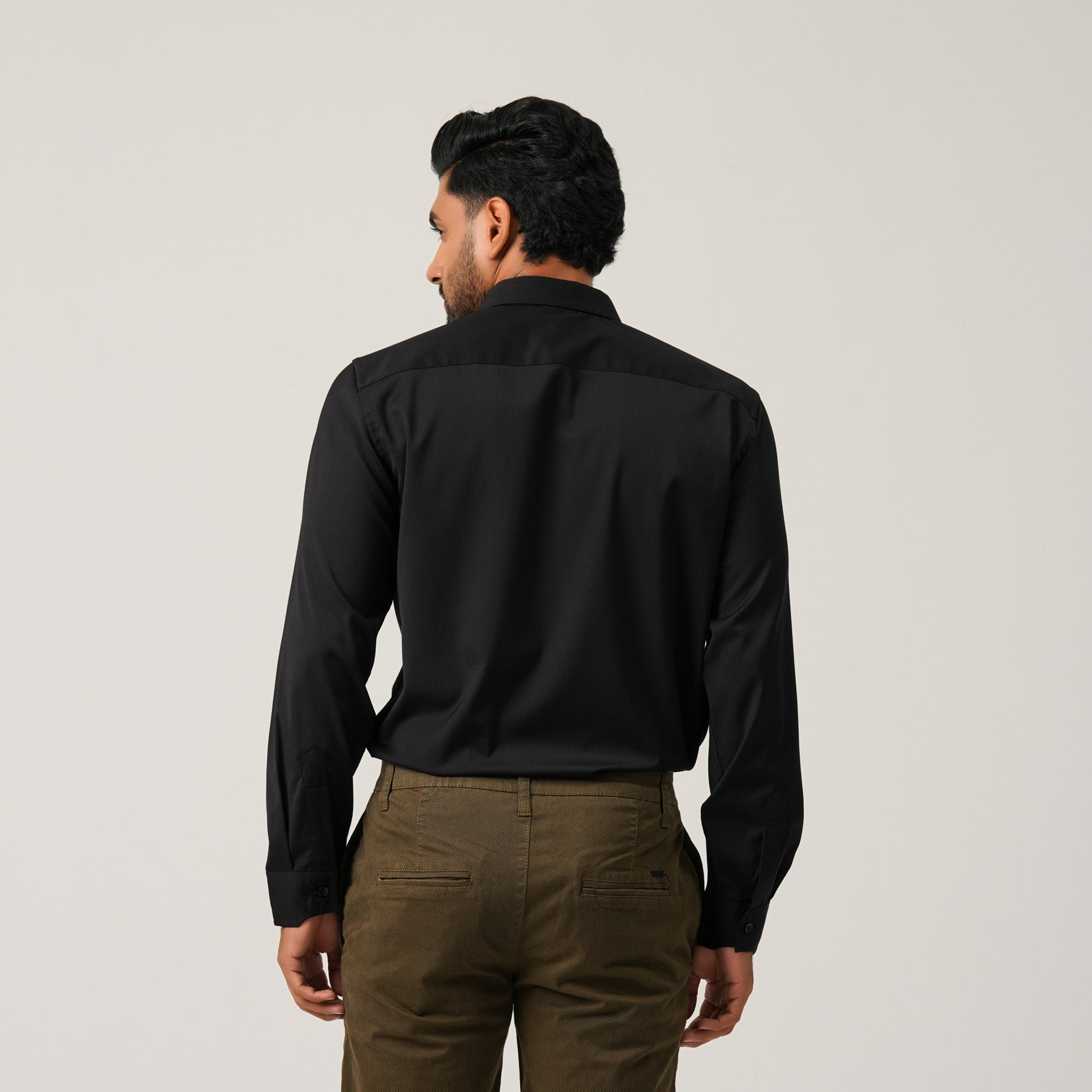 A classic black formal shirt crafted from a cotton-blended fabric for a polished look and all-day comfort. Designed with a clean silhouette, this basic formal shirt is ideal for office wear or smart occasions. Tailored for a structured yet comfortable fit.