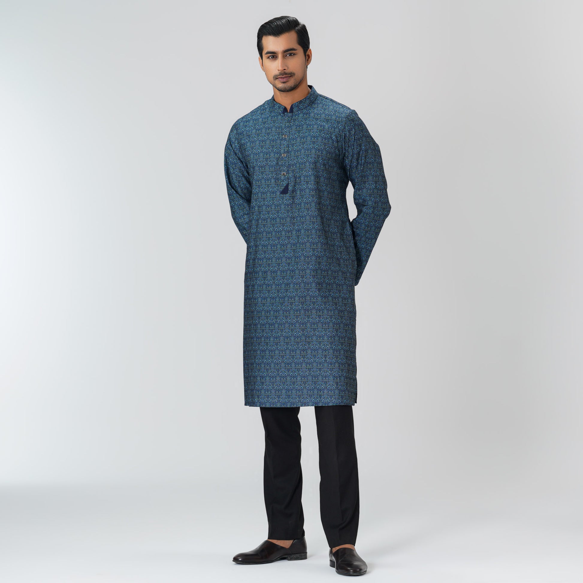 Classic blue mens basic panjabi crafted from blended fabric for a comfortable and refined look. Designed with a minimalist aesthetic, making it ideal for both casual and festive occasions.