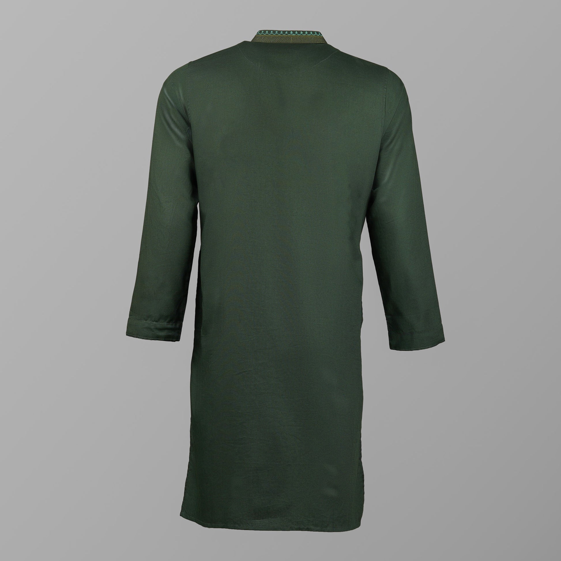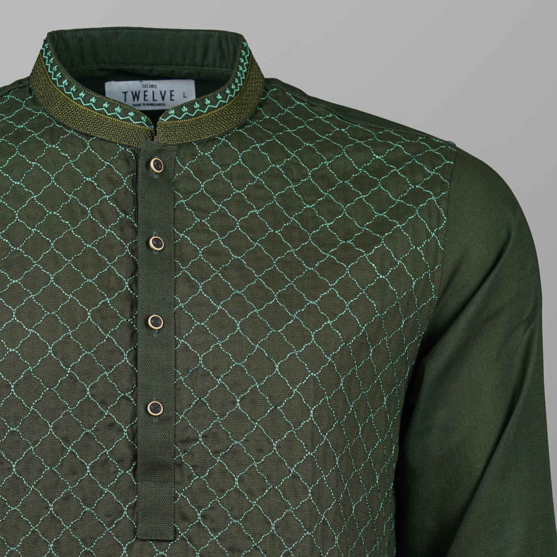 Elegant men’s embroidery Panjabi in green, crafted from a soft blended fabric for a refined and comfortable feel. Features intricate embroidery on the front placket and collar, adding a touch of traditional sophistication. Perfect for festive occasions, cultural events, or family gatherings.