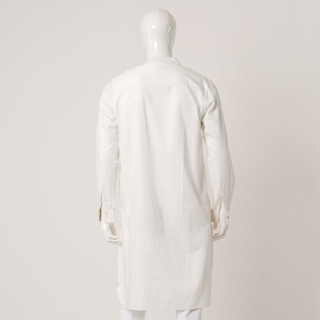This white panjabi is crafted from premium suiting fabric, featuring a stylish cut collar, detailed placket, and a unique designed pocket. With its slim fit, this panjabi brings a polished touch to traditional wear, perfect for festive and formal occasions. A refined choice for an elegant look.