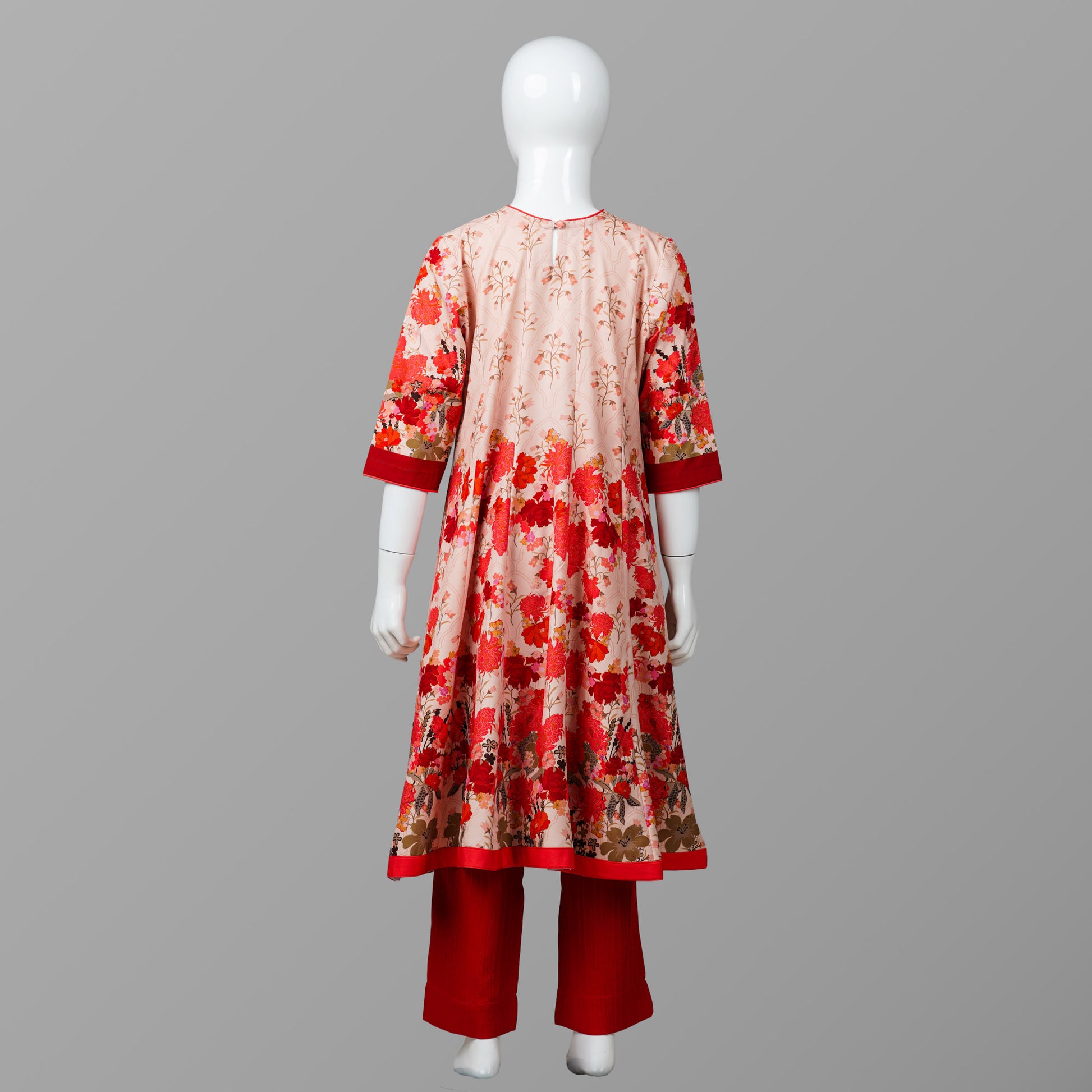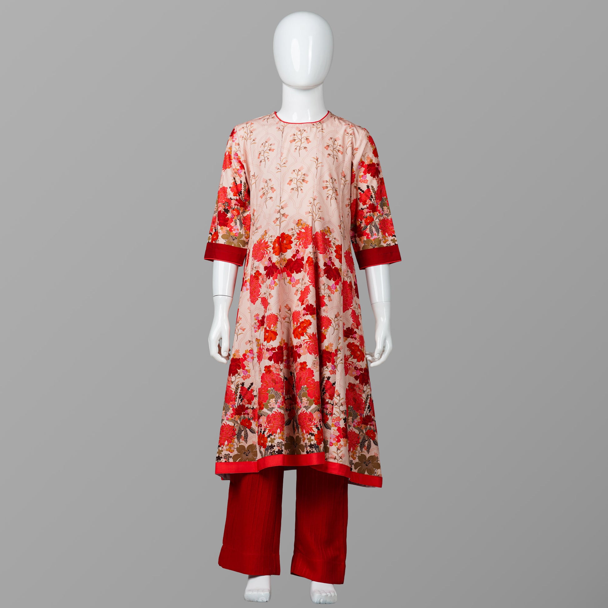 Beautiful multicolor girls two piece set crafted from soft blended silk for a stylish yet comfortable fit. The outfit features a digitally printed dress paired with solid pants, offering a chic ethnic look. Perfect for festive gatherings, parties, or cultural occasions.
