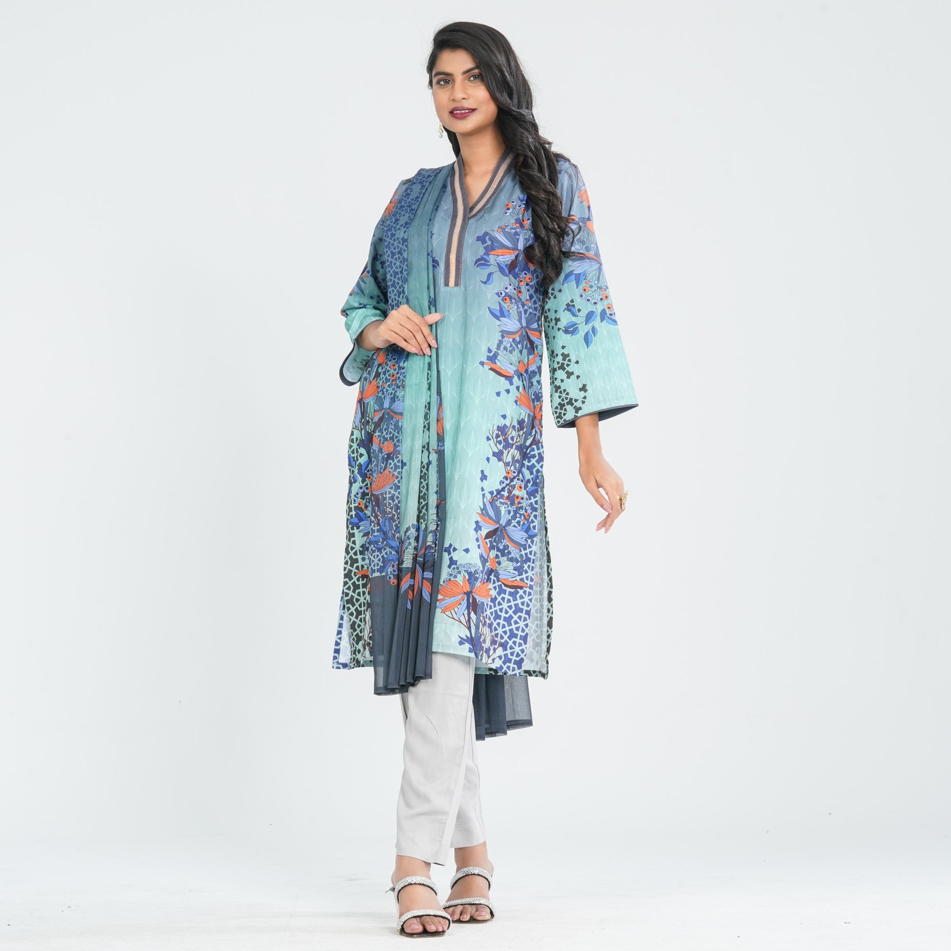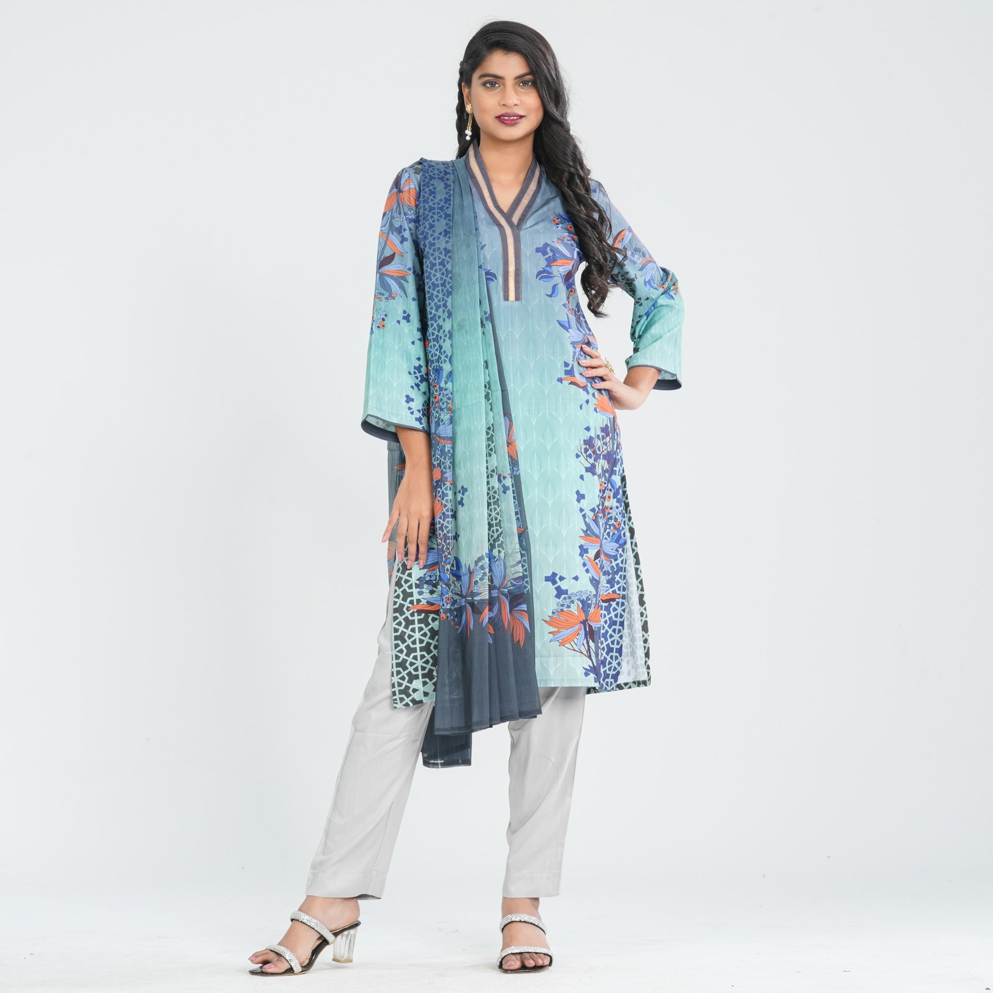 Crafted from blended silk, this three piece set features a basic straight-cut silhouette paired with a matching pant for a clean, elegant look. The silk georgette dupatta adds a soft, graceful drape. Designed with vibrant digital prints and finished with contrast fabric patches for added detail. A multicolor ensemble perfect for festive and semi-traditional wear.