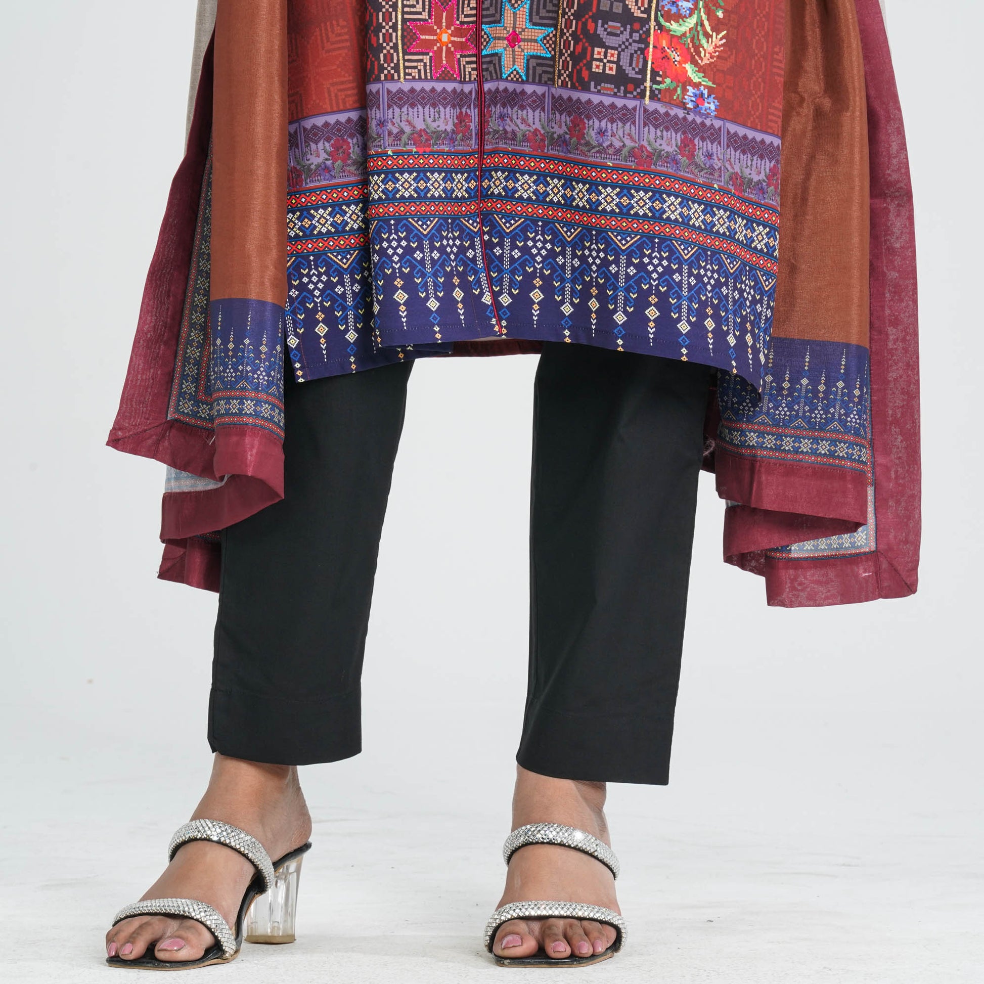This three-piece set features a blended cotton kameez with a straight-cut silhouette paired with a micro-stitch salwar for added comfort. The Tassar silk dupatta adds a refined, traditional touch. Detailed with digital prints and delicate glass-work embroidery, the ensemble offers a vibrant multi-color look. Perfect for festive and elegant everyday wear.