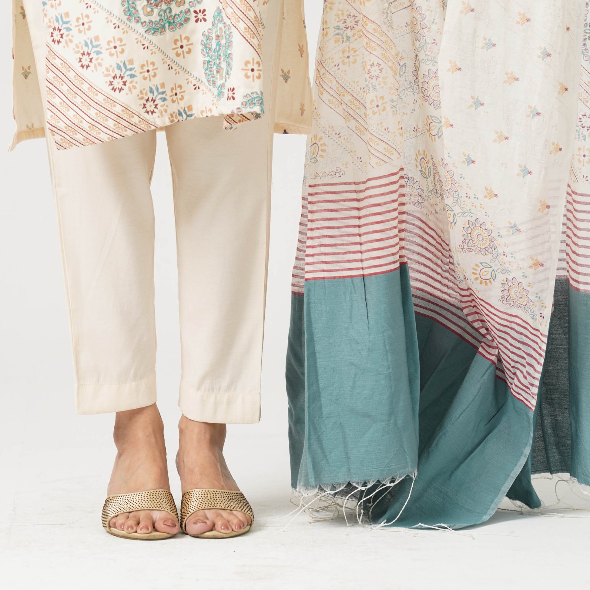 Material: The outfit features a blended fabric and pants paired with a half-silk dupatta