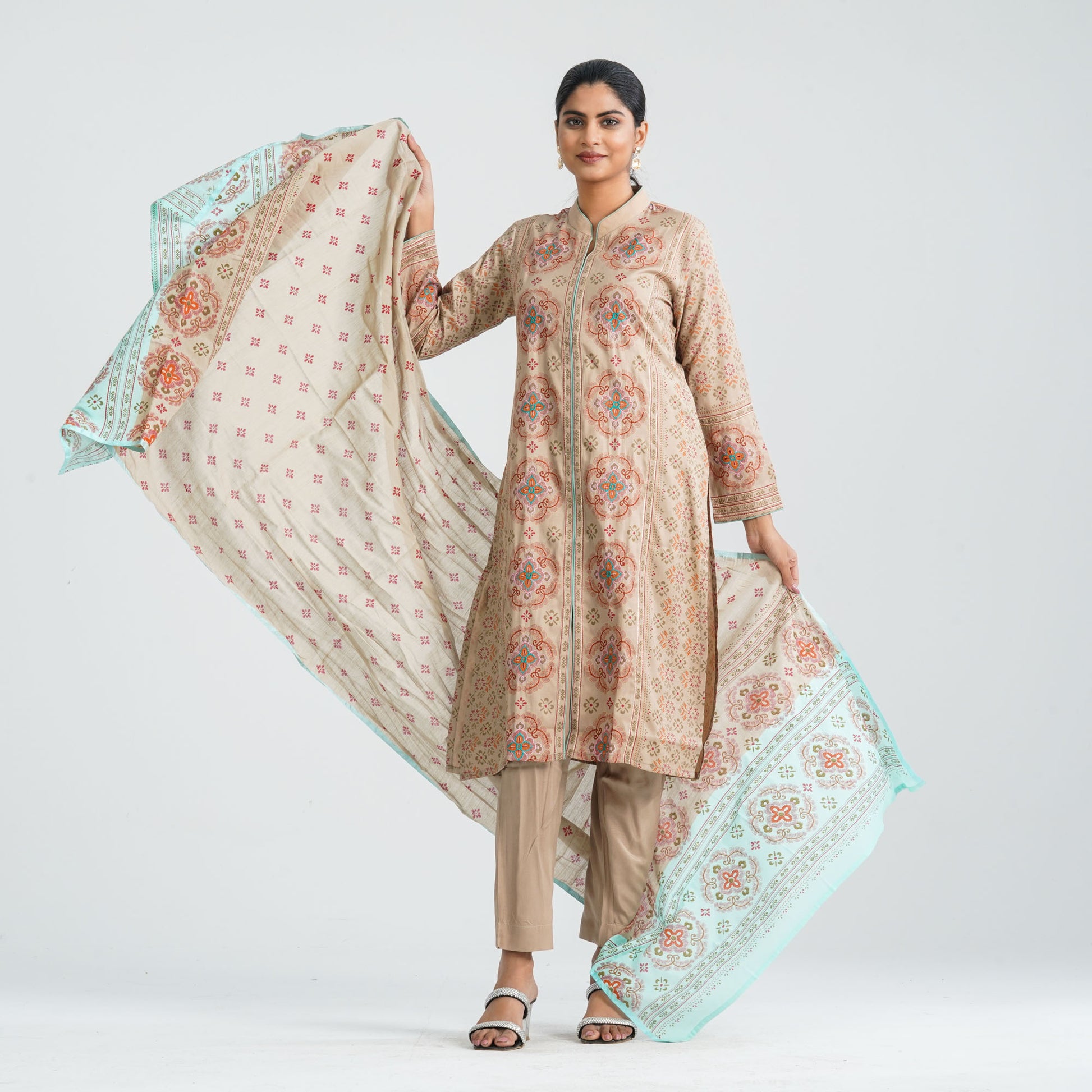 This graceful three-piece set features a viscose kameez and pant, paired with a beautifully printed half-silk dupatta. The kameez is adorned with screen prints and delicate embroidery, adding an elegant ethnic touch. Perfect for festive wear, cultural gatherings, and refined everyday styling.