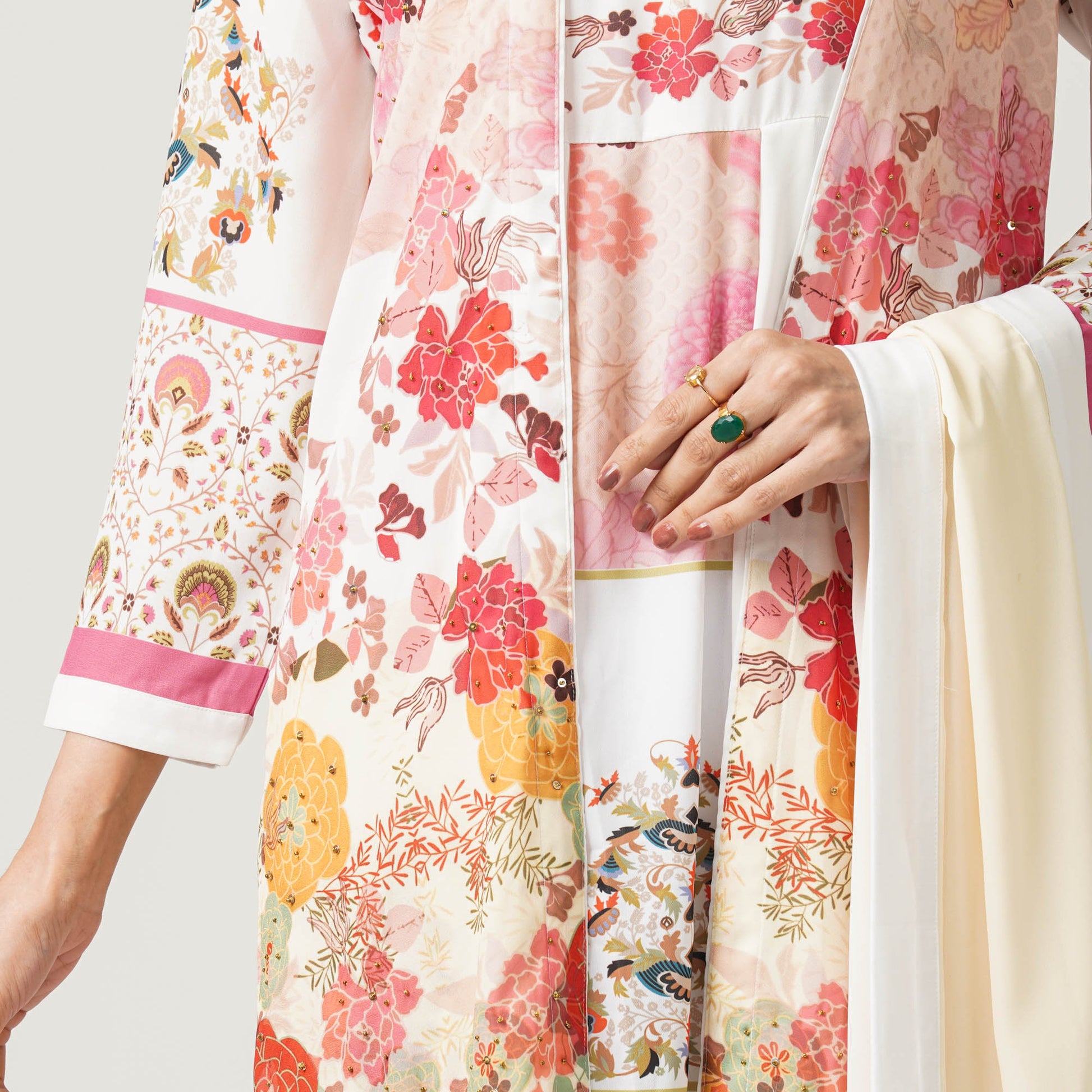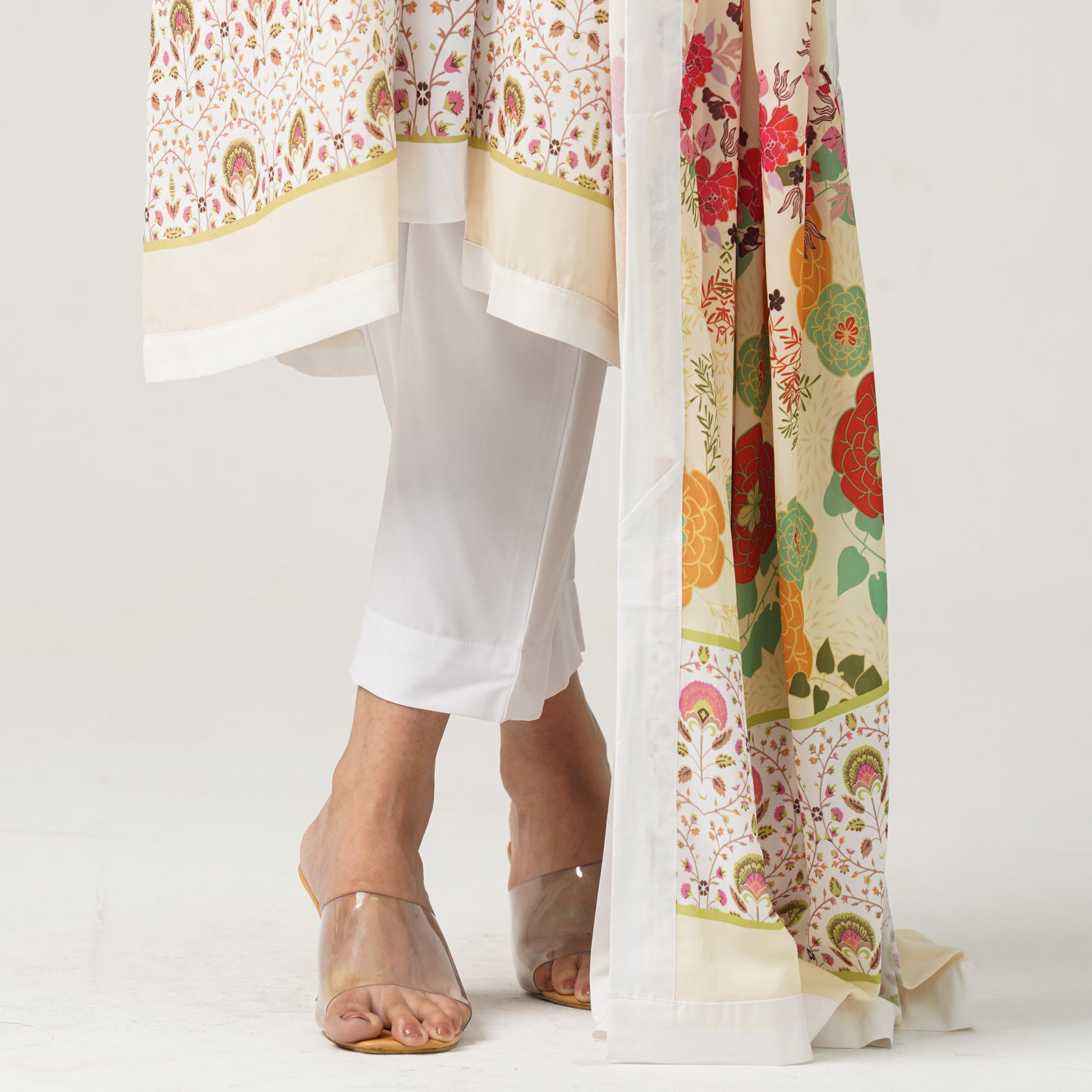 Stylish women’s three-piece set featuring a georgette long jacket with contemporary digital prints and subtle sequin work on the front. Paired with a comfortable straight-fit georgette top and blended silk straight pants, this set combines elegance with ease. Perfect for festive occasions, family gatherings, or semi-formal events.