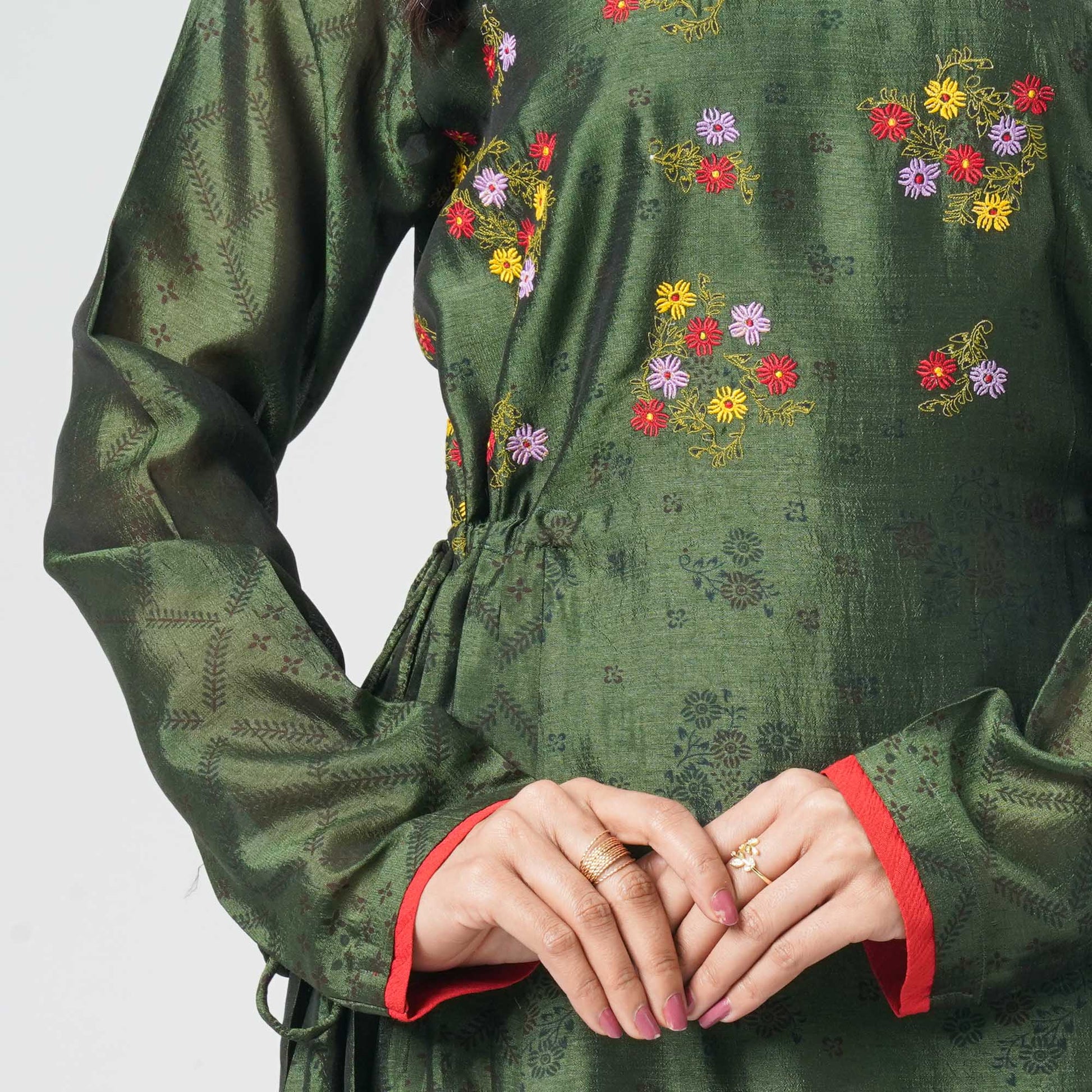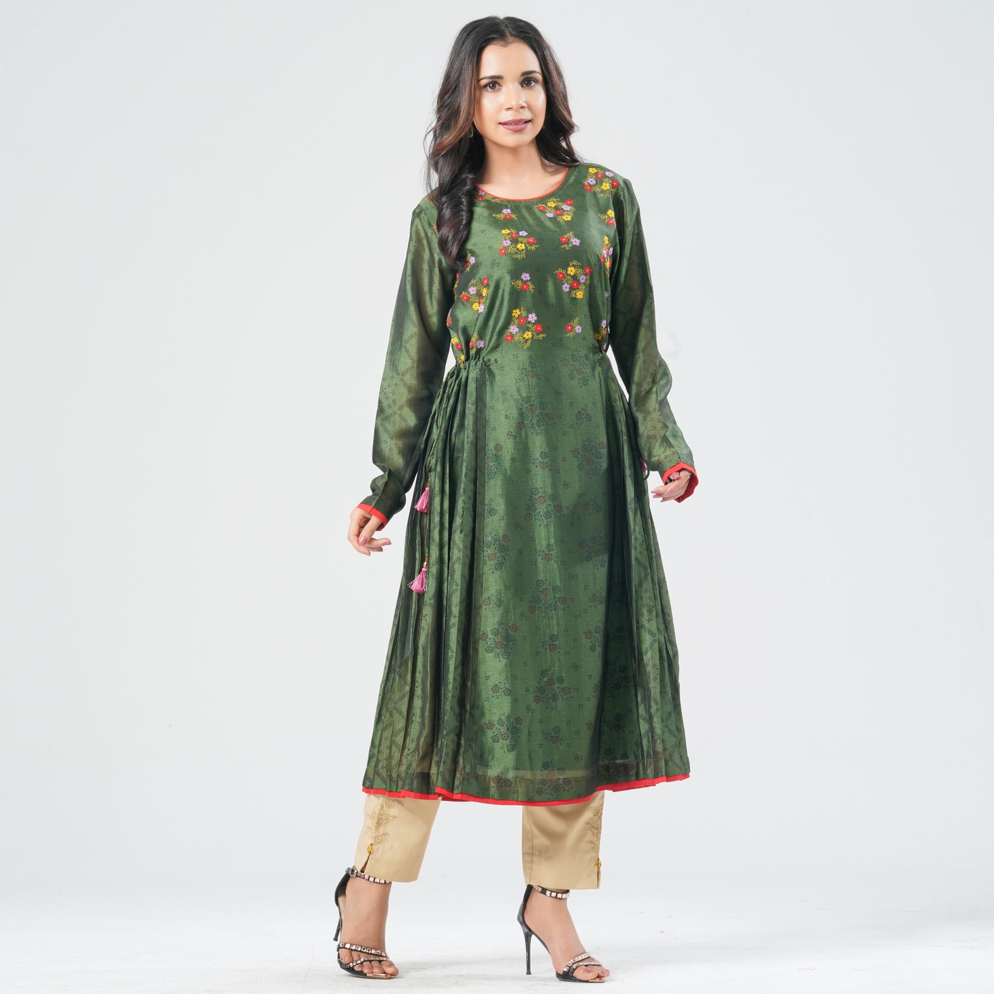 This women’s green kurti features a stylish round neckline with elegant pleats on the side waist for a flattering silhouette. Designed with contrast piping on the sleeves and hem for a refined finish. The kurti is enhanced with allover screen prints and detailed embroidery with prints on the front yoke. Perfect for casual outings, festive gatherings, and everyday ethnic wear.