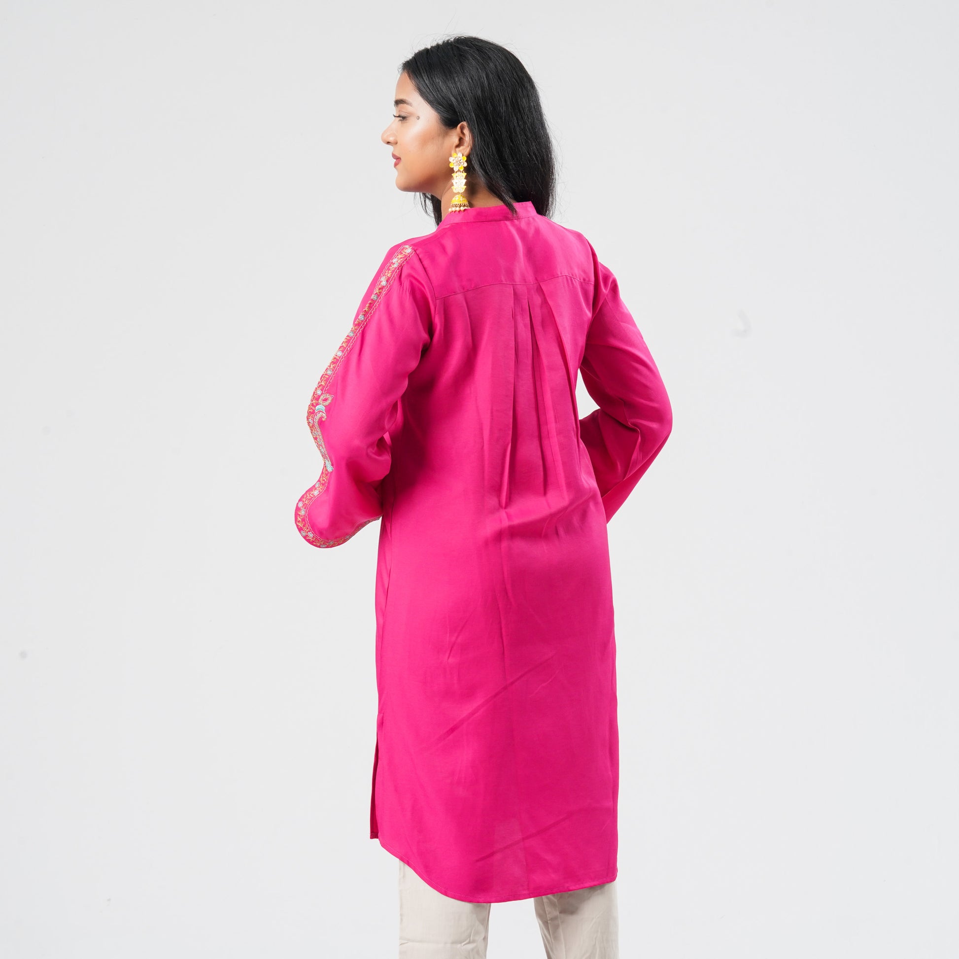 This elegant Kurti is crafted from premium mixed silk, offering a smooth finish and comfortable wear. Designed with a classic straight-cut body, it features beautifully flared sleeves that add movement and charm. The yoke and sleeves are enriched with detailed embroidery, bringing a refined ethnic touch to the overall look. Perfect for both everyday elegance and festive styling.