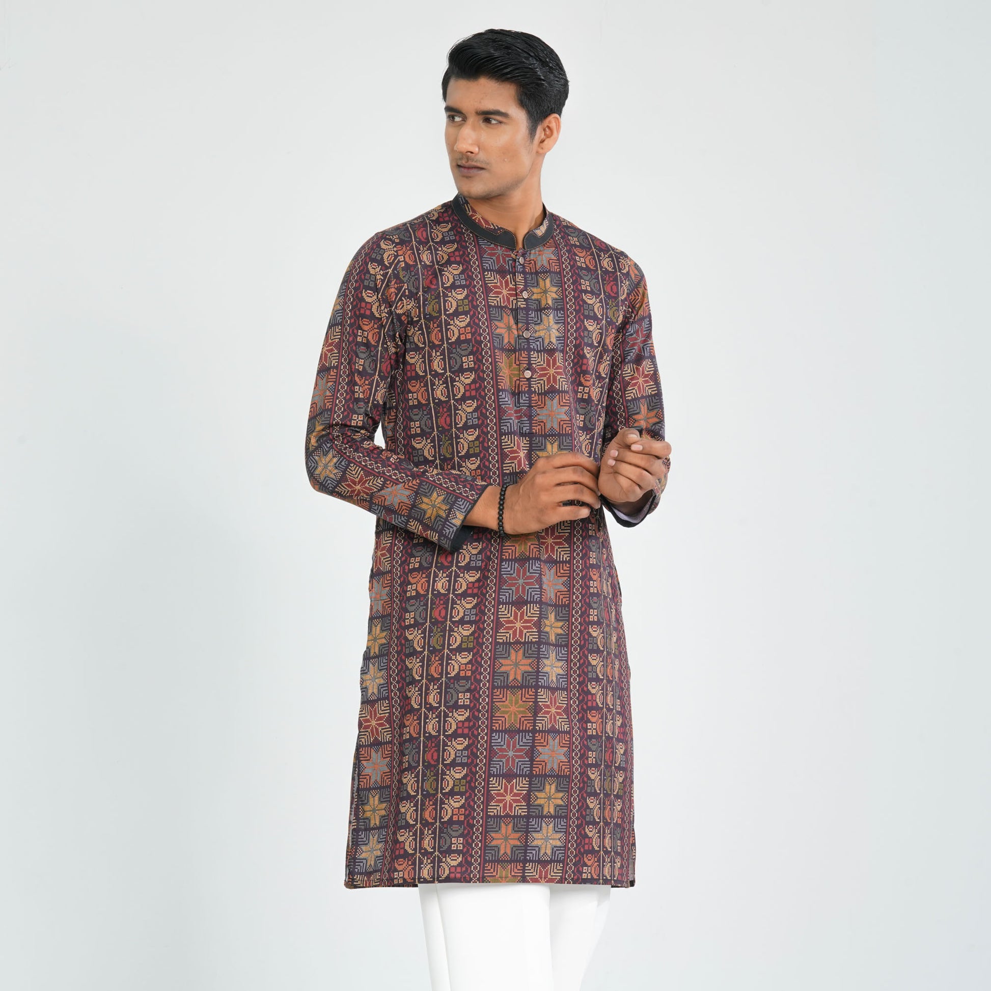 Crafted from smooth blended fabric, this panjabi features a bold digital print inspired by traditional Tatreez motifs. Minimal detailing keeps the focus on its striking, maximal look. The multicolor palette adds vibrancy, making it perfect for festive wear and standout ethnic styling.