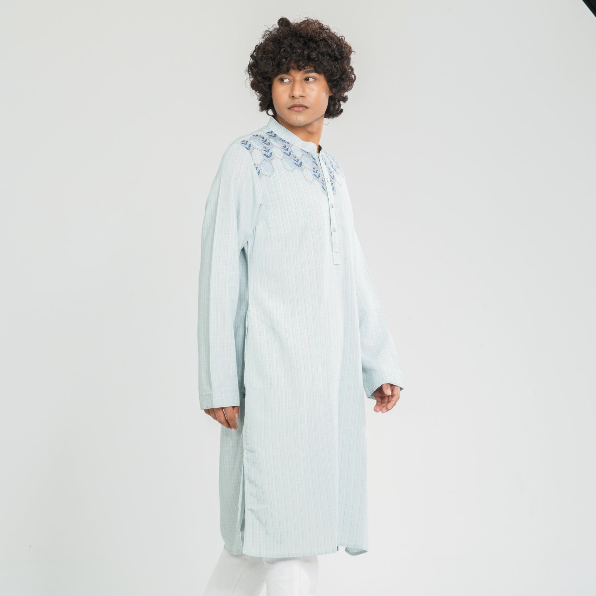 Crafted from comfortable cotton fabric, this Panjabi features half-body embroidery that adds a refined ethnic touch. Designed with a masculine, structured look suitable for both everyday wear and special occasions. The powder blue tone enhances its elegant and understated appeal. A perfect blend of tradition and modern style.