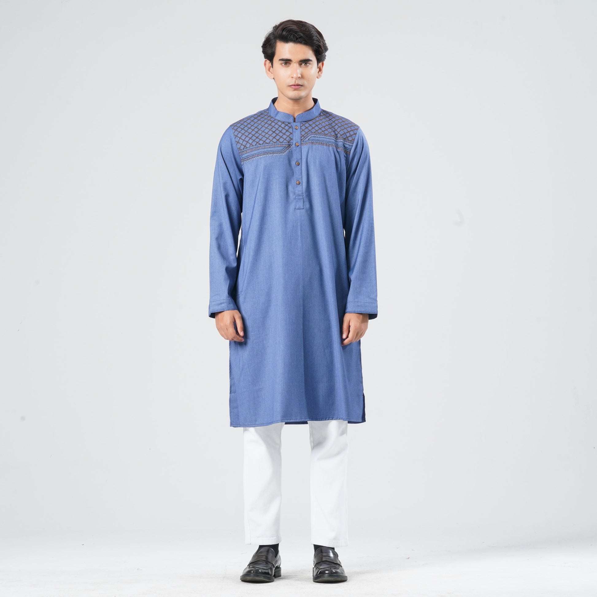 Made from blended fabric, this Panjabi features striking geometric-inspired embroidery on the chest for a modern ethnic touch. The denim blue tone enhances its contemporary appeal, creating a stylish festive look perfect for celebrations, gatherings, and cultural events.