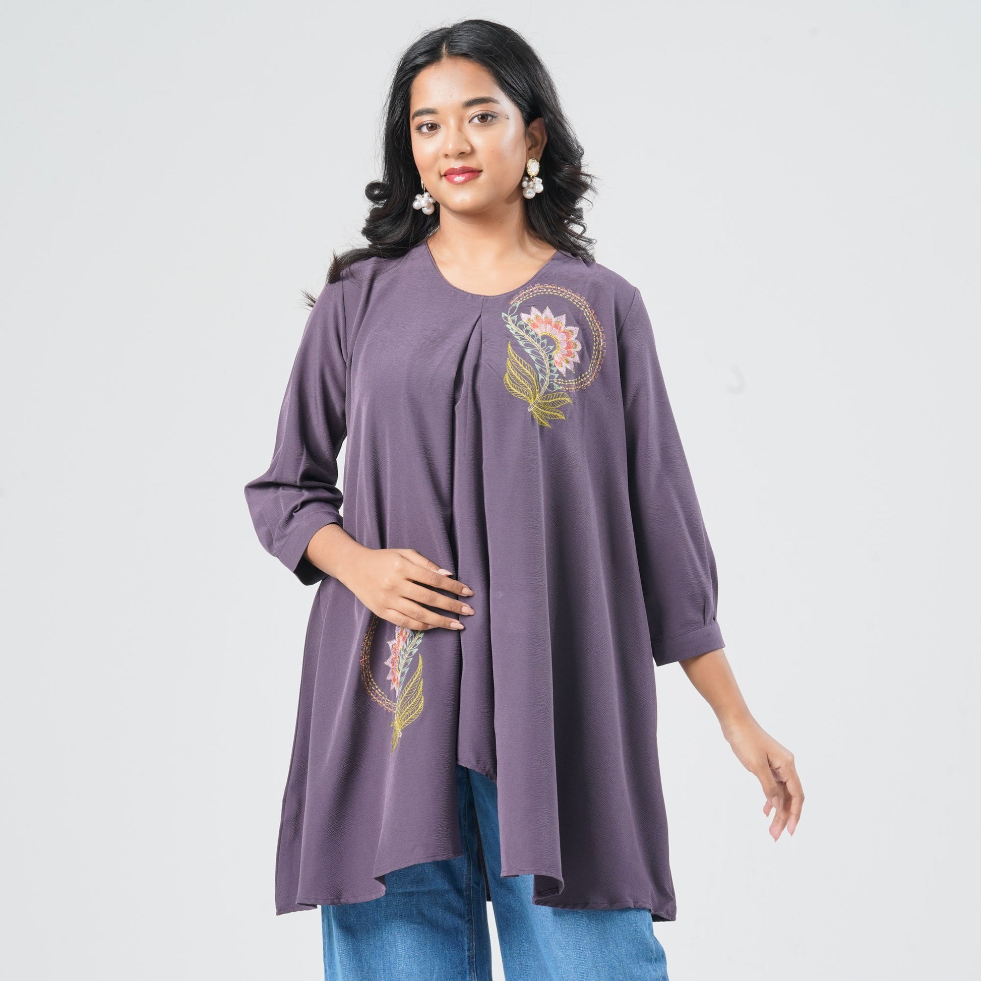 This women’s ethnic tunic is crafted from smooth blended silk fabric for a refined and comfortable feel. Designed in a straight-fit silhouette, it features an elegant shawl collar that adds a modern ethnic touch. The tunic is enhanced with eye-catching digital prints, making it stylish yet versatile. Decorative run stitch detailing completes the look, perfect for casual to semi-formal wear.