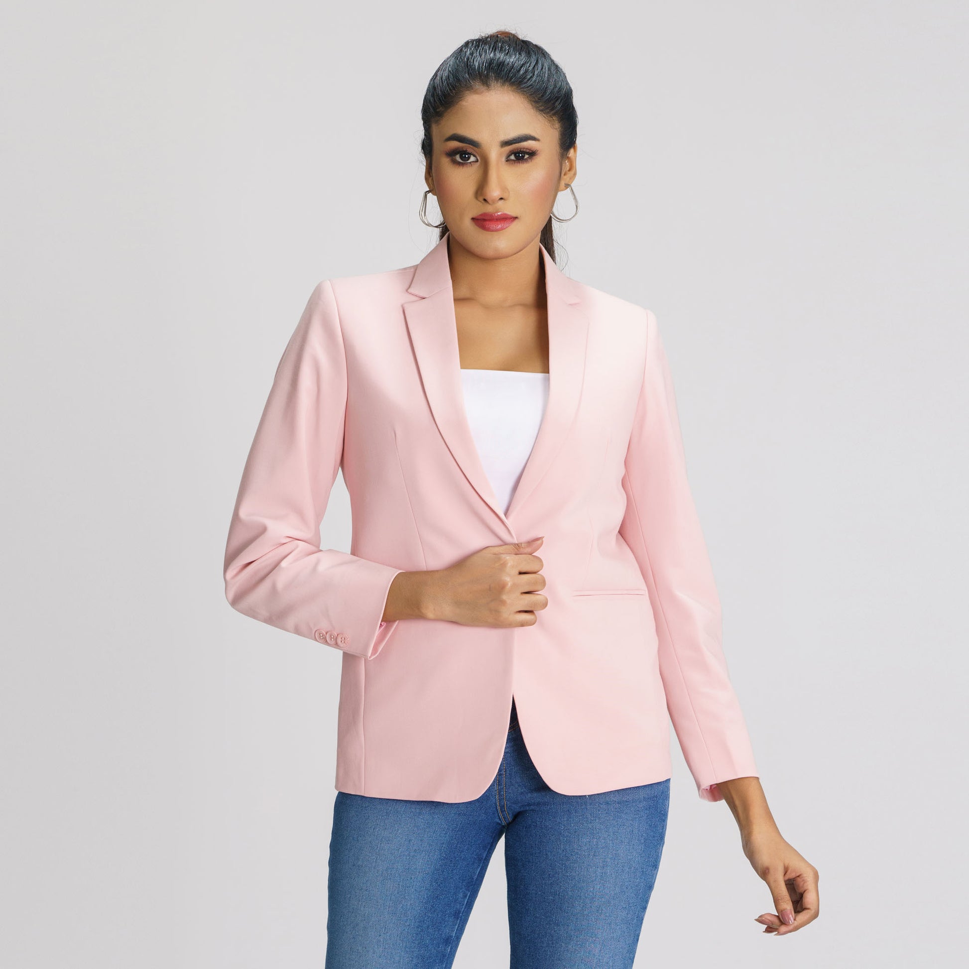 This women’s slim fit baby pink blazer combines style with lightweight comfort, crafted from a poly blend for easy layering. With a single button and one cut, it features an unlined and unpadded design that adds a refined touch to casual and semi-formal outfits. Perfect for versatile, everyday wear.