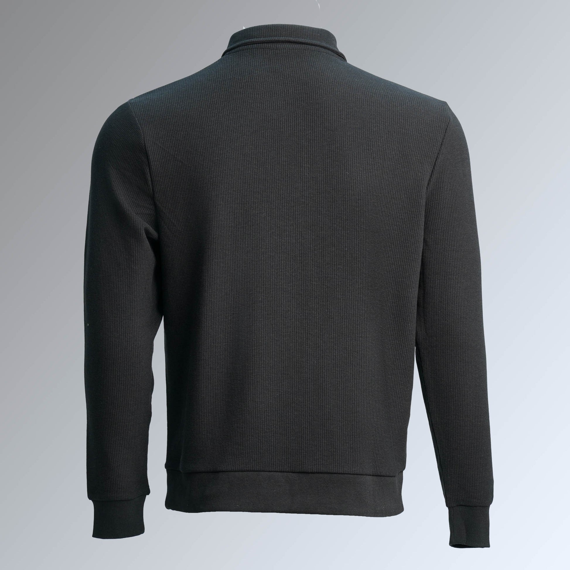 This men’s black full-sleeve polo t-shirt is crafted from a waffle-textured fabric made of modal, cotton, and spandex for superior comfort and stretch. Designed with a stylish zipper fastening, it adds a modern twist to a classic polo look. The 270–290 GSM fabric ensures durability while remaining breathable, making it ideal for all-day wear. Perfect for casual outings or smart-casual styling.
