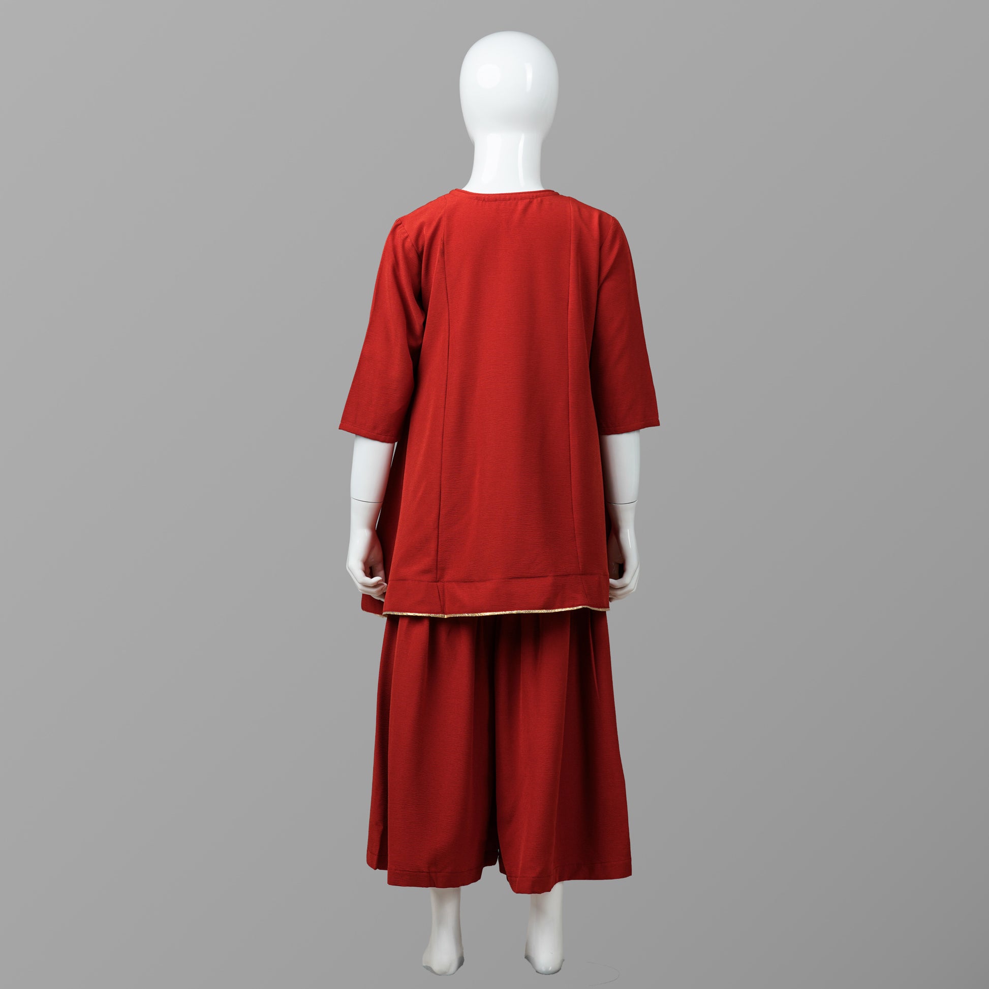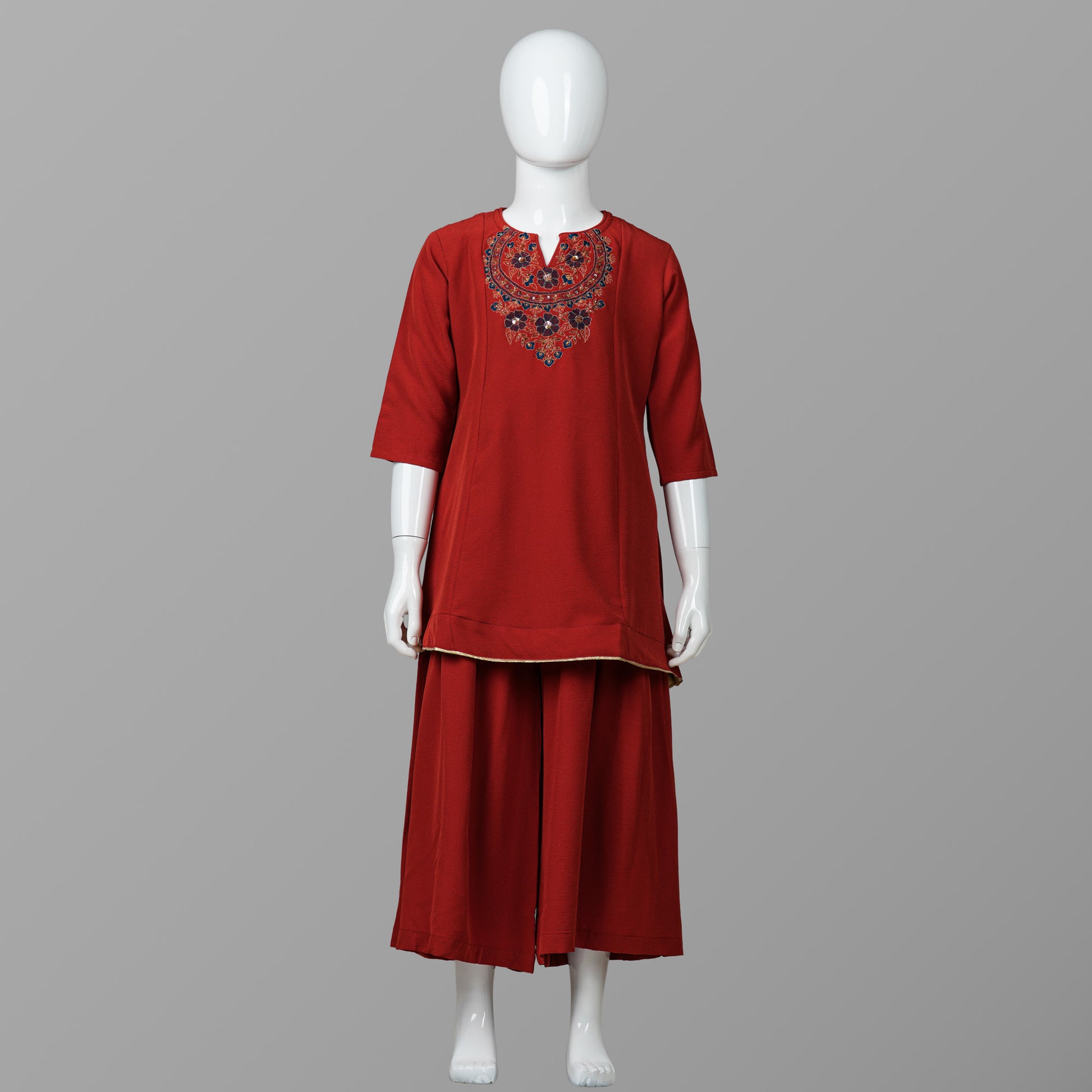 Charming deep orange girls two-piece set featuring a georgette top adorned with delicate sequin work and embroidery. Paired with a sharara-cut bottom, this outfit blends style with comfort. A perfect choice for festive occasions, parties, or family celebrations.