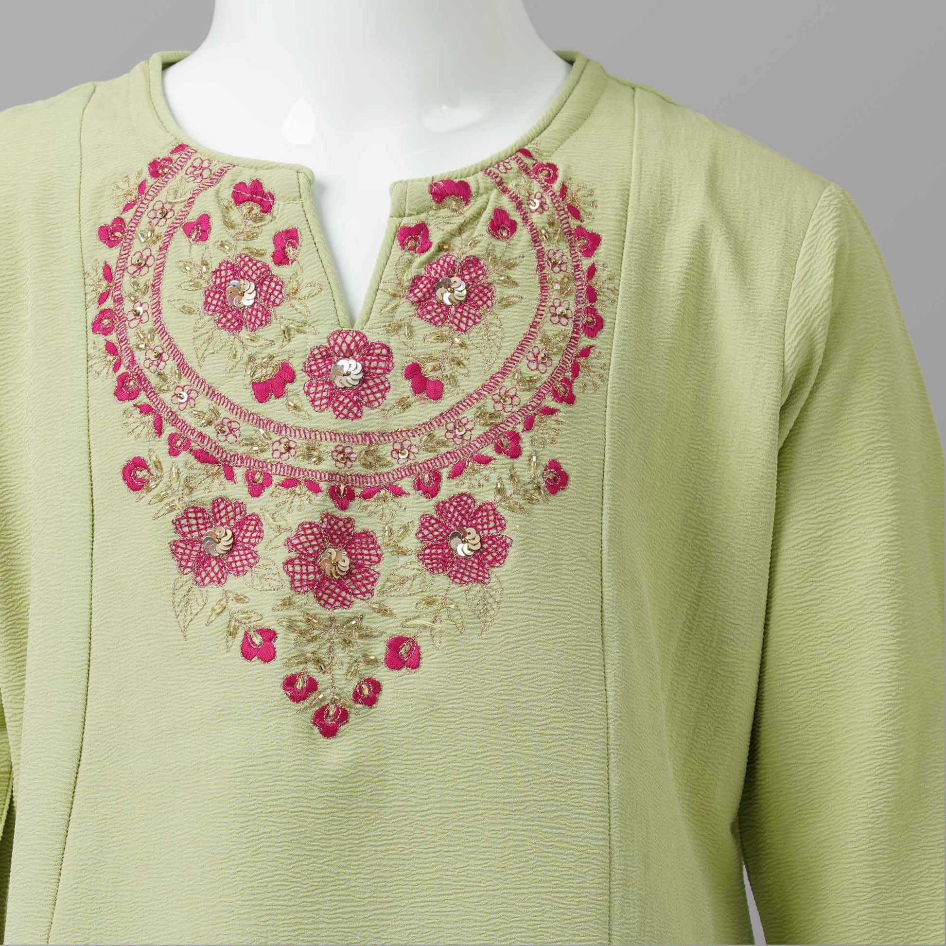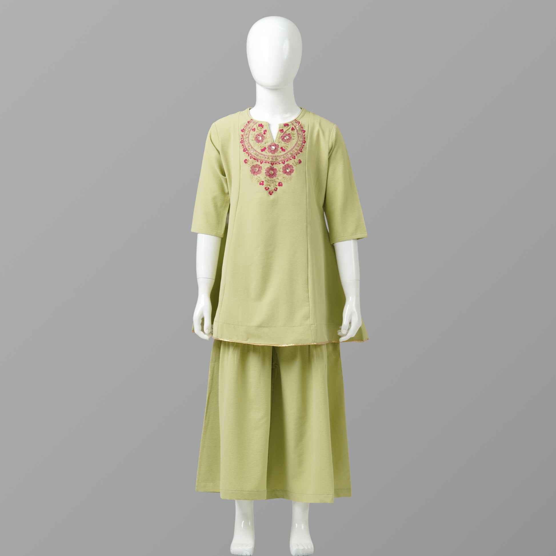 Charming green girls two-piece set featuring a georgette top adorned with delicate sequin work and embroidery. Paired with a sharara-cut bottom, this outfit blends style with comfort. A perfect choice for festive occasions, parties, or family celebrations.