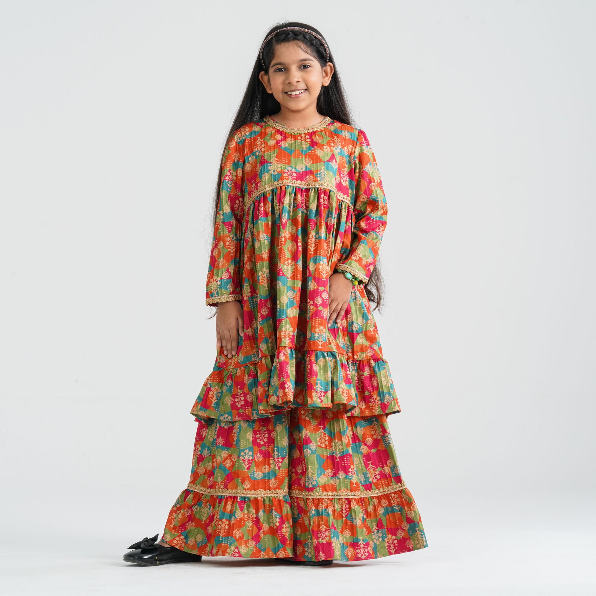 This girl’s multicolor ethnic two piece set features a beautifully digital printed frock-style top paired with a stylish sharara. Crafted from soft blended cotton fabric, it ensures breathable comfort and easy wear. Decorative border lace embellishment adds an elegant festive touch. Perfect for Eid, weddings, and special cultural celebrations.