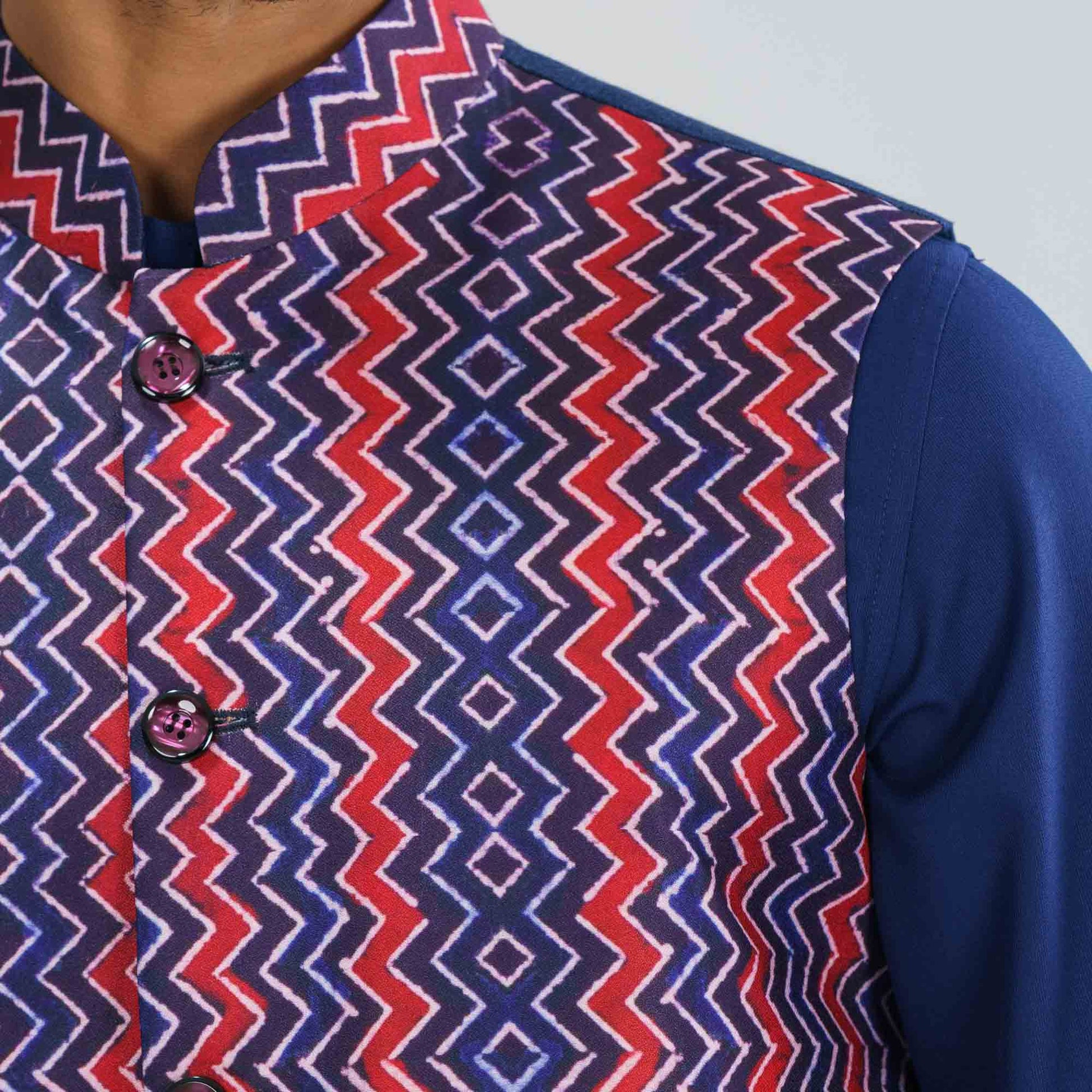 This two piece set features a solid mixed cotton Panjabi paired with an Azrak-printed vest, offering a perfect blend of classic and contemporary styles. Ideal for festive and semi-formal occasions, the regular fit ensures a comfortable and stylish look.