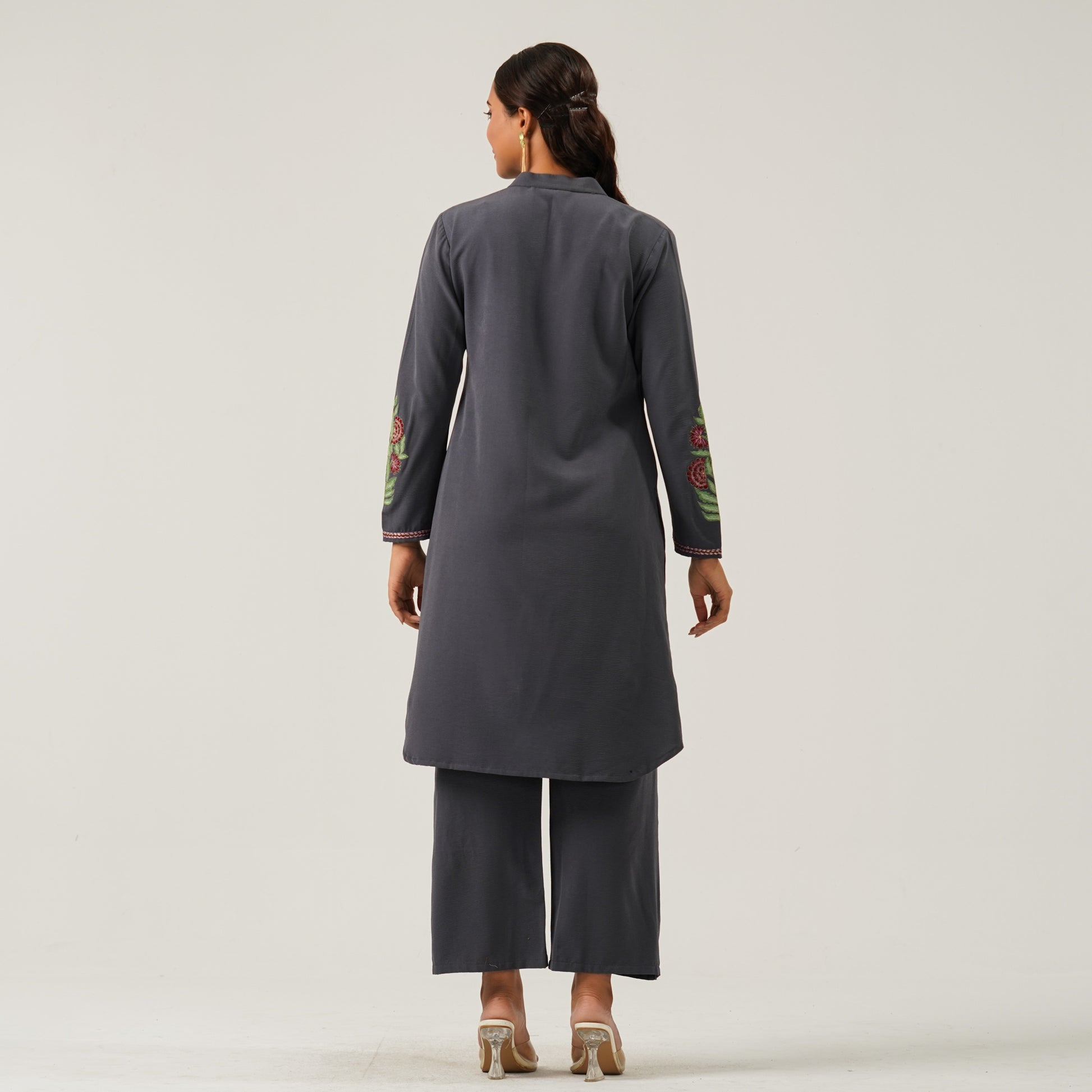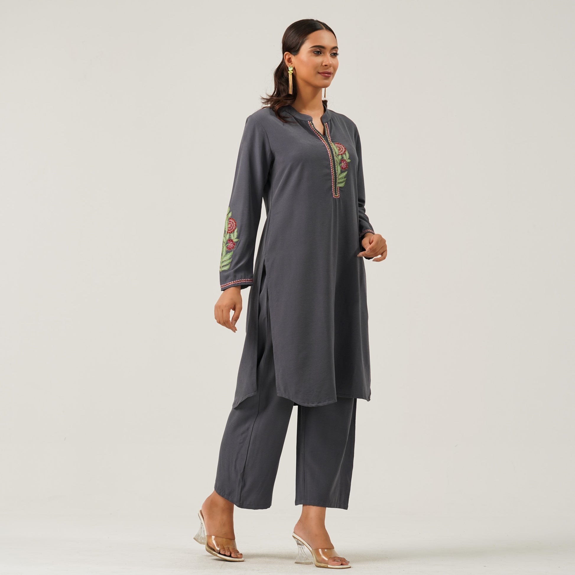 This elegant two piece set is crafted from georgette fabric, offering a refined look with luxurious texture. Intricate manual embroidery adds a touch of sophistication, making it ideal for festive and semi-formal occasions. Stylish yet comfortable, it's designed for the modern woman.