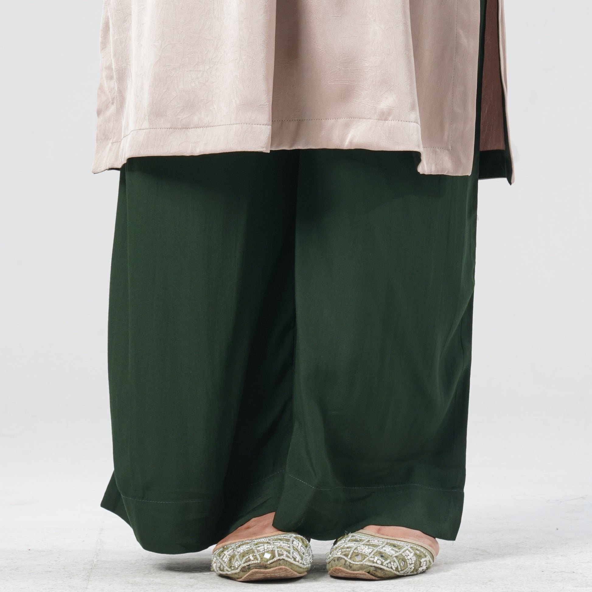 This women’s beige ethnic two-piece set includes a shawl collar pleated Kurti paired with a stylish bell-shaped pant. The design is enhanced with delicate sequin embroidery, run stitch detailing, and contrast piping for a refined look. Crafted from silk fabric on the top and blended silk on the pant, it ensures a graceful drape and comfortable wear. A perfect choice for festive events and elegant day occasions.