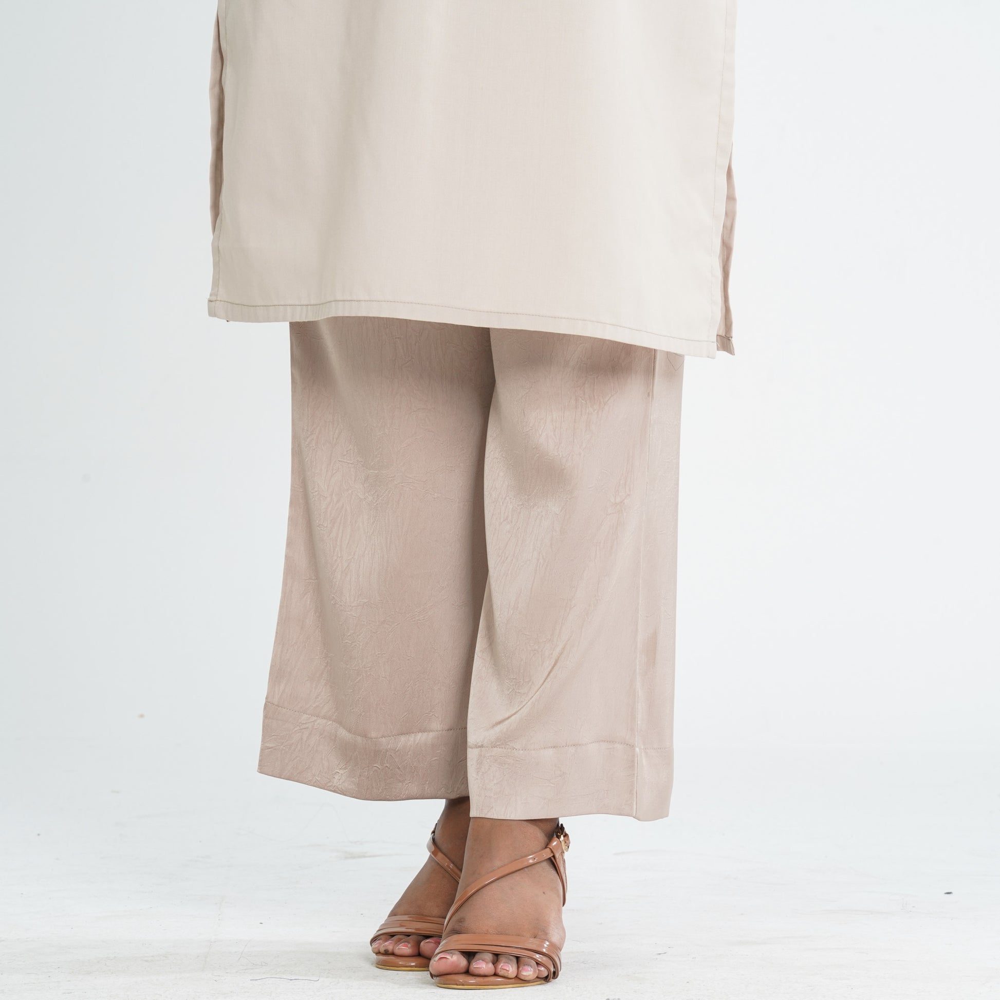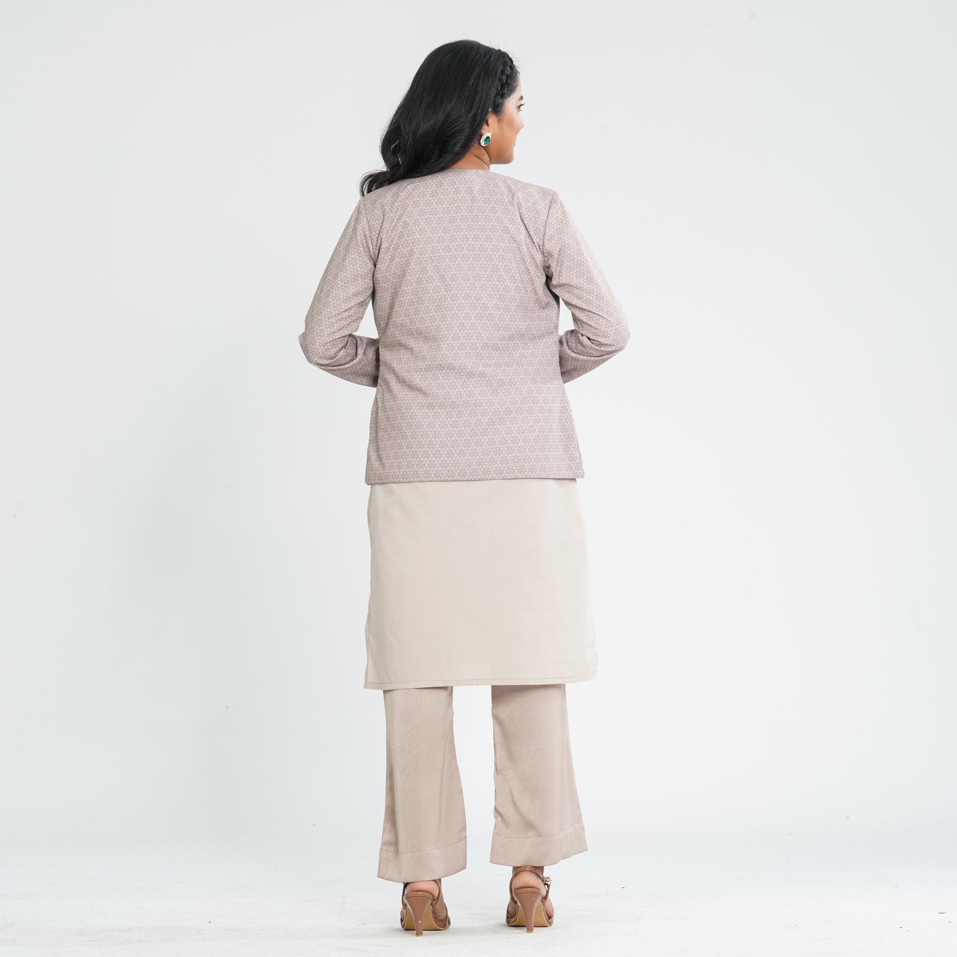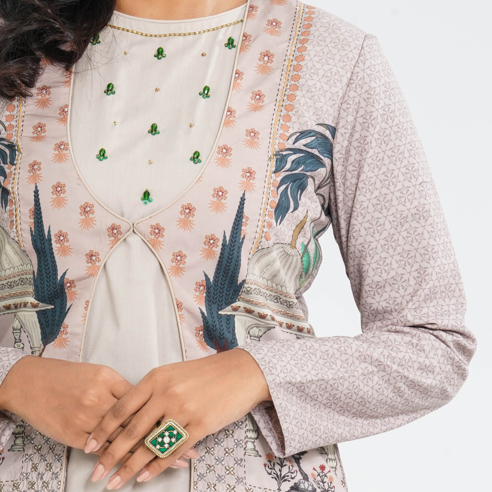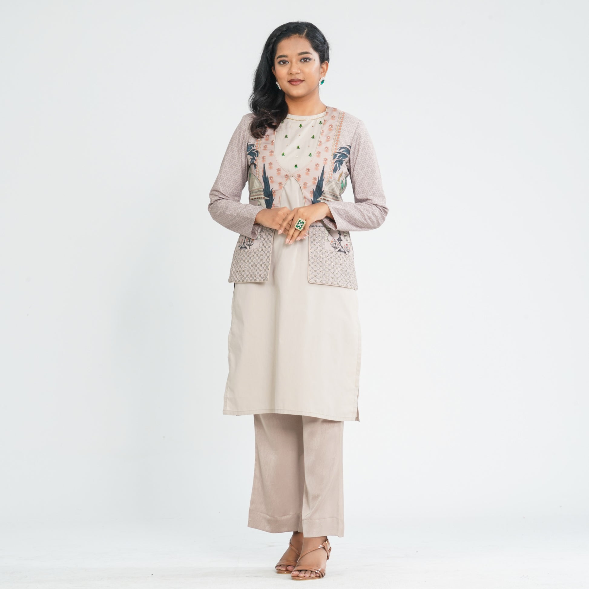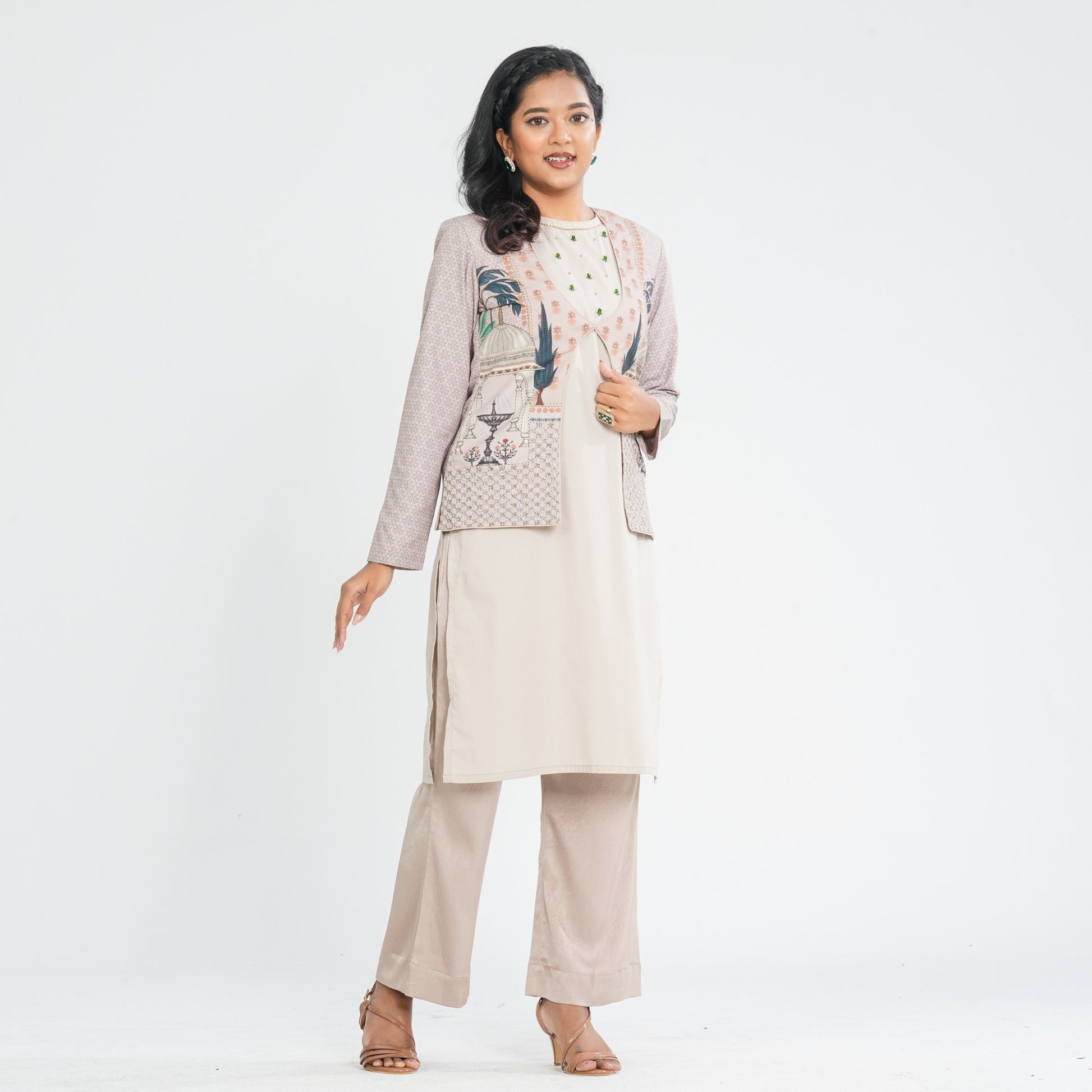 Step into effortless elegance with this women’s beige three piece ethnic set featuring a full sleeve patterned jacket with digital print and intricate zari work. The outfit includes a sleeveless silk inner and stylish wide leg pants for a graceful silhouette. Crafted with a blended cotton jacket and silk inner and pants, it offers both comfort and sophistication. Perfect for festive gatherings, cultural events, and special occasions.