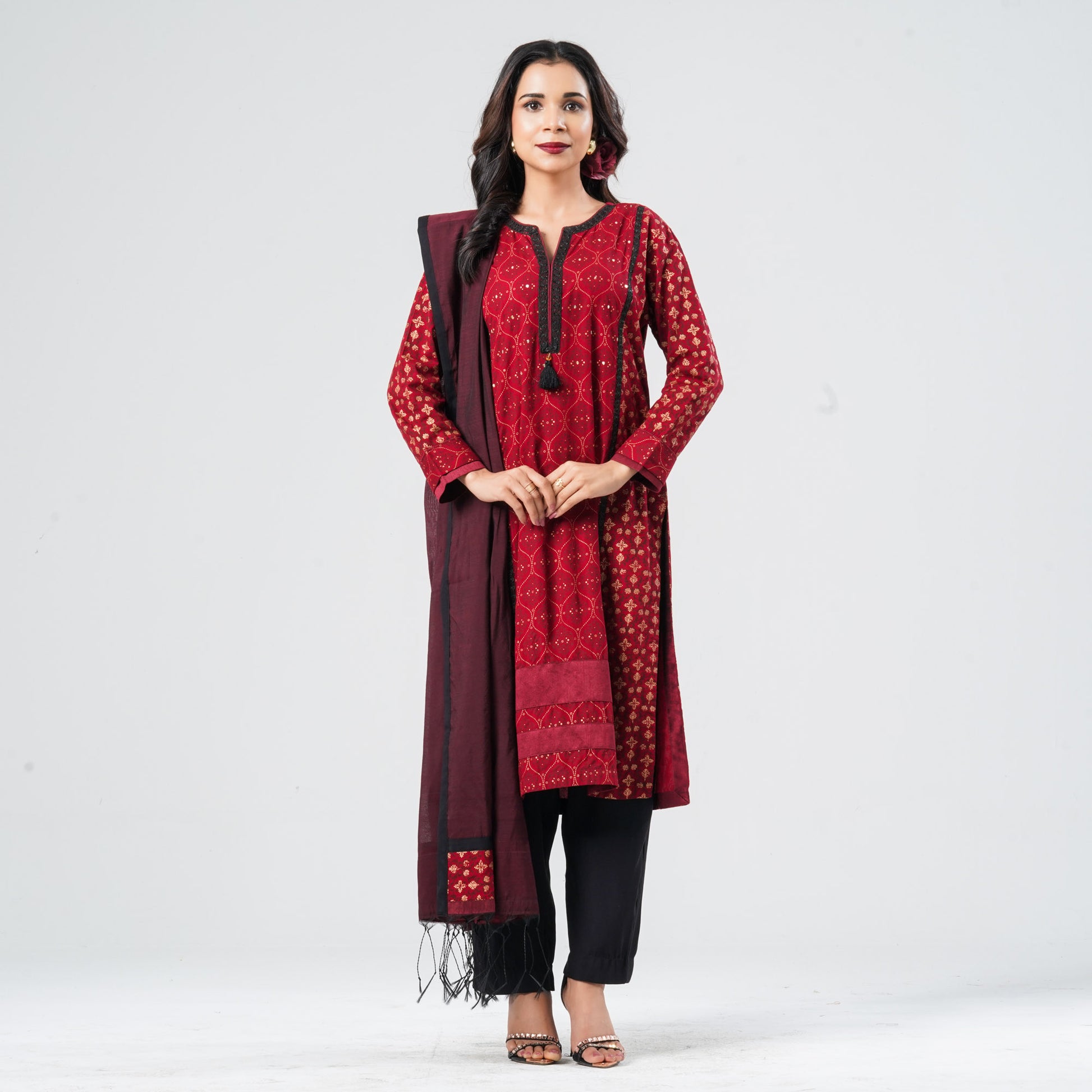 This elegant three piece set features a viscose kameez and pant, paired with a beautifully matched dupatta. The design includes screen-printed motifs enriched with delicate sequin detailing for a subtle festive shimmer. Tassar silk and viscose dupatta contrast patches add structured highlights along the borders. Finished in a classic straight-cut silhouette for comfortable, all-day wear.