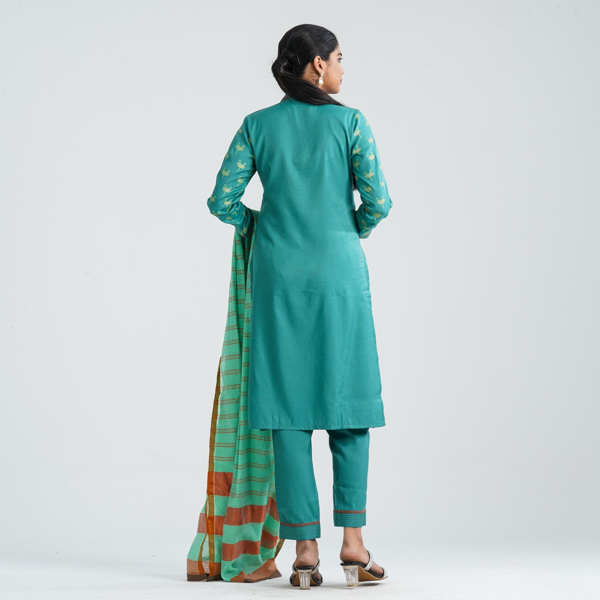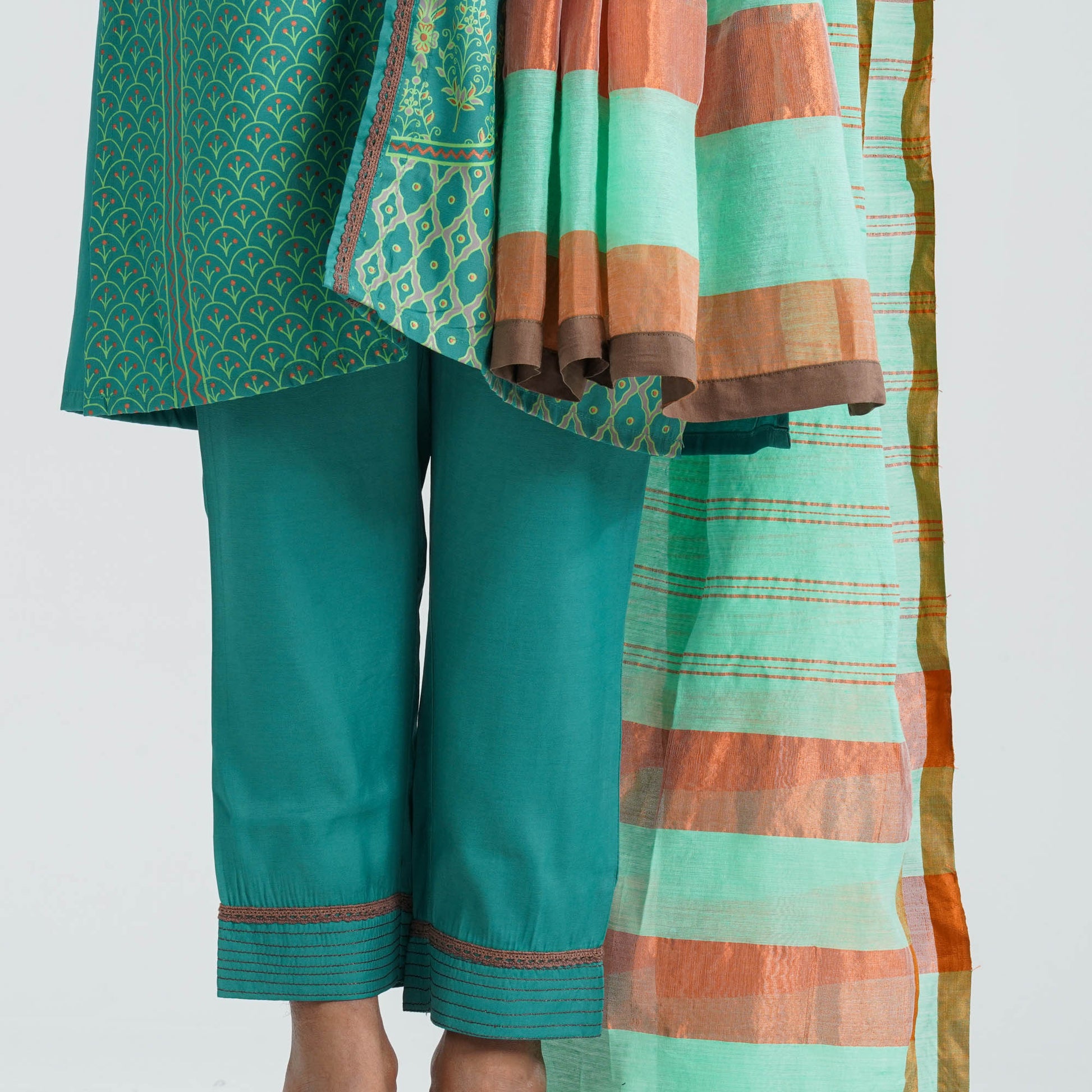 This vibrant three-piece set features a blended silk kameez and straight-cut pant, paired with a soft half-silk dupatta. Detailed with screen prints, sequin work, contrast lace, and patch borders, it brings a festive and elegant ethnic look. Perfect for celebrations, traditional gatherings, and semi-formal occasions.