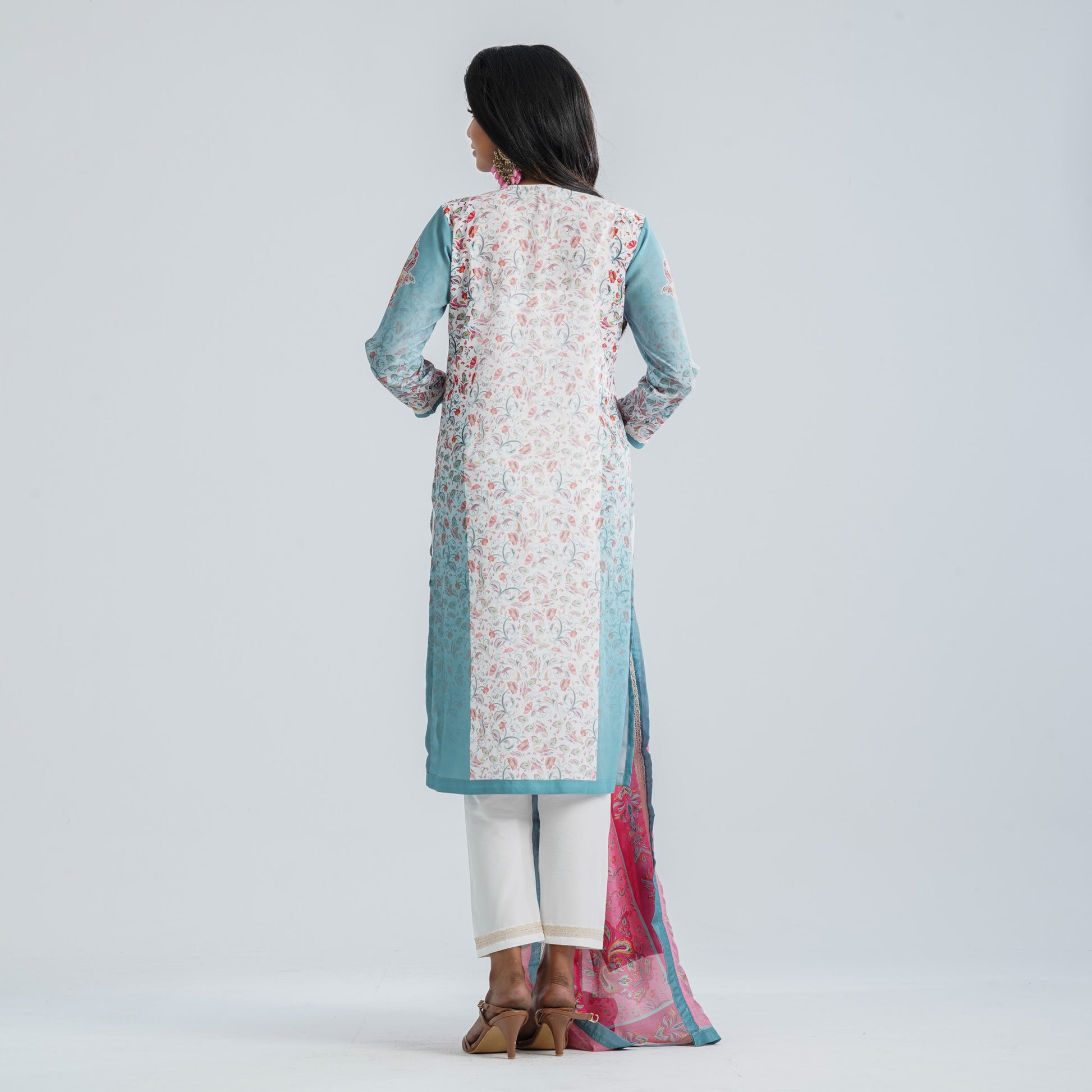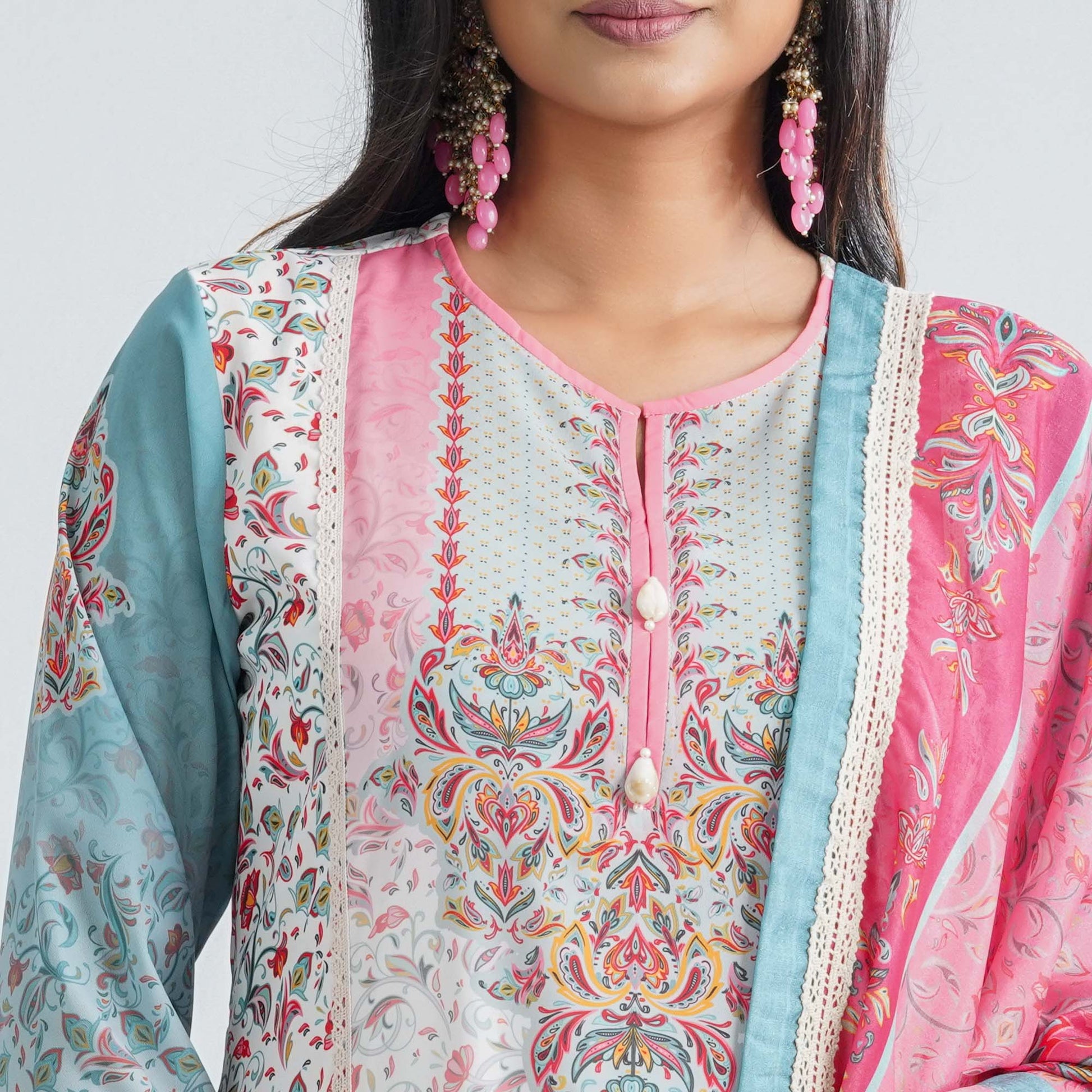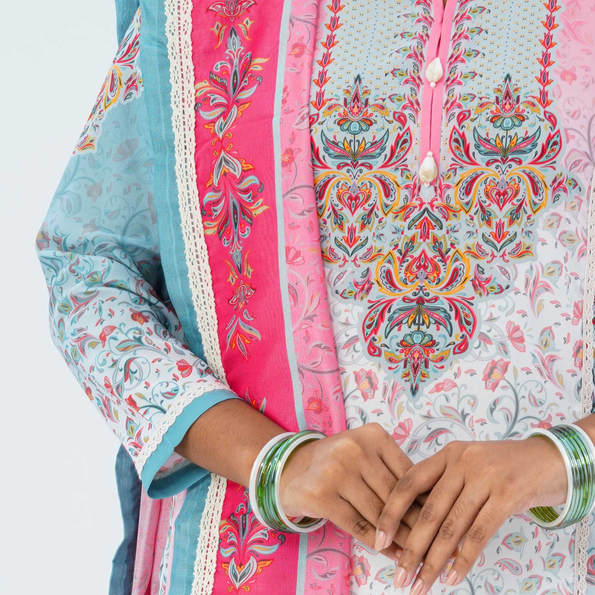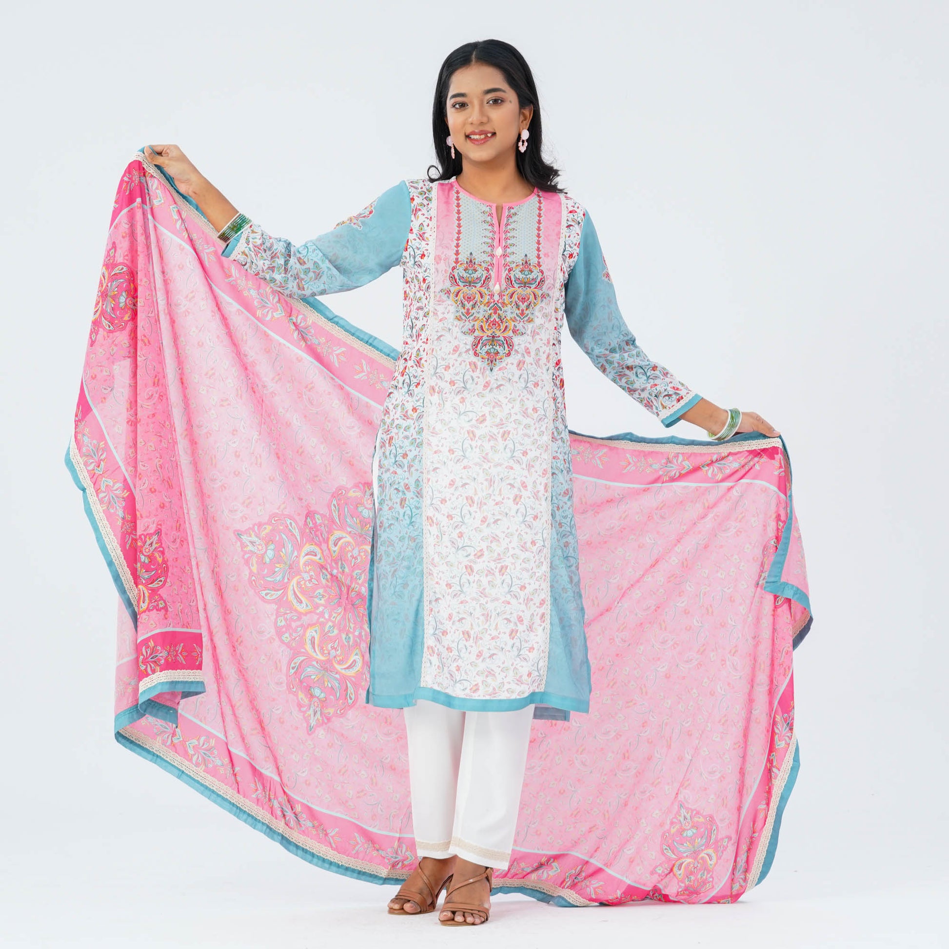 This elegant women’s three piece set features a straight-cut kameez paired with a matching pant and dupatta, crafted from blended fabric kameez & pant and soft silk georgette dupatta for a comfortable yet graceful feel. Designed in a clean, straight silhouette, it is beautifully enhanced with vibrant digital prints, along with delicate lace and shell detailing that adds a refined and festive touch perfect for Boishakh celebrations or casual ethnic wear.