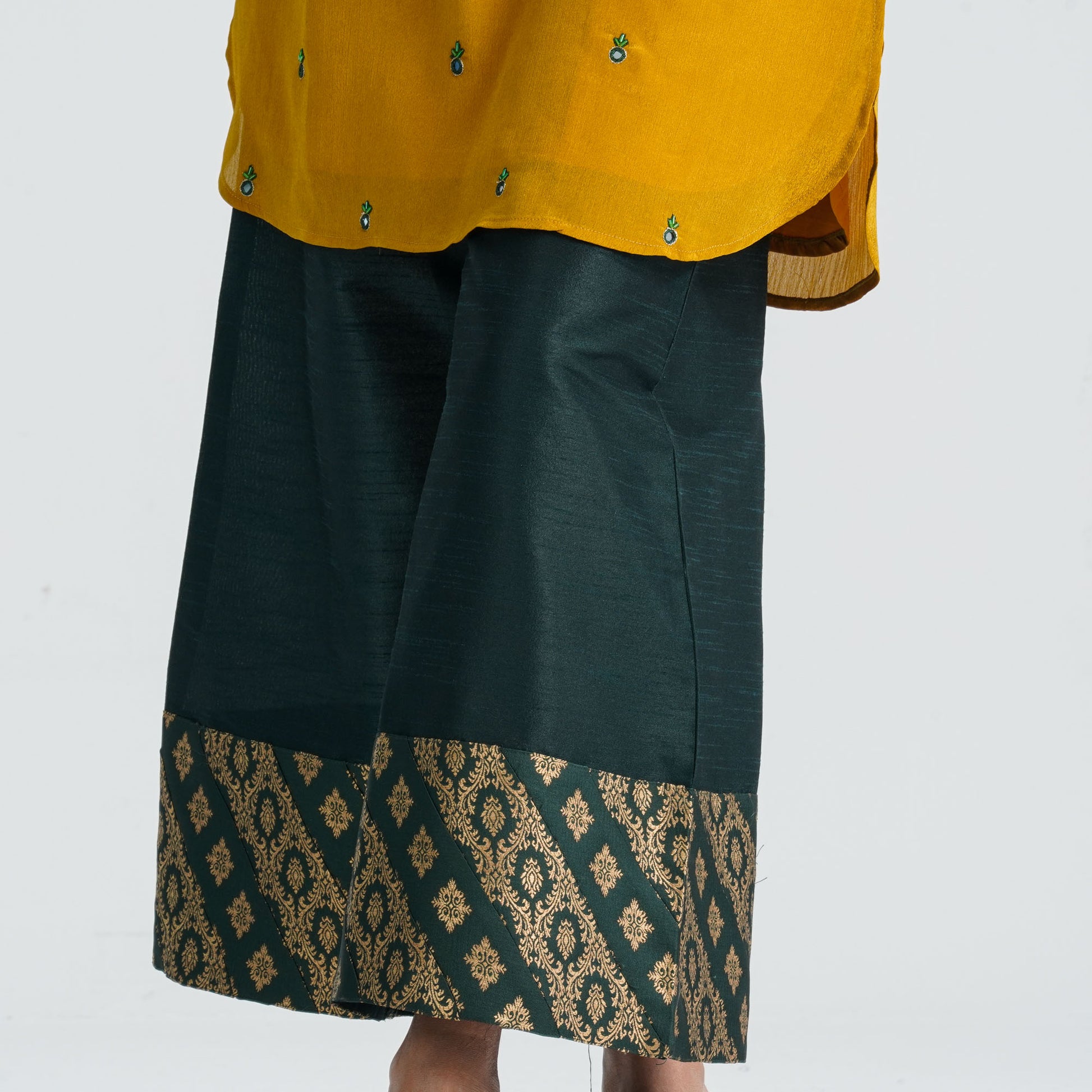 This premium three-piece ensemble includes a silk georgette straight-cut kameez with a butter-silk inner, paired with a jacquard vest, tassar silk sharara pant, and a half-silk dupatta. The set features glass embroidery, pipe work, patch borders, lace detailing, and tassels, creating an elegant festive look. Perfect for celebrations, special events, and refined ethnic styling.
