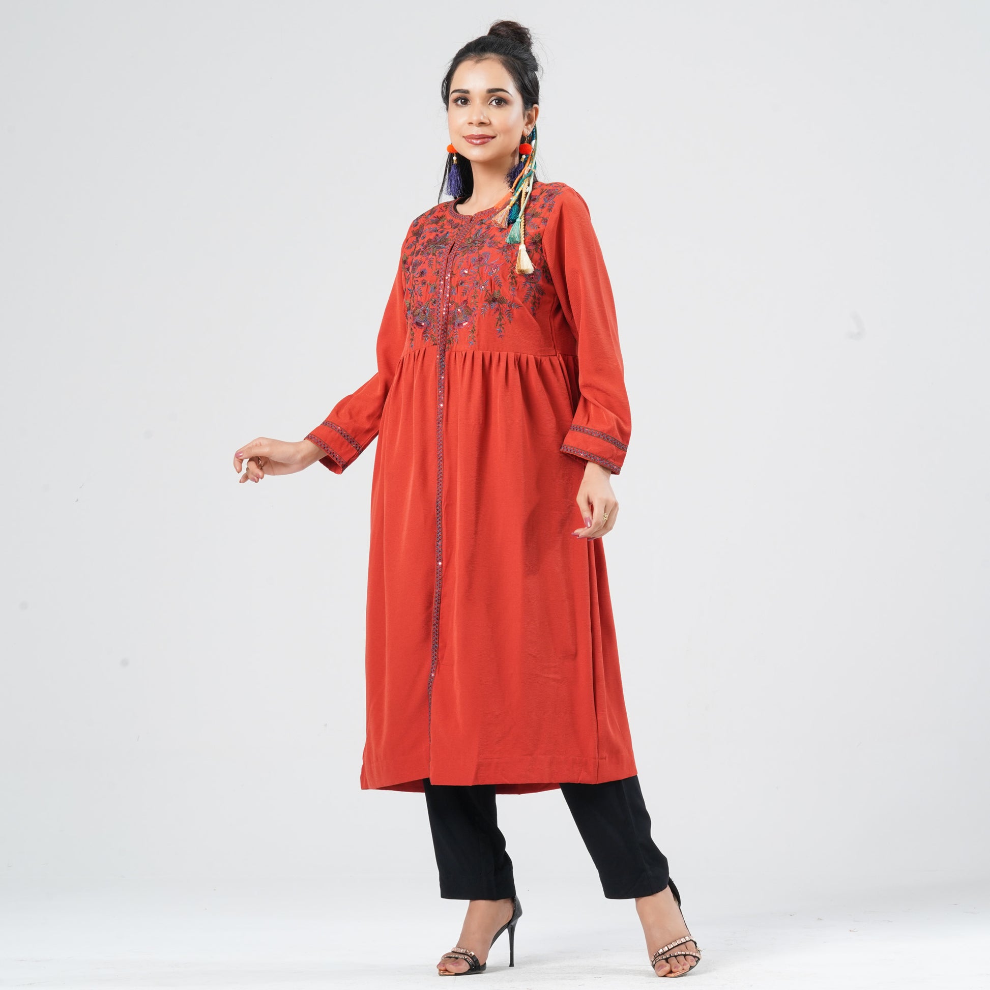 Crafted from lightweight crinkle georgette fabric, this women’s burnt orange ethnic long cardigan offers a graceful and flowy silhouette. Designed with a classic round neckline, it features beautiful sequin embroidery on the yoke and sleeve openings for a subtle festive sparkle. Pleats at the waist enhance the feminine shape while maintaining a regular comfortable fit. Perfect for festive occasions, cultural events, and elegant layered ethnic styling.