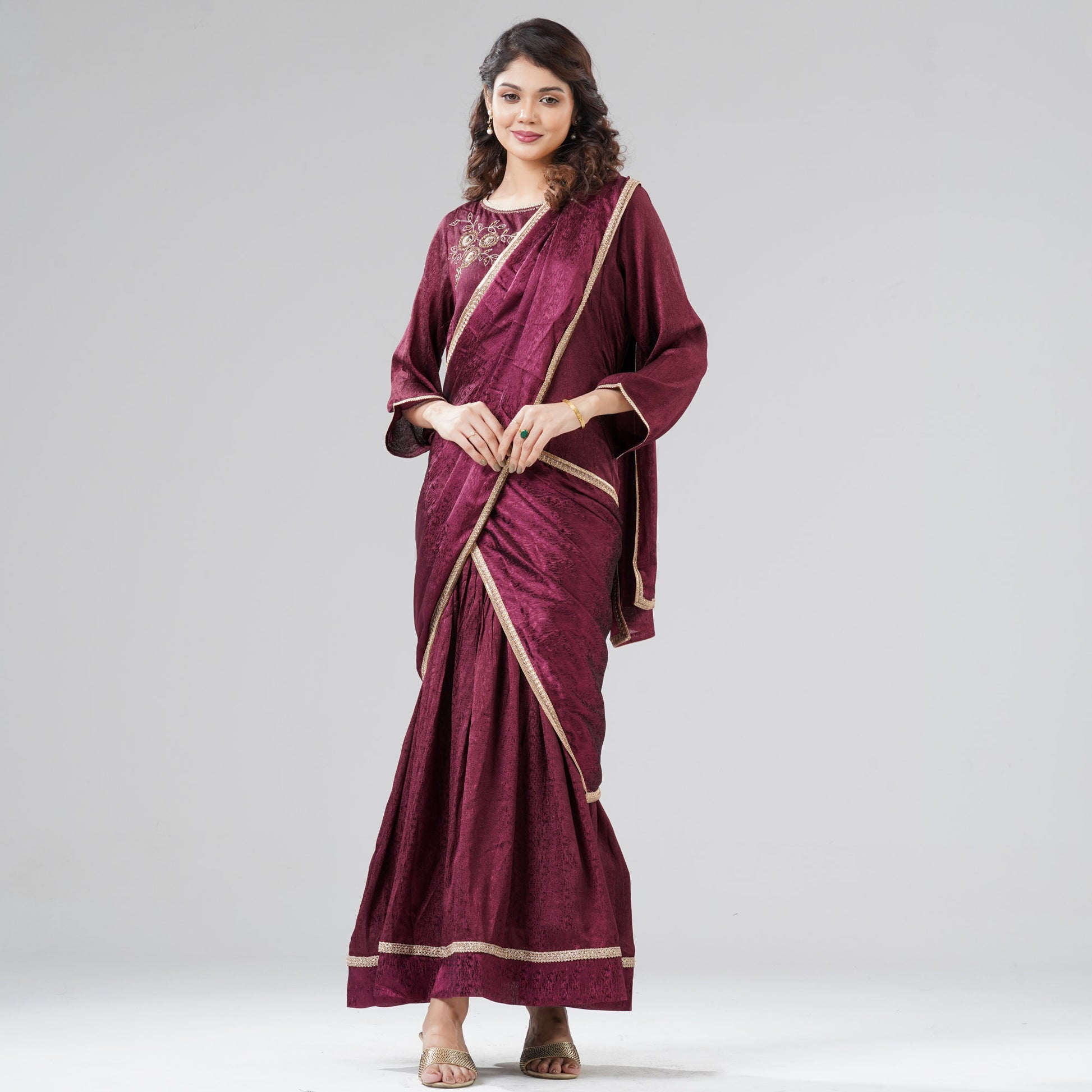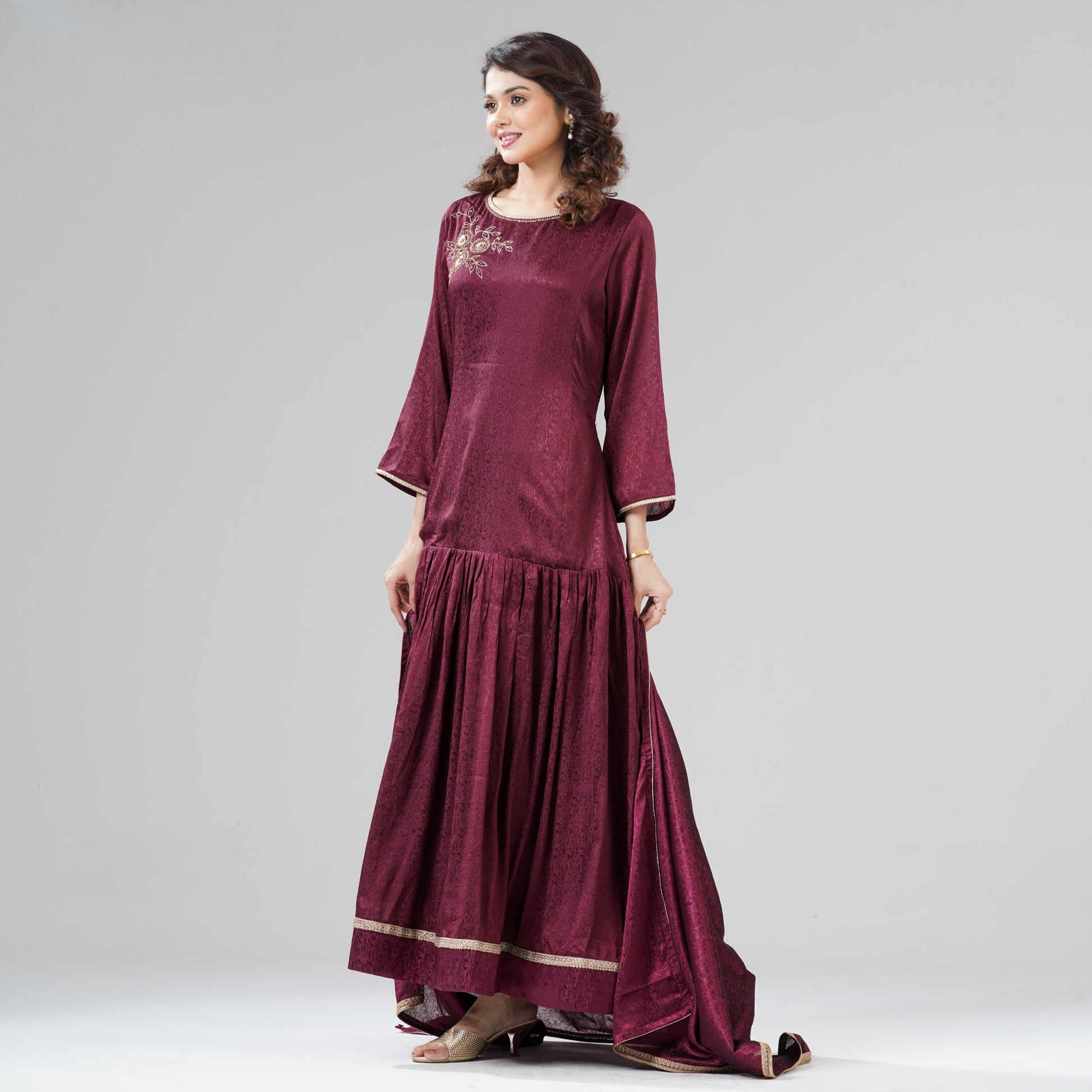 This maroon ethnic gown is crafted from soft silk georgette and designed for an elegant, flowy silhouette. It features intricate karchupi work on the chest, adding a refined traditional touch. The gown comes with a multifunctional dupatta that can be styled in various ways, making it versatile for festive events, parties, and special occasions. Perfect for women who appreciate comfort paired with timeless ethnic charm.