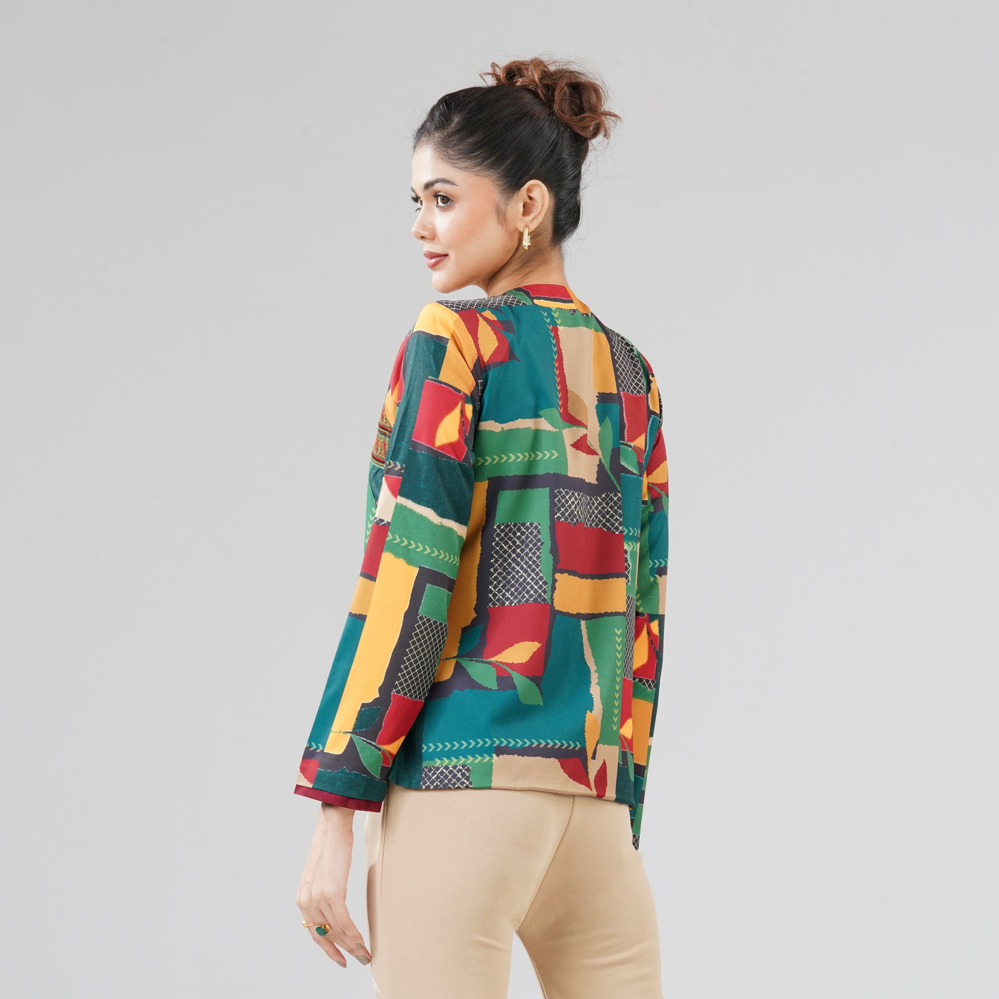 Add a festive touch to her winter wardrobe with this womens green ethnic jacket, crafted from blended cotton for comfort and style. Featuring beautiful digital prints and sequin embroidery detailing on the yoke, it offers a rich, traditional look. Perfect for pairing with ethnic or fusion outfits.