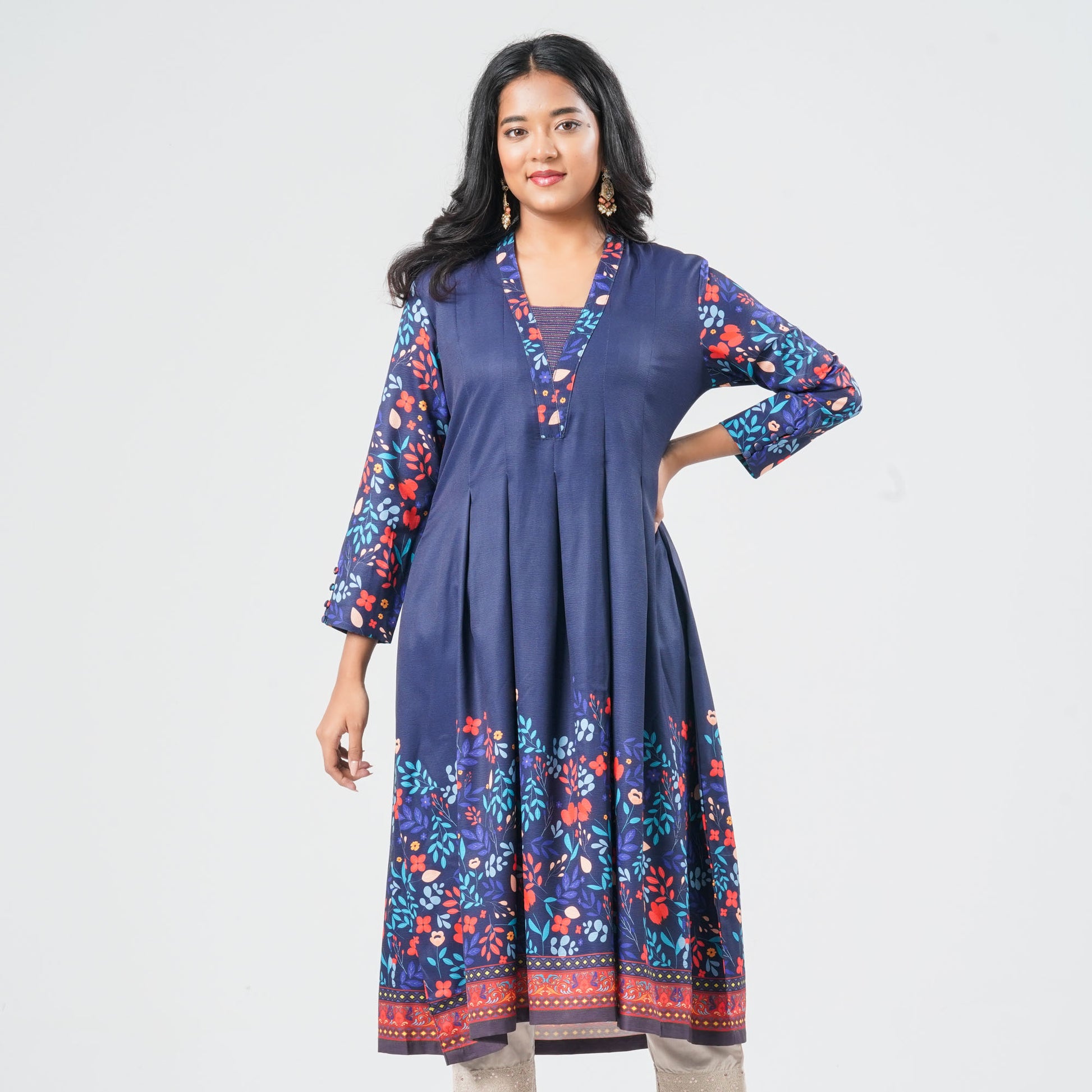 This elegant kurti is crafted from crape cotton georgette, offering a soft drape and lightweight comfort. The shawl collar and box-pleated A-line silhouette create a graceful flared shape. Detailed with vibrant digital printing and delicate run-stitch embellishments, this piece blends contemporary style with refined ethnic charm. Perfect for both casual and festive wear.