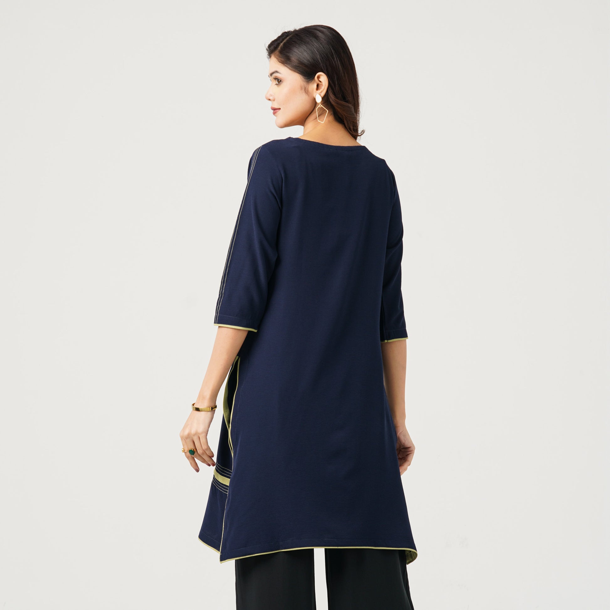This deep royal navy kurti is crafted from lightweight, breathable georgette for all-day comfort. The central panel features high-definition digital prints with traditional motifs, enhanced by contrast fabric patching and neon-style run-stitch accents in lime green. A modern ethnic piece ideal for casual and festive wear.
