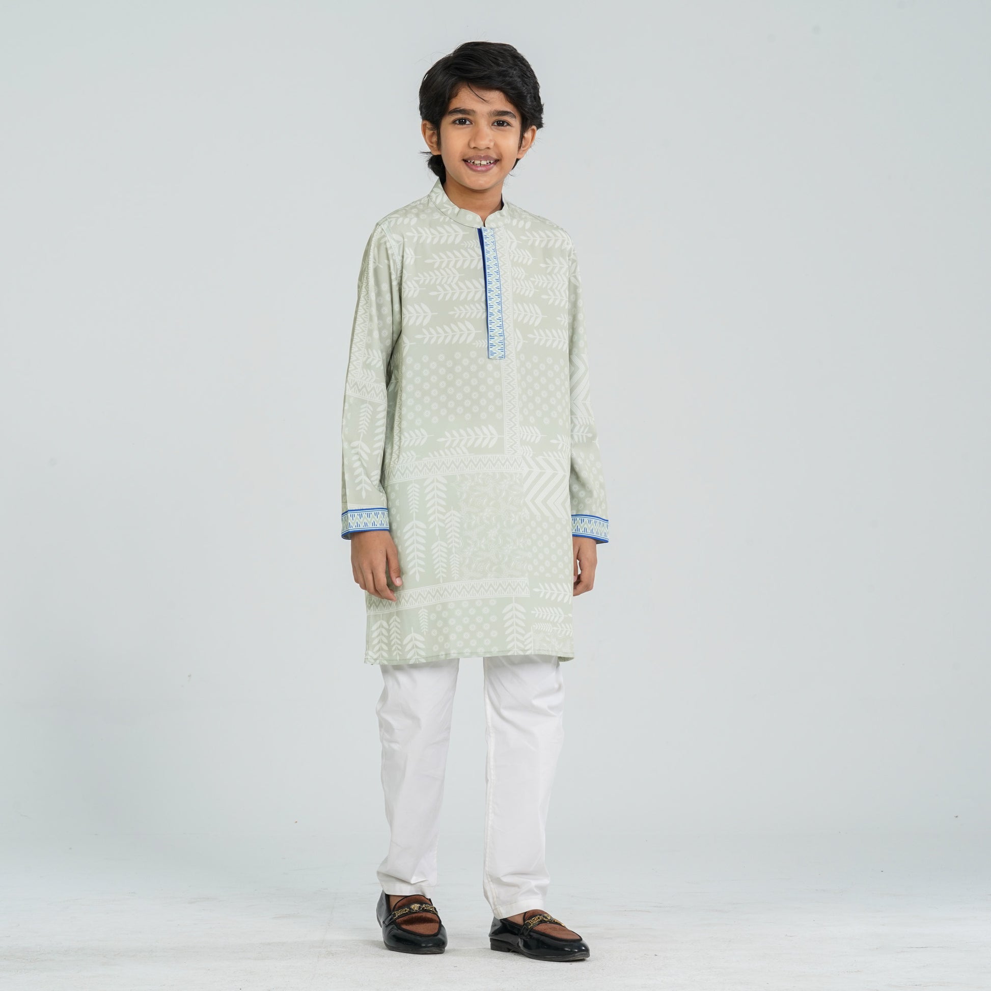 This boy's blended silk Panjabi features a clean digital printed design that creates a simple and elegant ethnic look. Styled in a regular fit, it ensures comfortable wear while adding a subtle refined touch, making it suitable for festive and traditional occasions.
