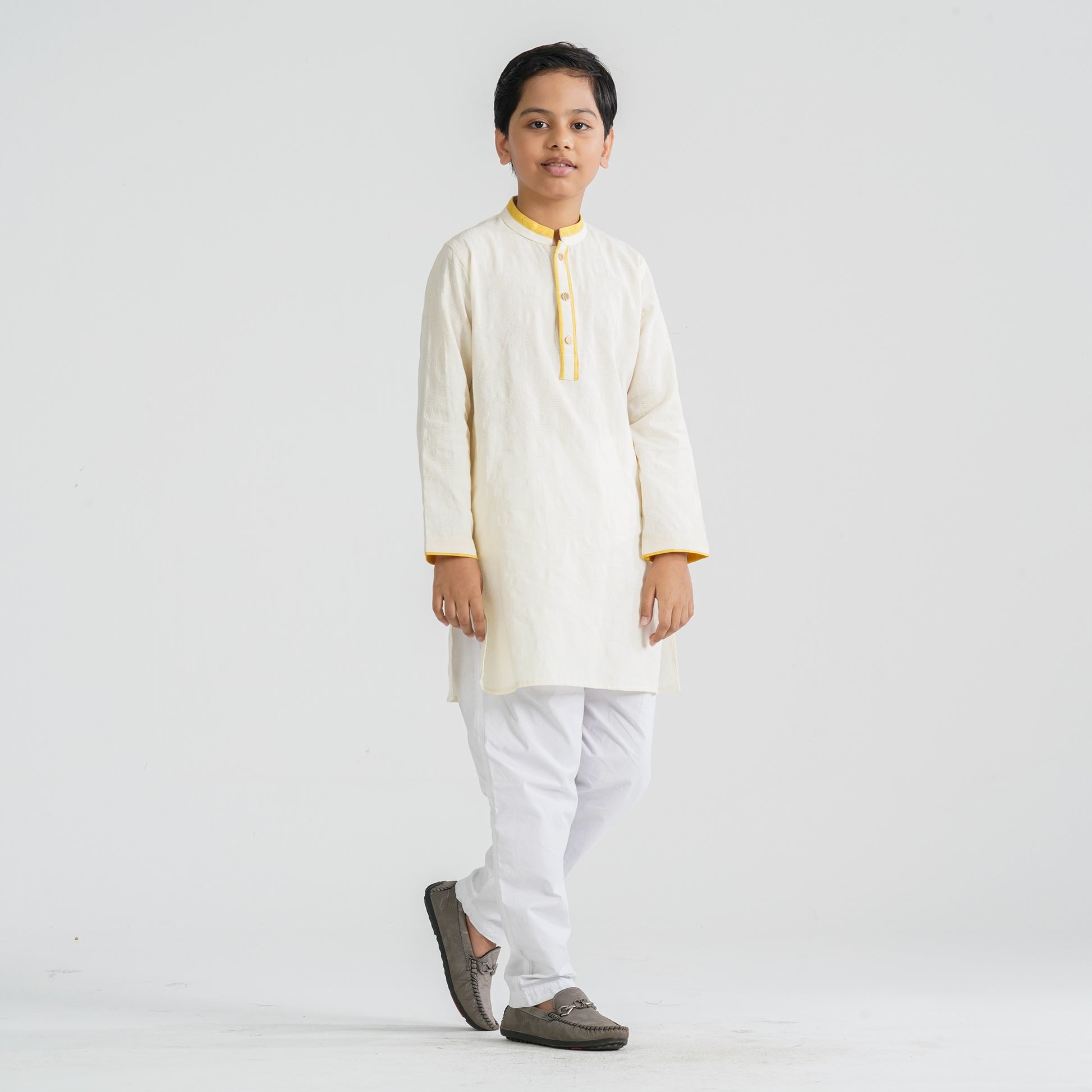 This boy’s off white Panjabi offers a clean and elegant ethnic look perfect for special occasions. Designed with a classic silhouette, it delivers a smart and timeless appeal. The comfortable fabric ensures ease of movement and all-day wearability. Ideal for Eid, weddings, and cultural celebrations.
