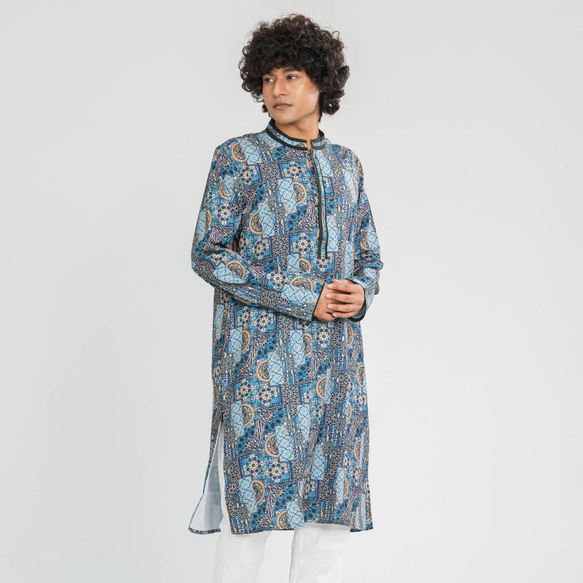 Crafted from soft blended fabric, this navy Panjabi features printed fabric with contrast detailing for a bold, maximal ethnic look. Designed to stand out with vibrant accents while maintaining a traditional silhouette. Perfect for festive occasions, celebrations, and statement ethnic styling.