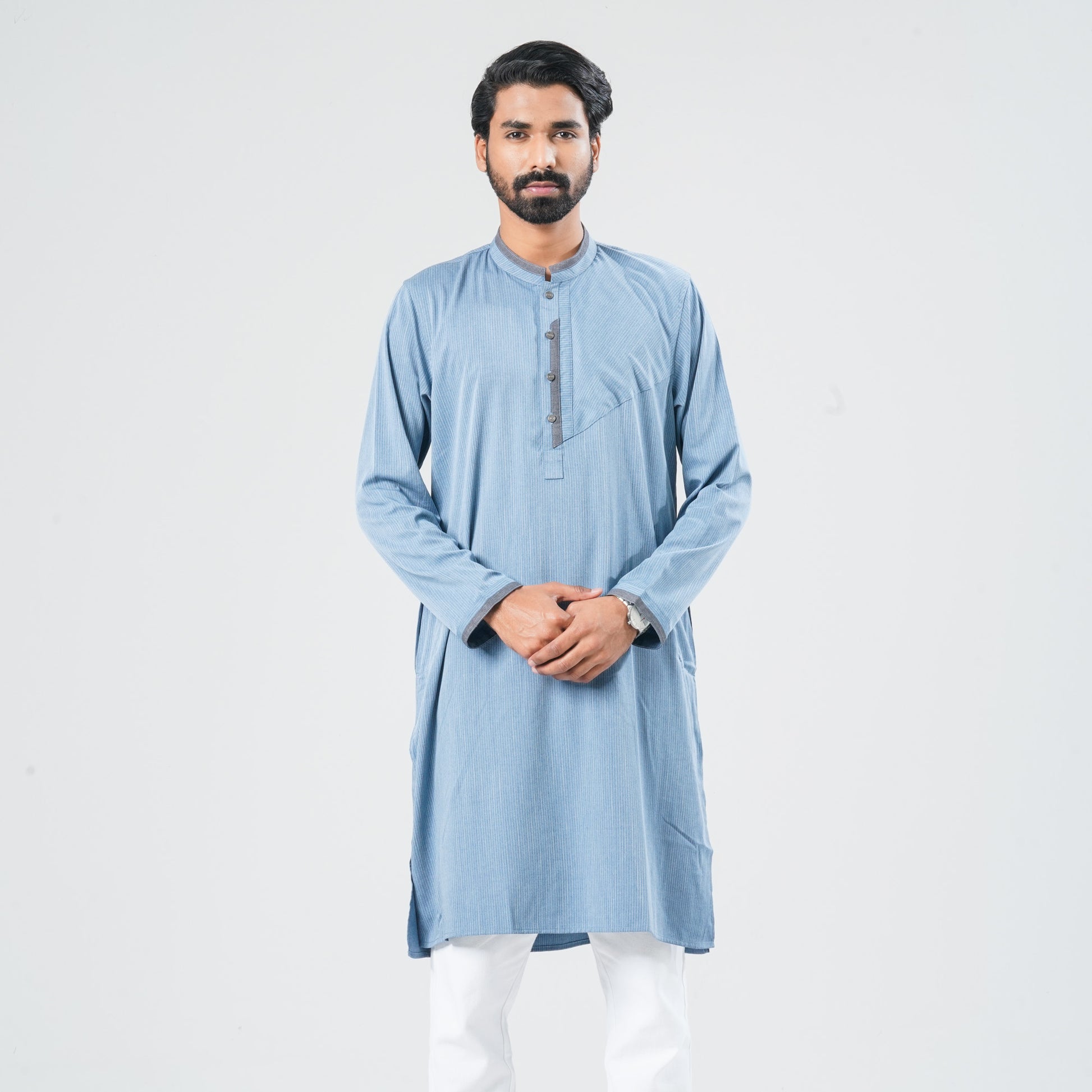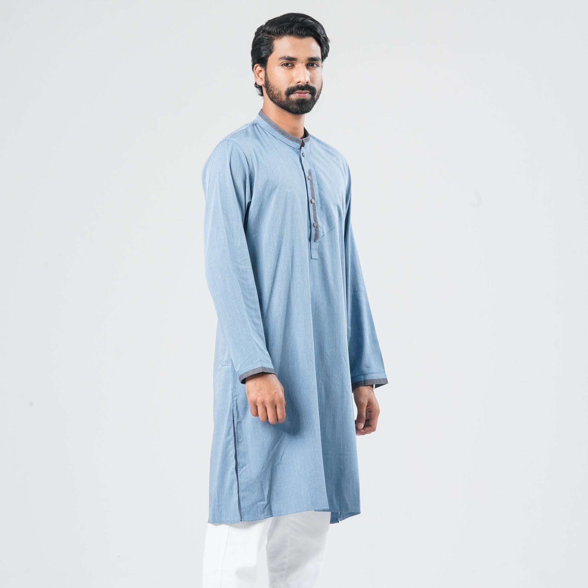Crafted from soft blended fabric, this indigo Panjabi features subtle striped fabric accents with minimal detailing for a clean, understated ethnic look. Designed with a simple yet refined silhouette, it’s perfect for semi-formal occasions, cultural events, and everyday ethnic wear. Comfortable and versatile for modern styling.