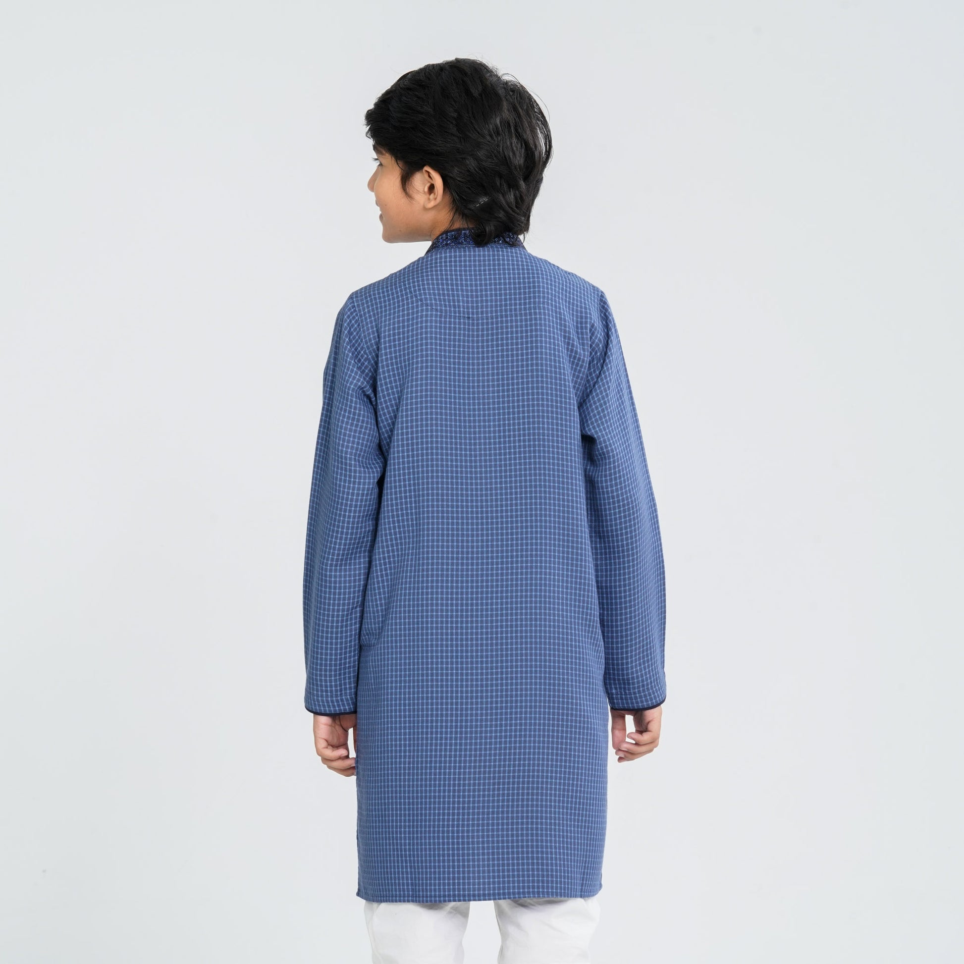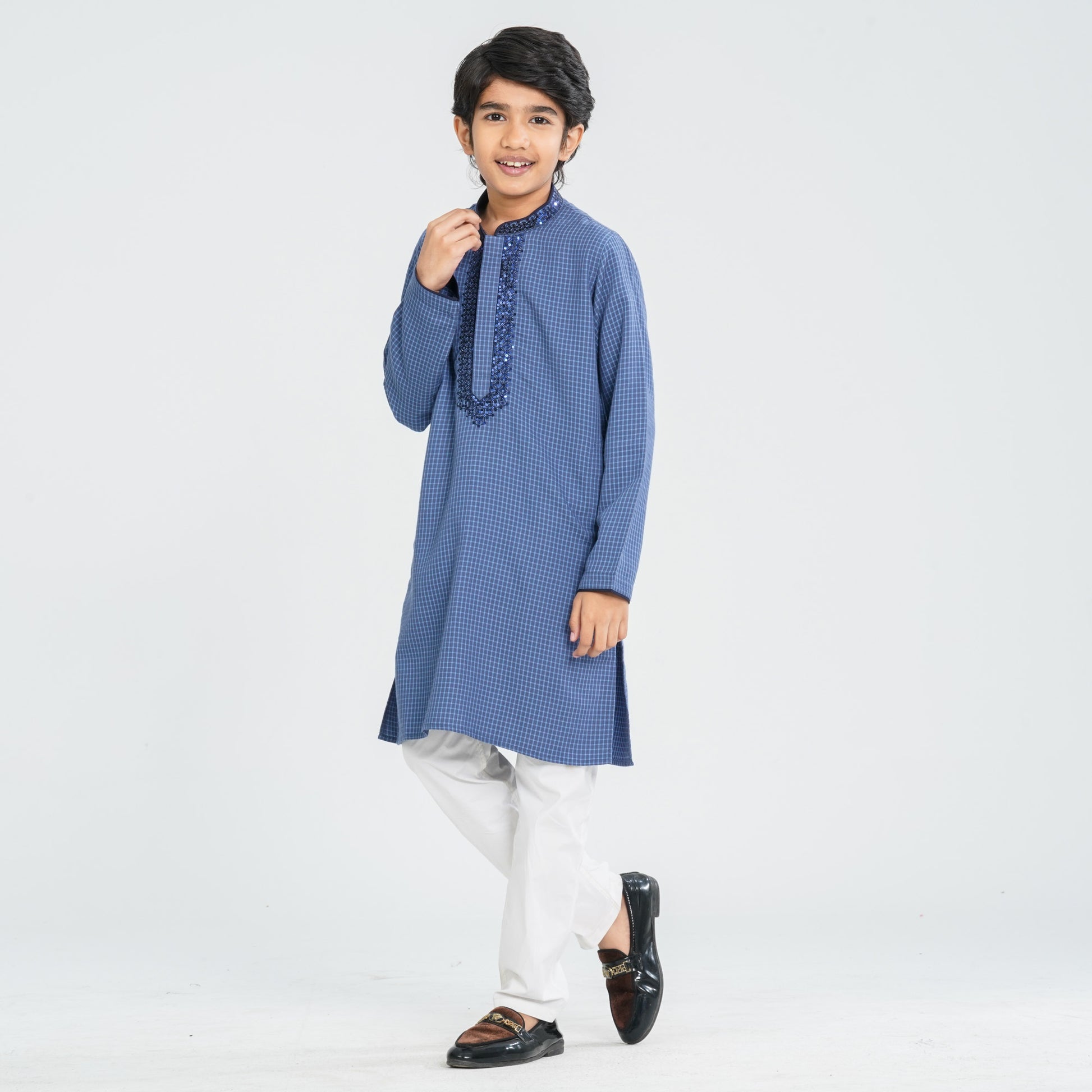 Made from comfortable cotton, this Panjabi features floral-inspired embroidery on the collar and yoke for a subtle ethnic touch. Designed with a minimal, clean look that balances simplicity and tradition. The blue shade adds freshness, making it ideal for casual outings, festive events, and family occasions.