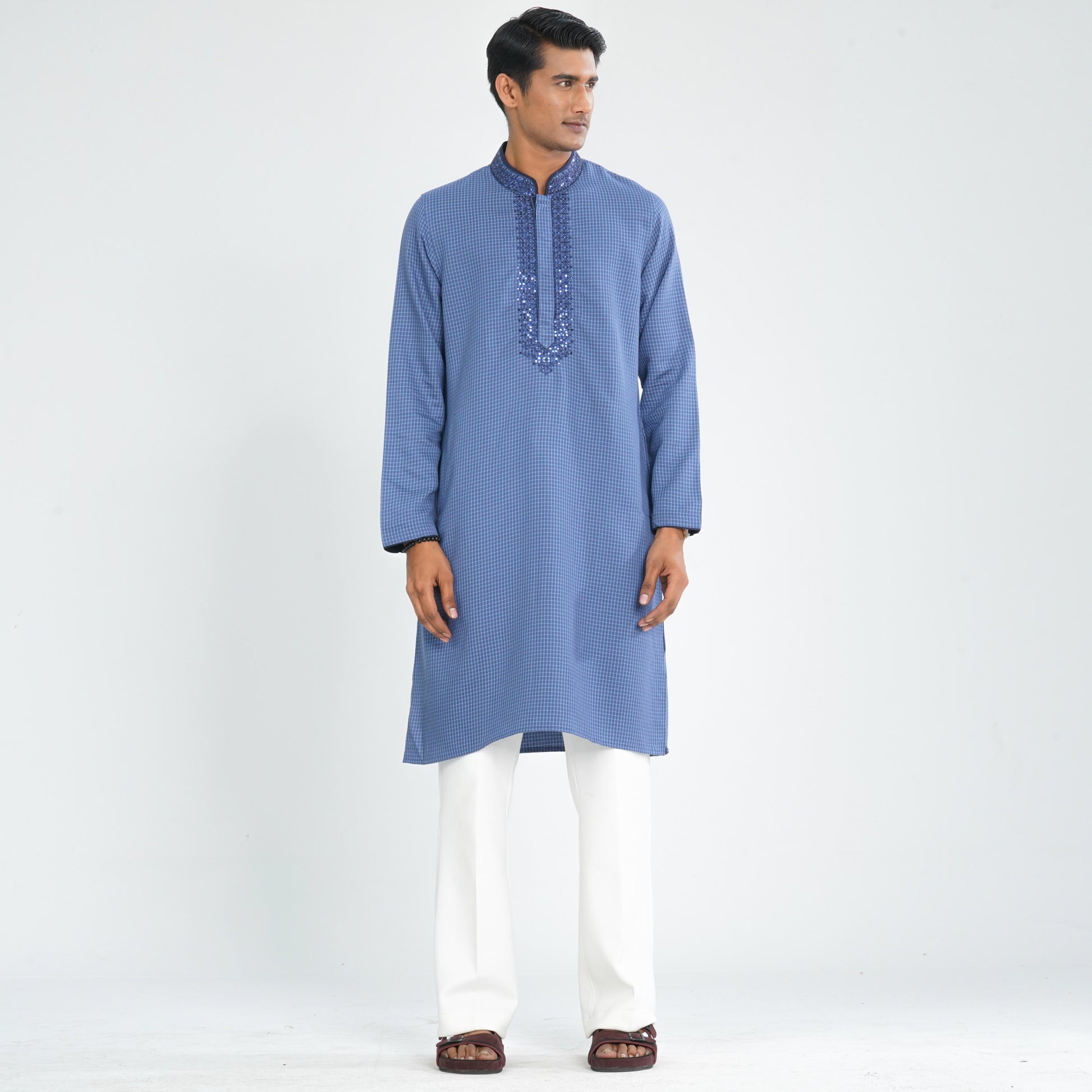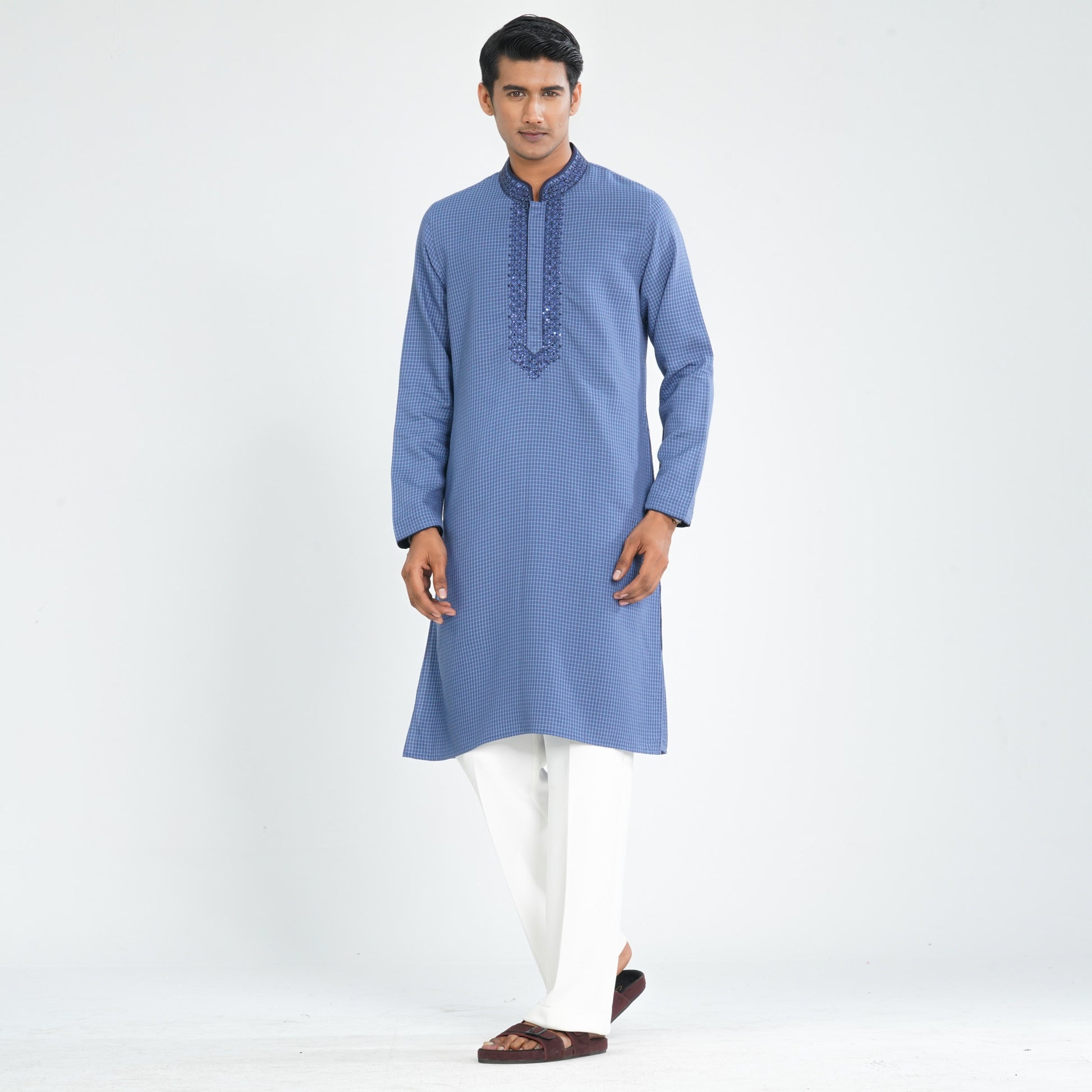 Made from soft cotton fabric, this navy panjabi features delicate sequin embroidery on the yoke for a festive ethnic touch. Designed with a clean and classic silhouette, it offers a refined look perfect for cultural events, celebrations, and traditional occasions. Comfortable and stylish for all-day wear.