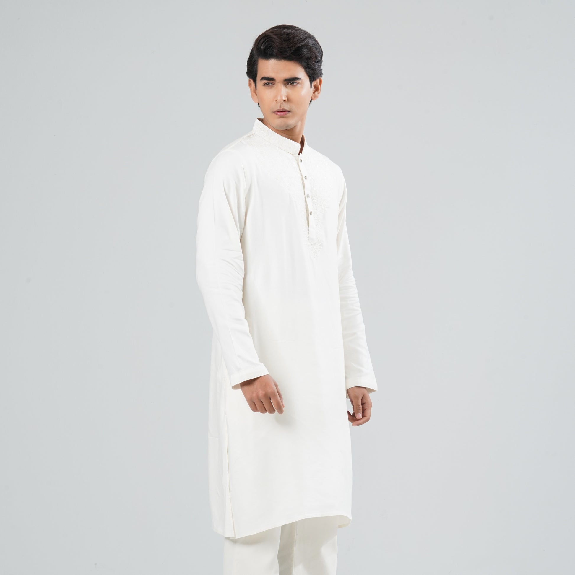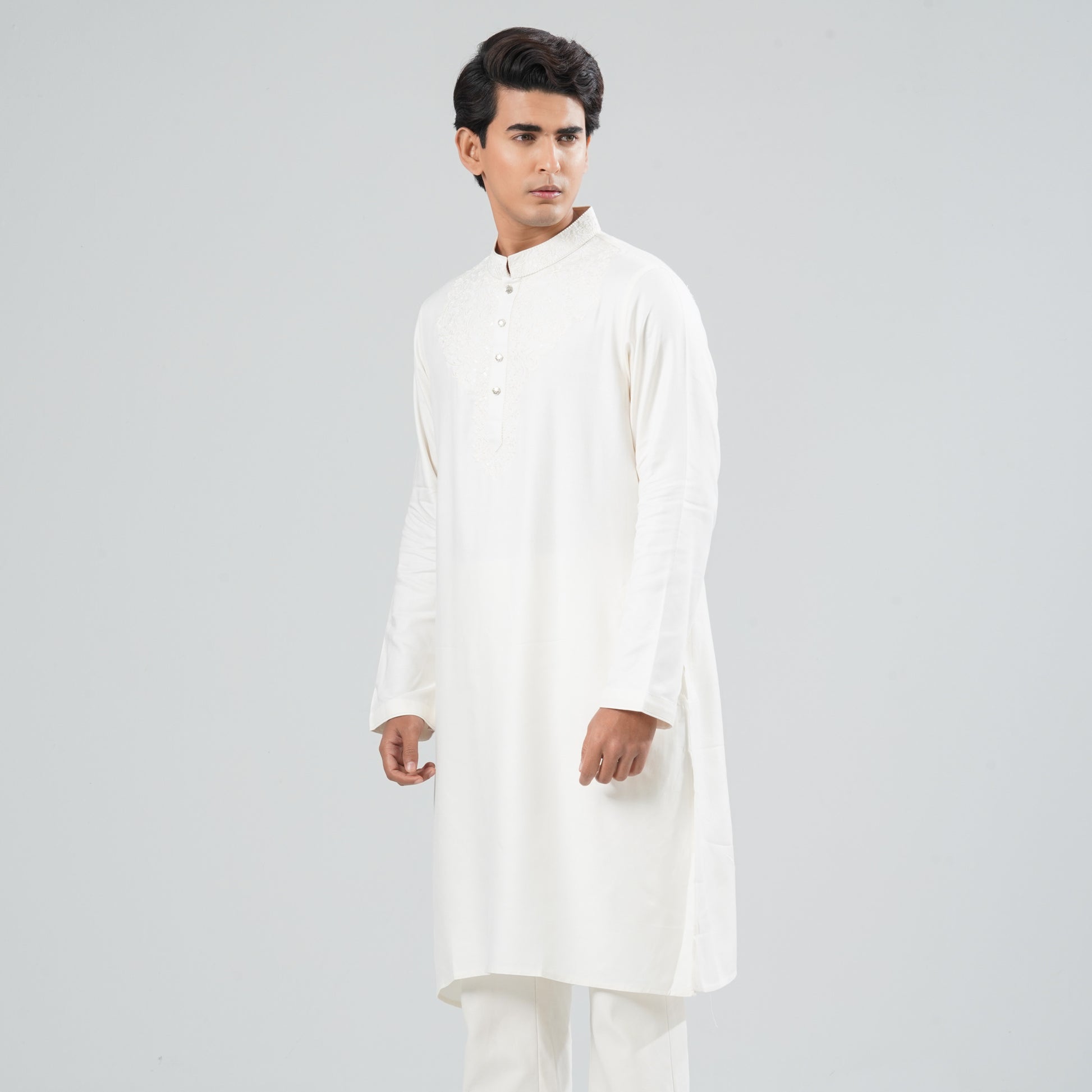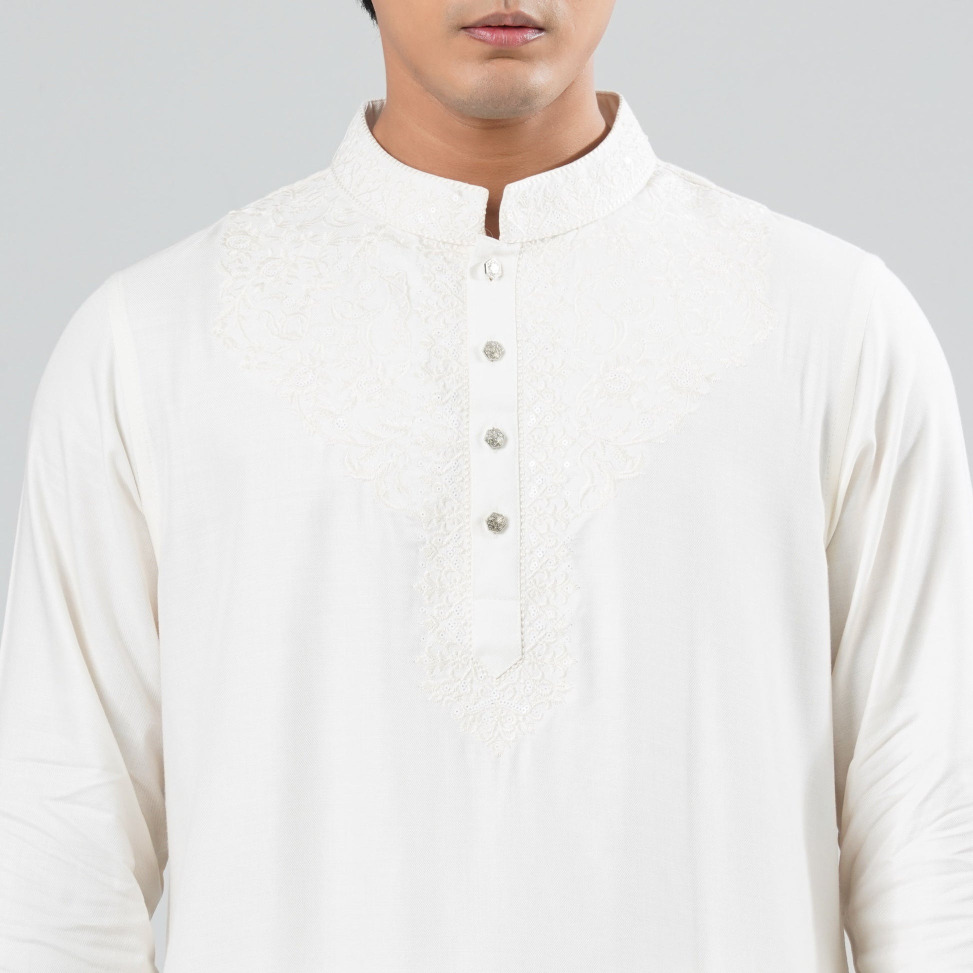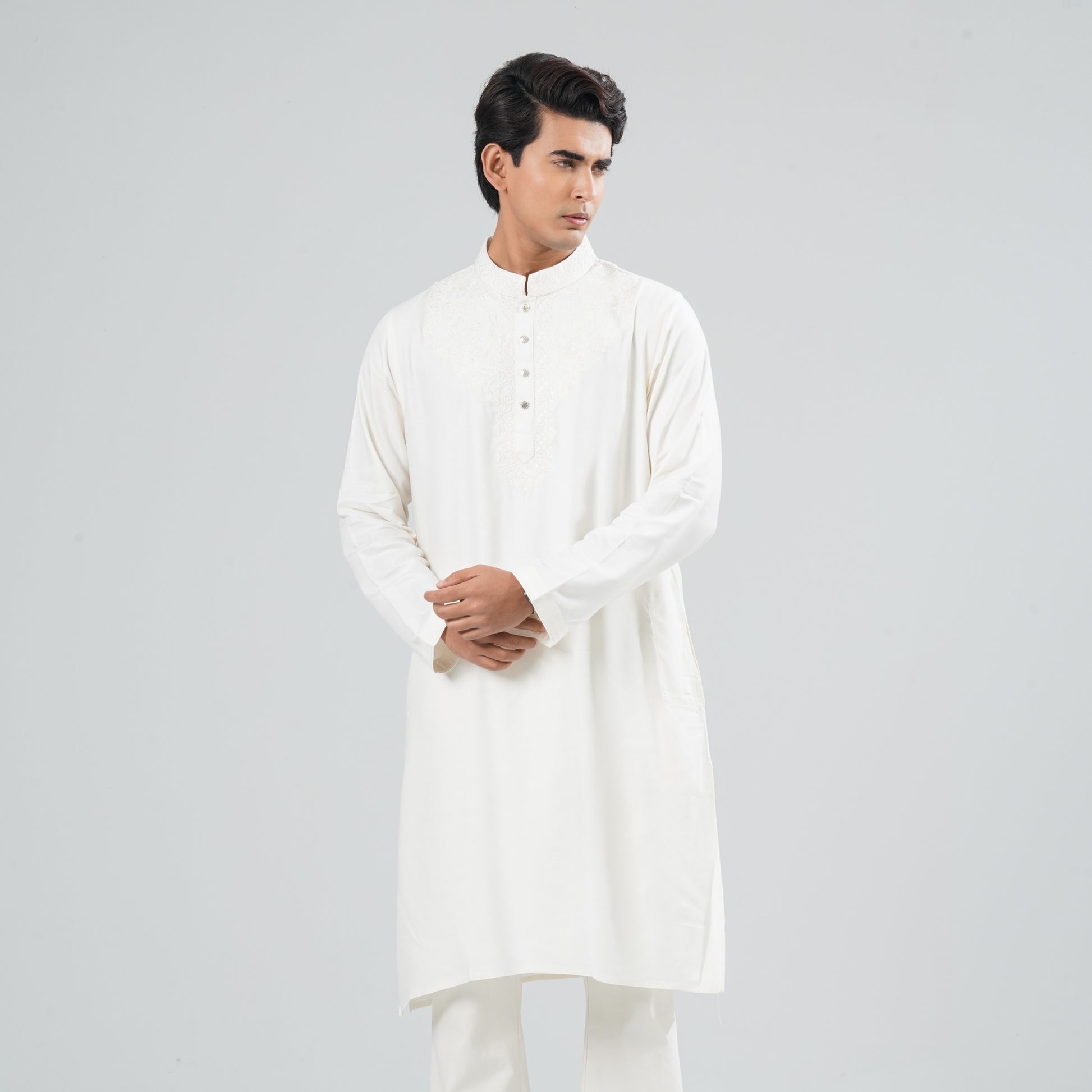 Crafted from soft blended fabric, this cream Panjabi features elegant embroidery on the chest for a subtle festive touch. Designed with a clean ethnic silhouette, it delivers a refined look perfect for celebrations and cultural occasions. Comfortable and stylish, ideal for semi-formal and traditional wear.