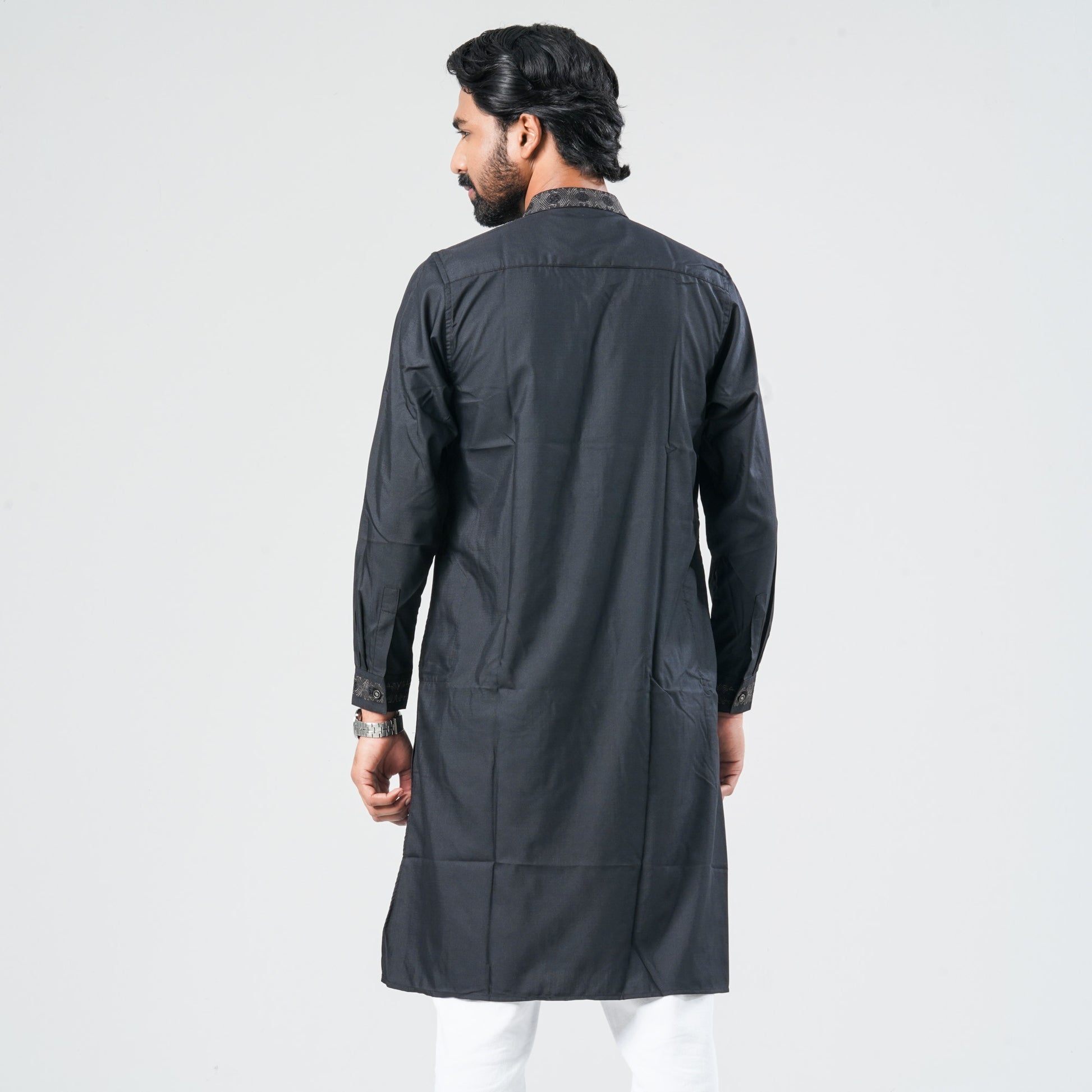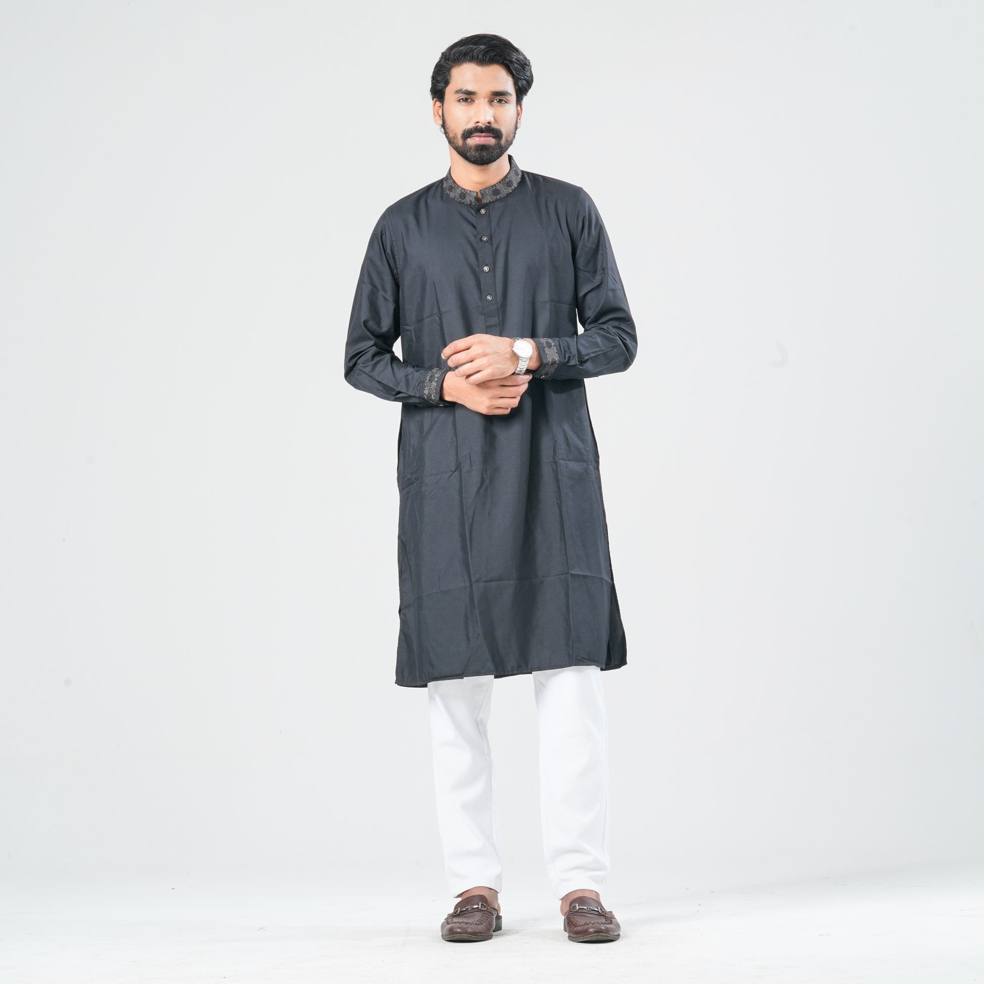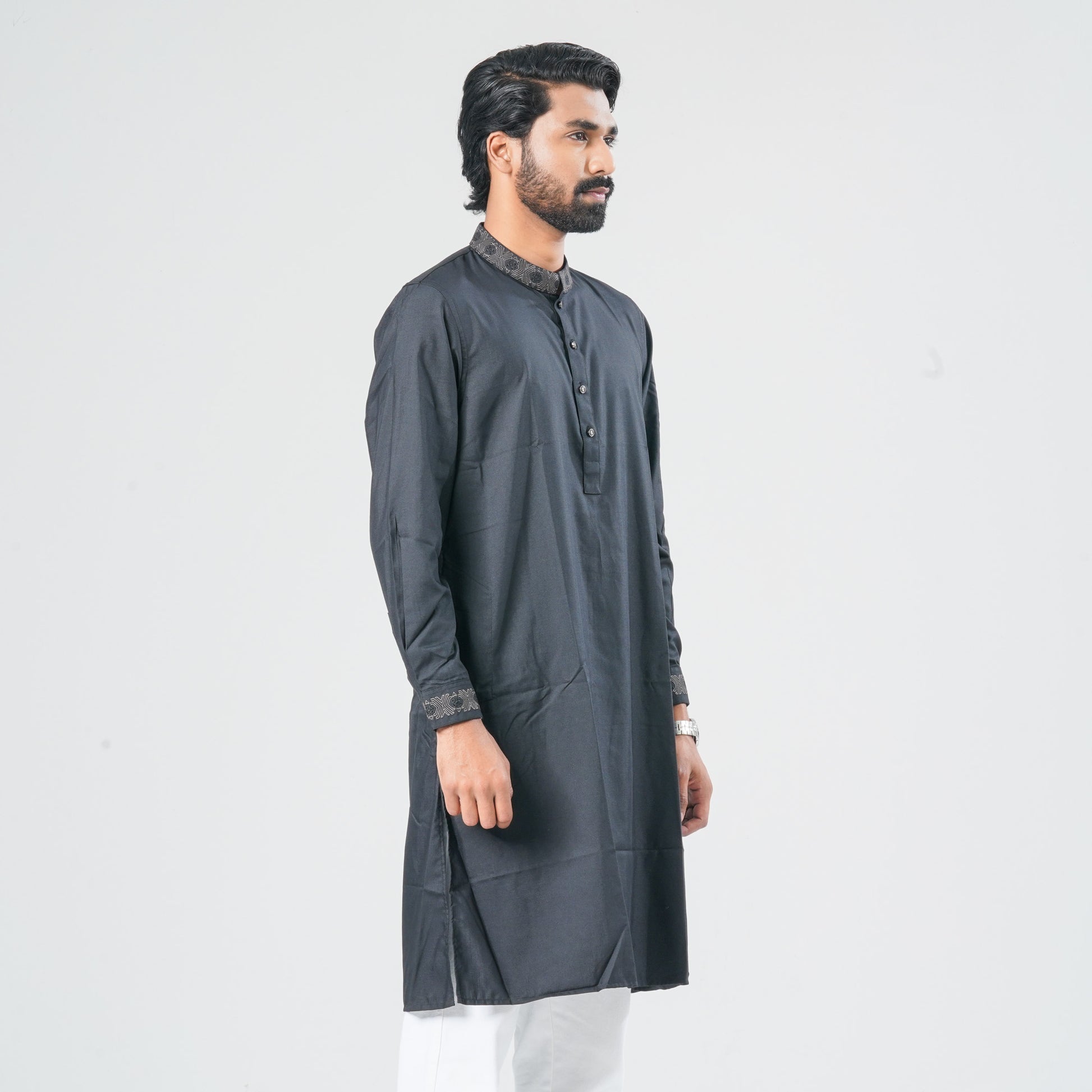 This men’s blended cotton panjabi features geometric motif-inspired embroidery on the collar and cuff, enhanced with decorative metal buttons for a refined ethnic look. Designed in a regular fit, it offers comfortable wear while adding a stylish and elegant touch for festive and cultural occasions.